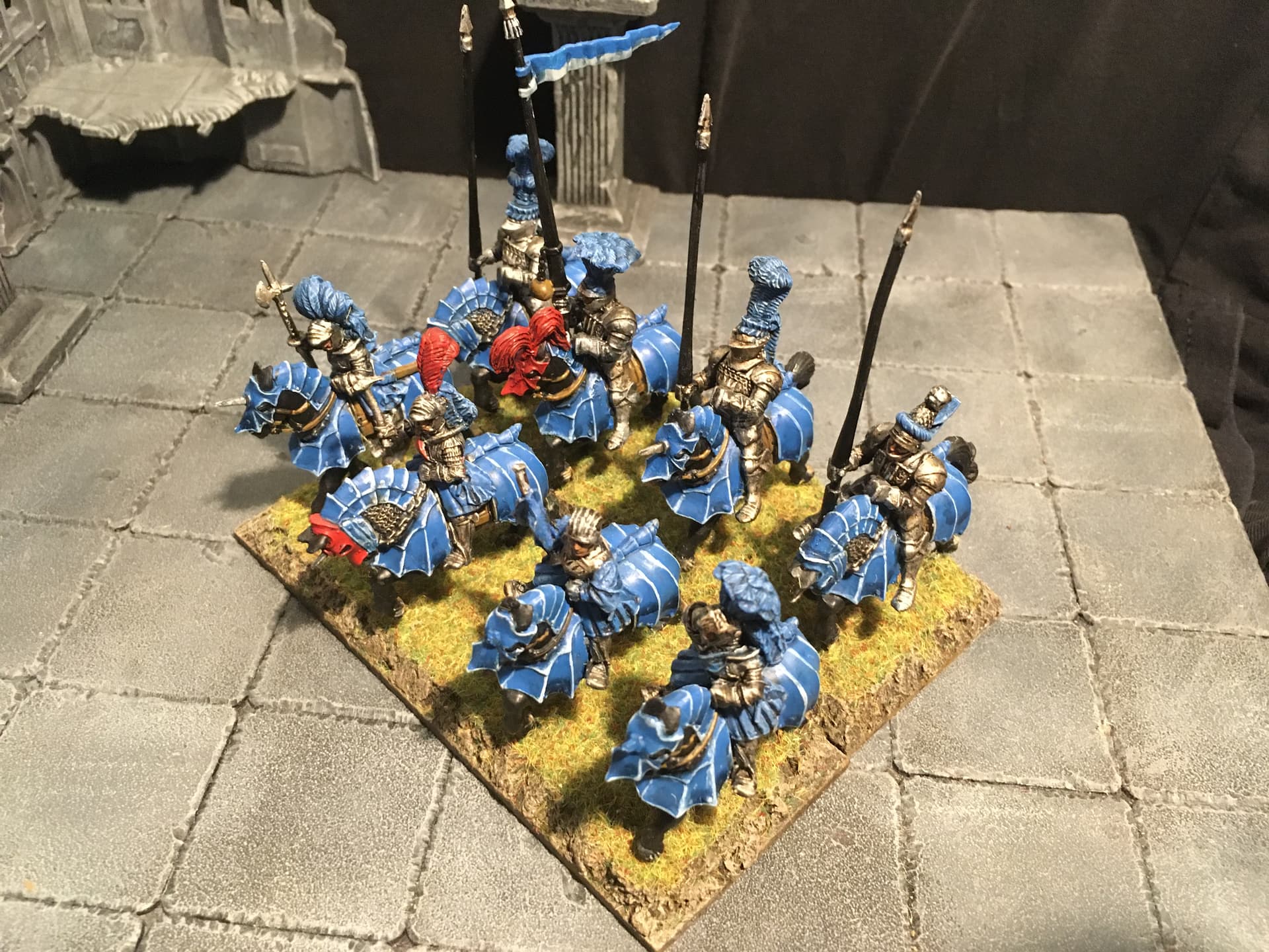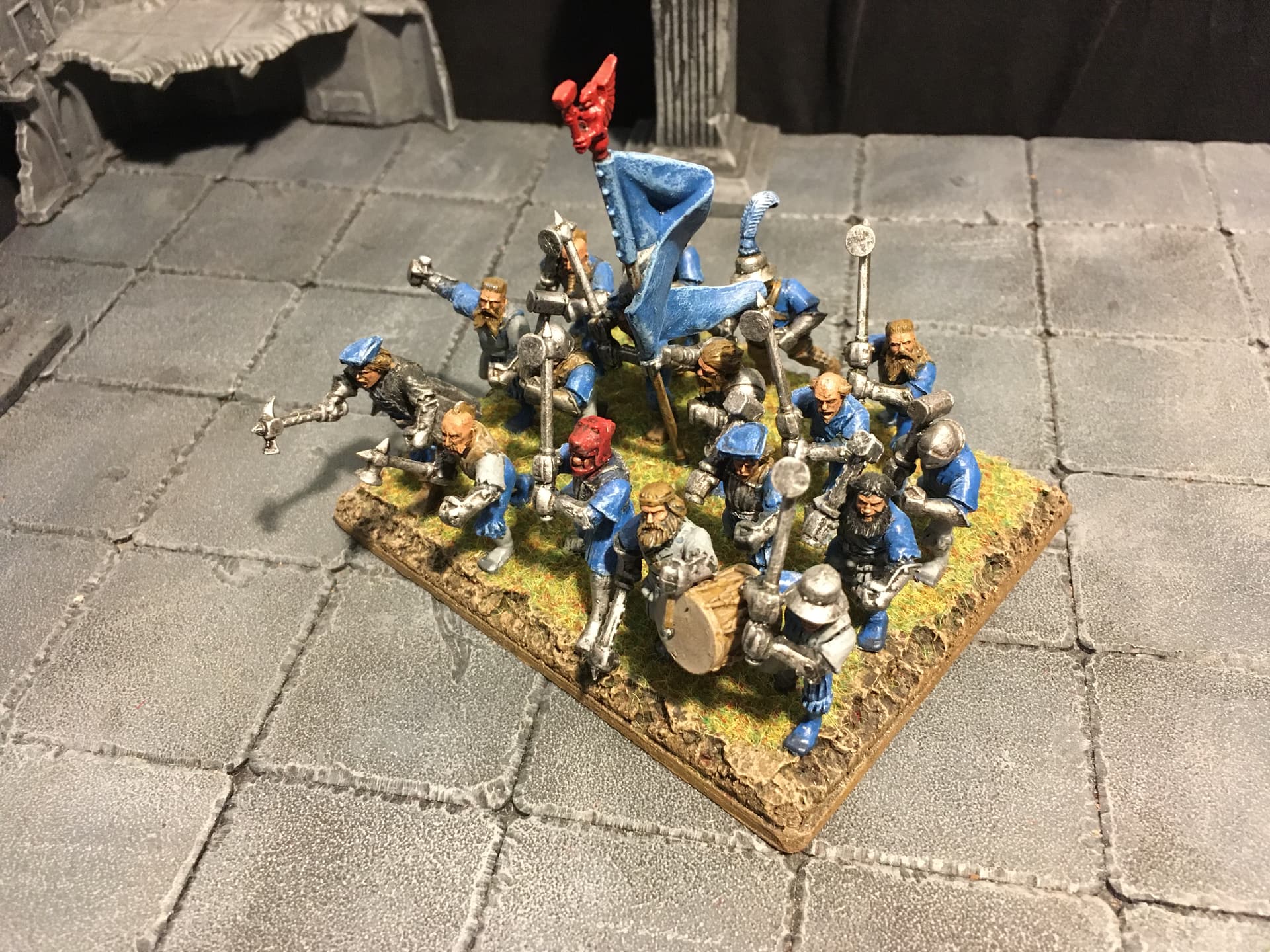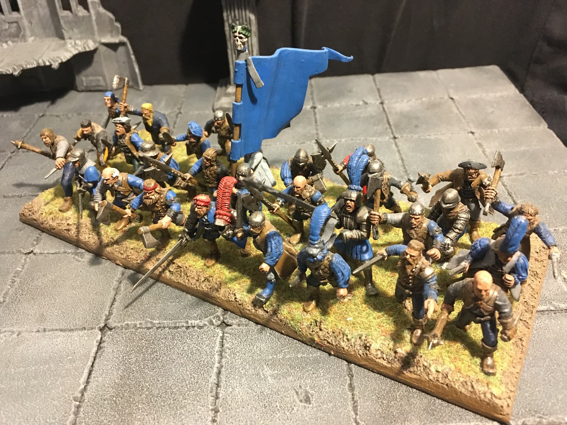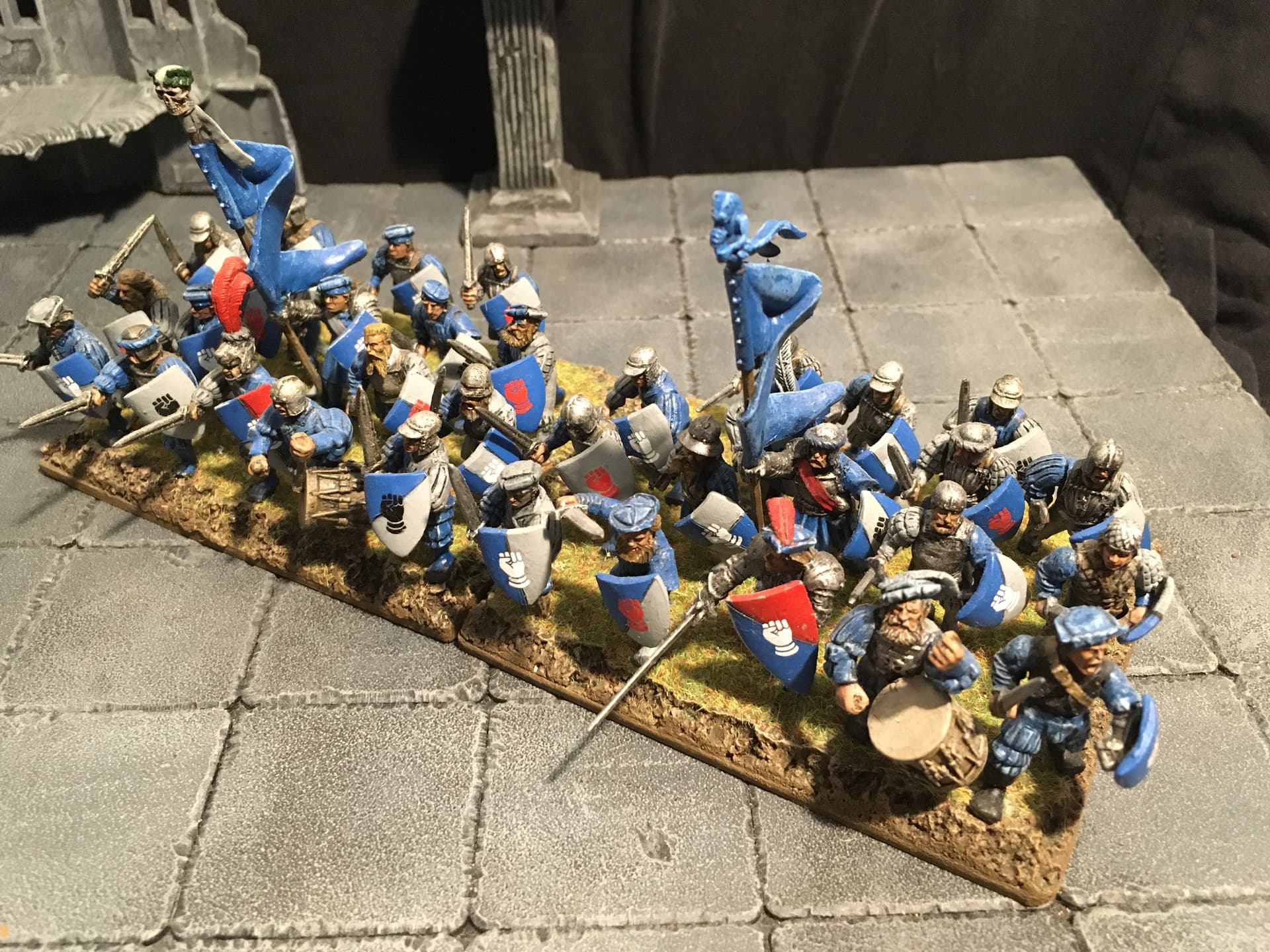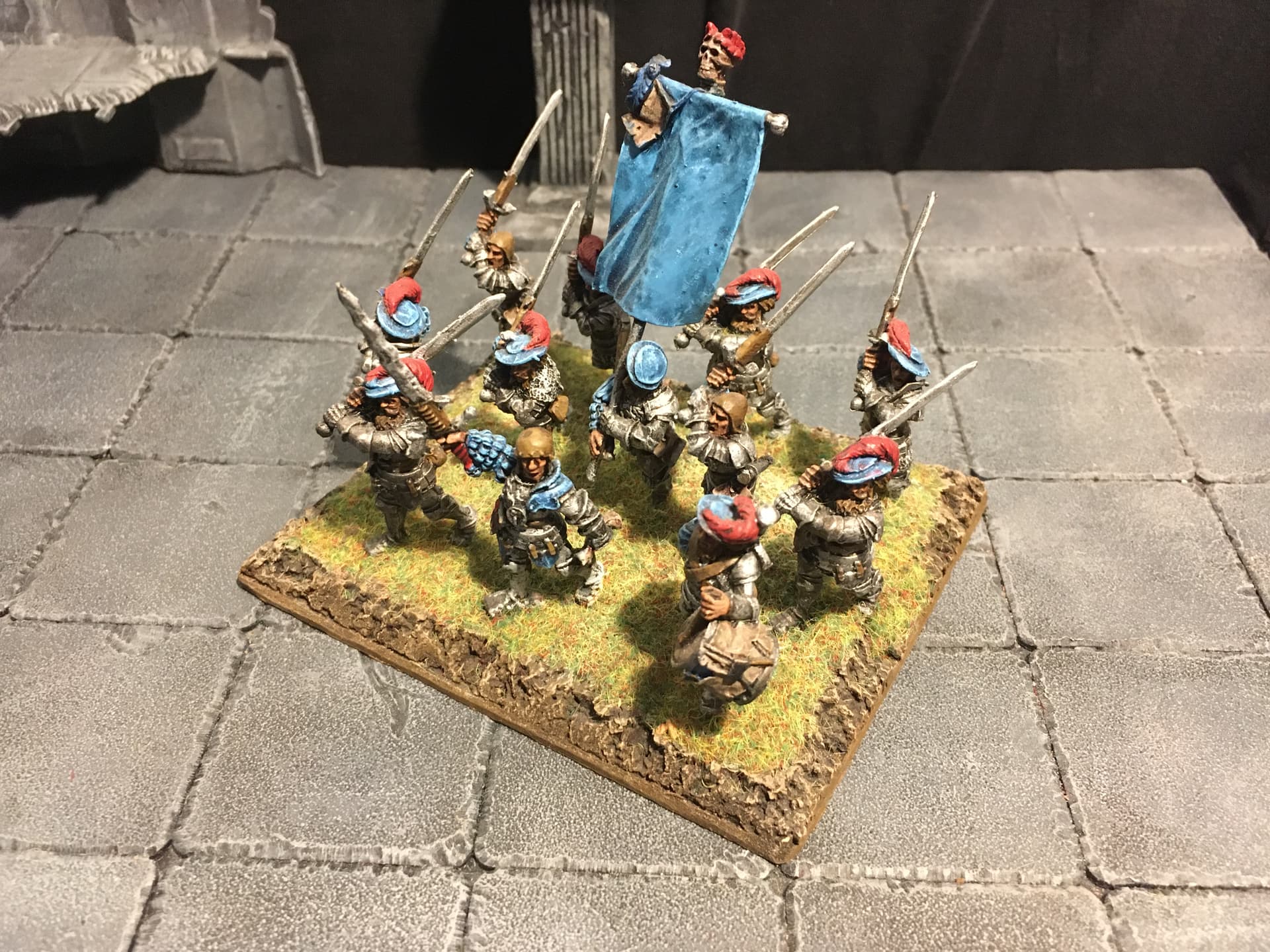 I chose blue and light grey for the overall colour scheme. Red is supposed to signify veteran troops and/or unit commanders. To break up the blue a bit I decided to include some units with alternate colour schemes, reminiscent of the Empire armies of old(hammer). I think the other parts of the overall army are going to include some more colour schemes: either red/black or mustard/black or mustard/red for the Fireforge, green and grey for the vikings (Rohan-ish) and the Landsknecht will be done in variants of the other colour schemes.