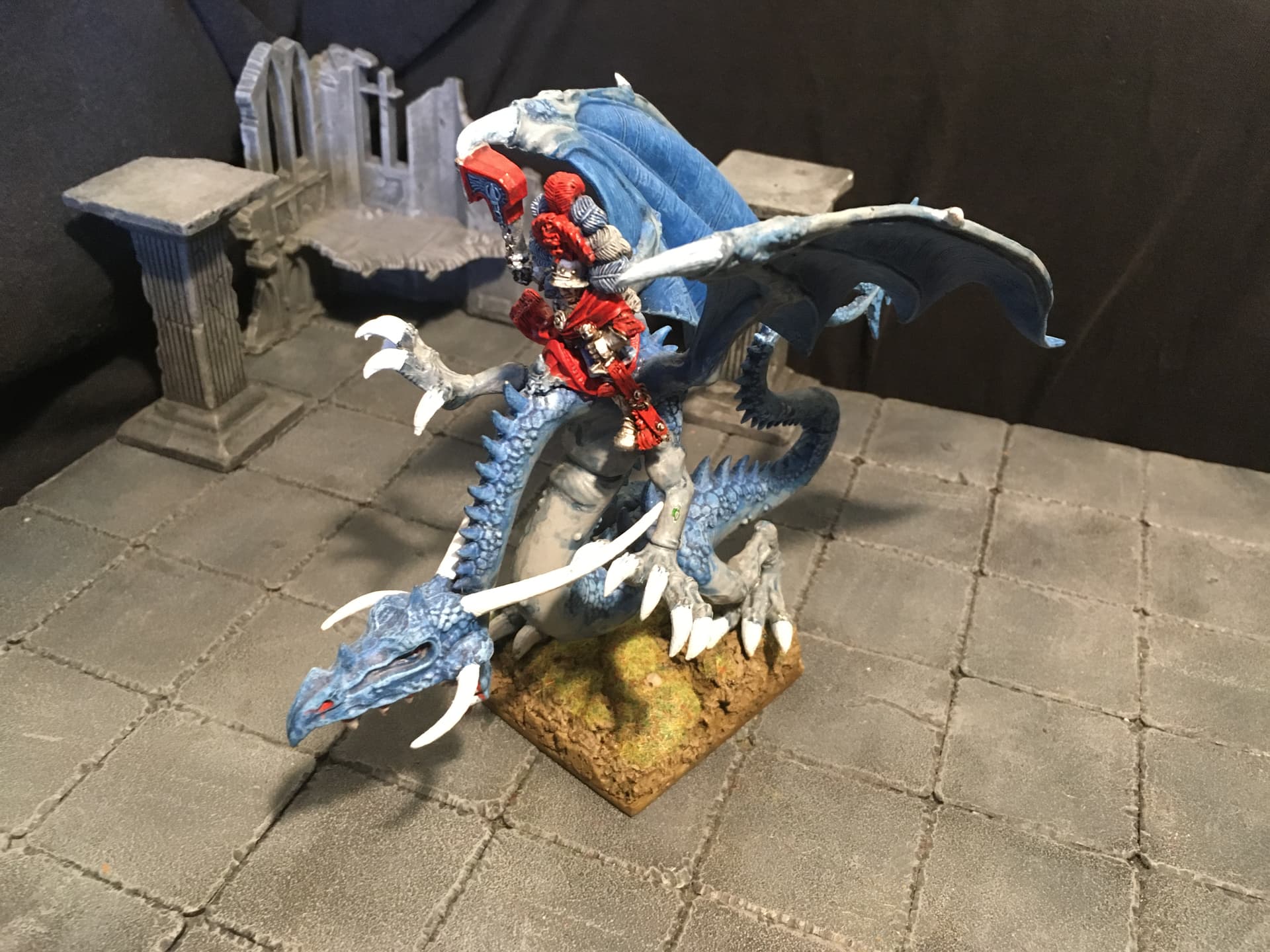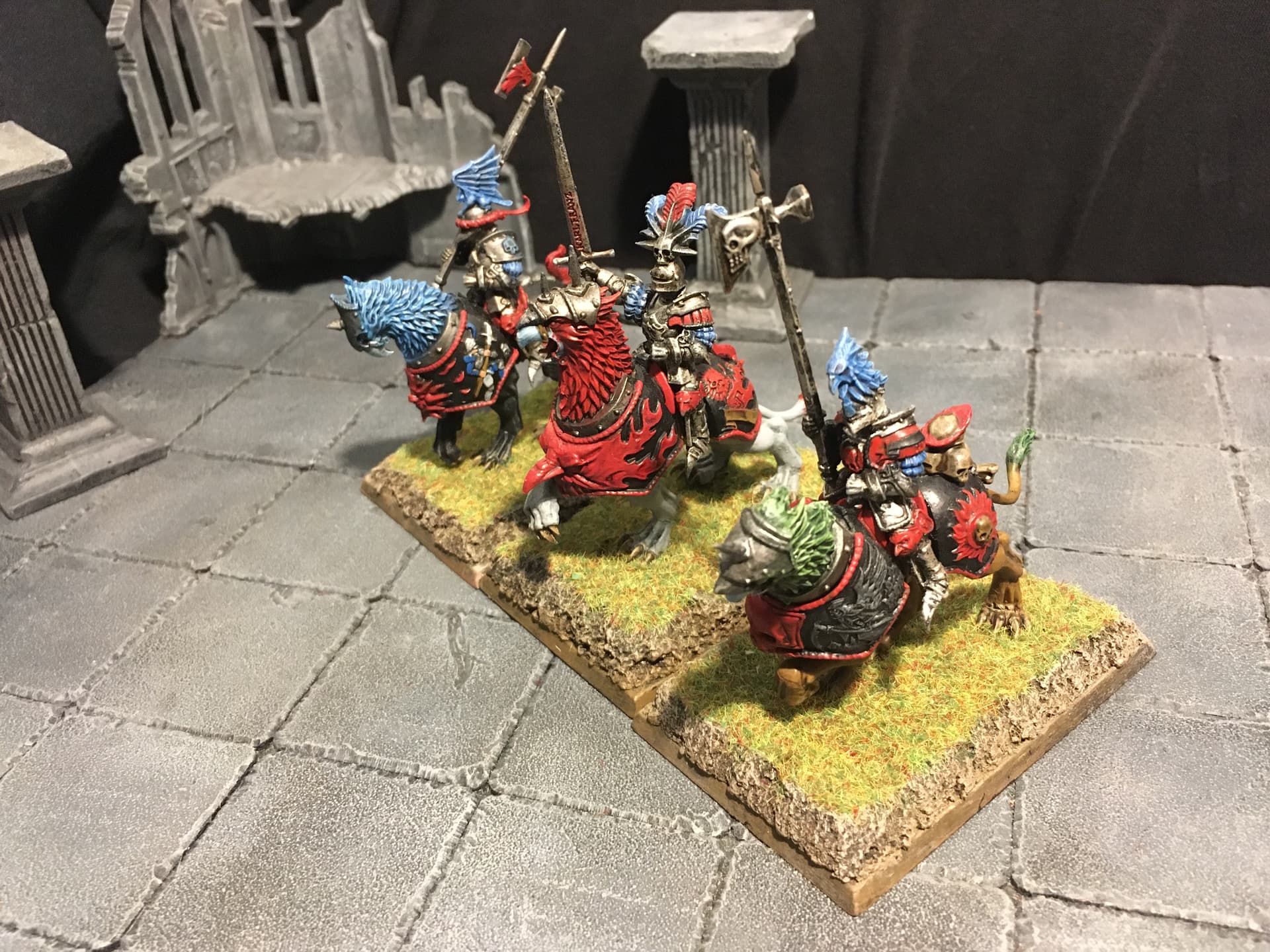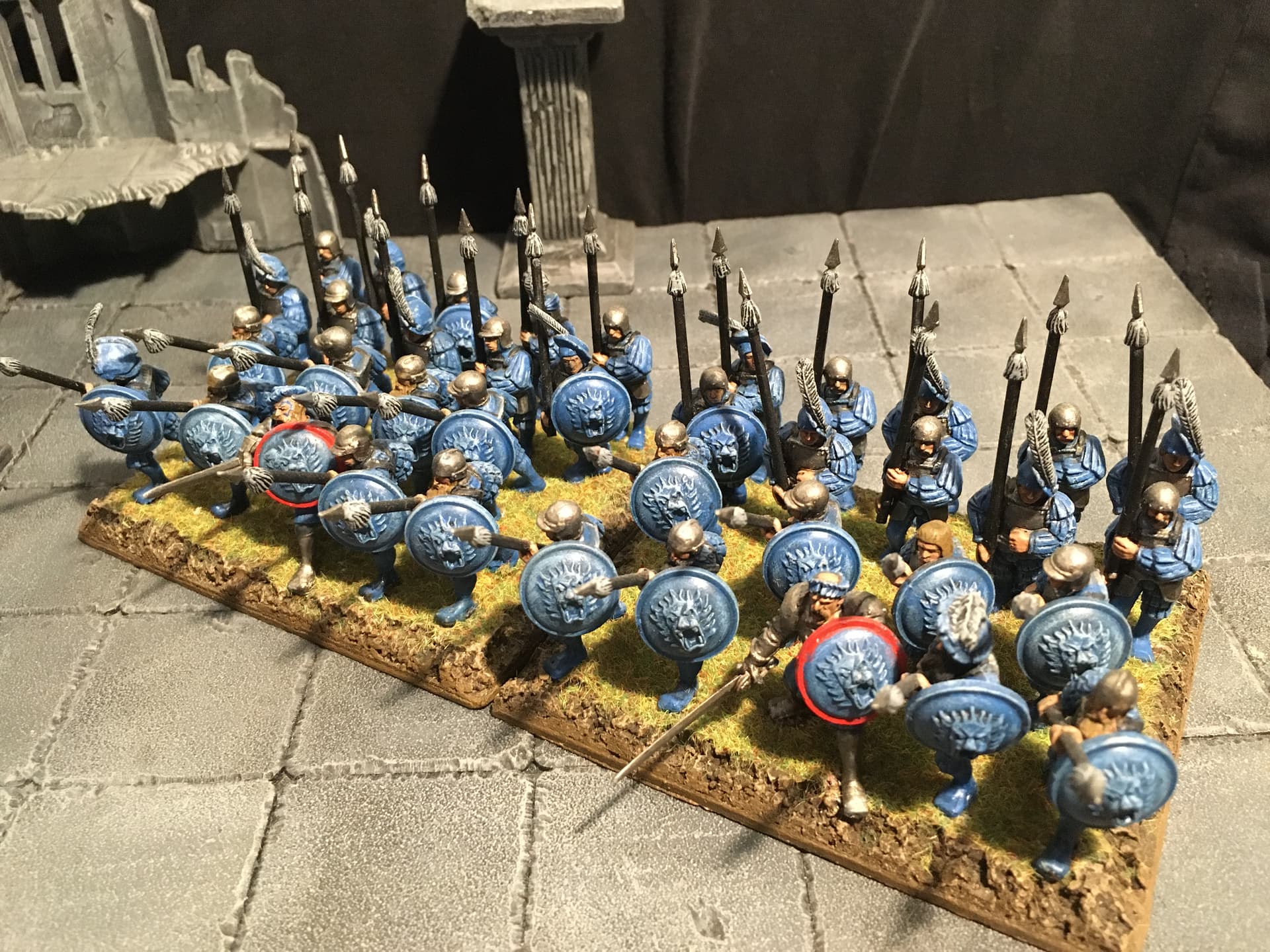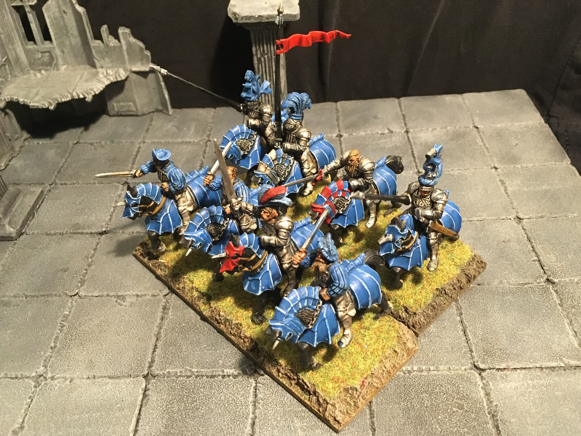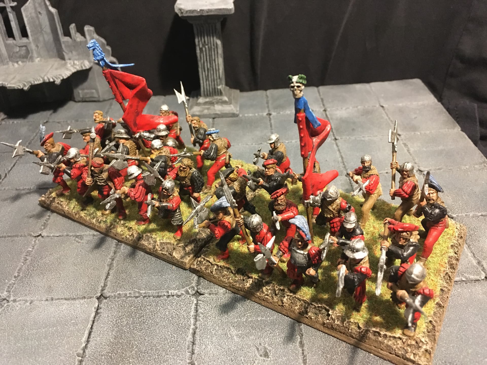 I chose blue and light grey for the overall colour scheme. Red is supposed to signify veteran troops and/or unit commanders. To break up the blue a bit I decided to include some units with alternate colour schemes, reminiscent of the Empire armies of old(hammer). I think the other parts of the overall army are going to include some more colour schemes: either red/black or mustard/black or mustard/red for the Fireforge, green and grey for the vikings (Rohan-ish) and the Landsknecht will be done in variants of the other colour schemes.