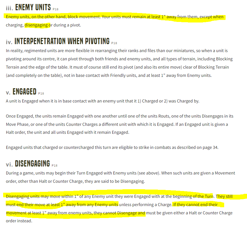 “While Disengaging, if a unit begins its Turn Engaged with one or more Enemy units on a single facing only, it may make a free Withdraw move of 1”, directly away from the unit(s), before carrying out a Charge, Change Facing, Sidestep, Back, or Halt order. The Withdraw move cannot be used to come within 1” of any enemy units and the unit must travel the full 1”. If it is not possible to travel the full 1” or to maintain a 1” distance from all enemy units (including the unit(s) it was engaged with), then a unit may not make a Withdraw move.”