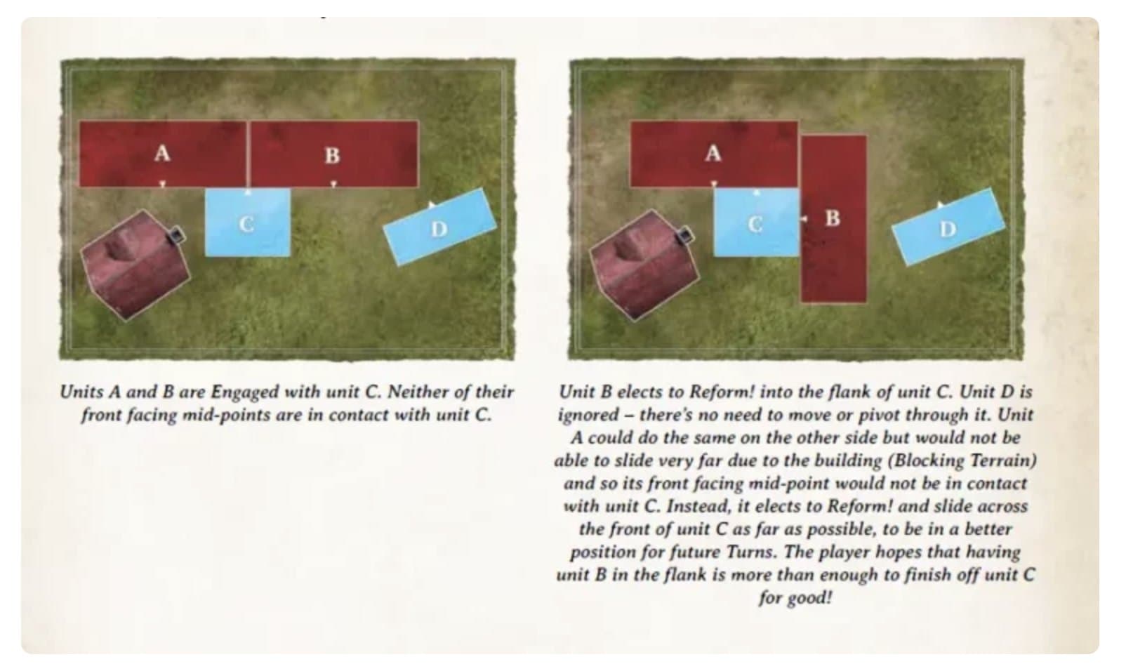 āB cannot charge D. Combats are sticky. Theyāre engaged with C and stay unless they Withdraw! And if they do they cannot charge something else. A cannot Reform! Into Cās flank as its front facing mid-point would need to be in contact with C after it moved into the flank.ā