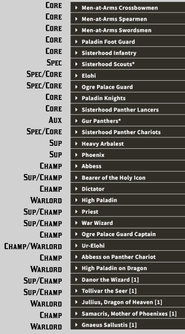 Certainly based on the background, the Basilean army is a core of men at arms, supported by paladins and the Sisterhood - with elohi and OPG being far less common (although it is mentioned that they might march on mass led by one of their captains?).