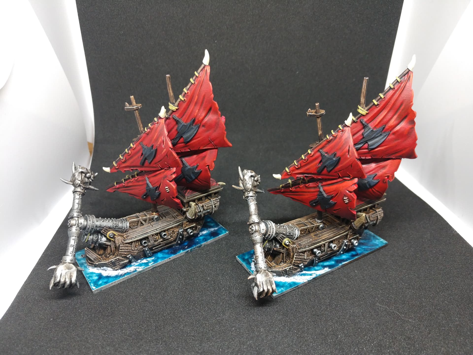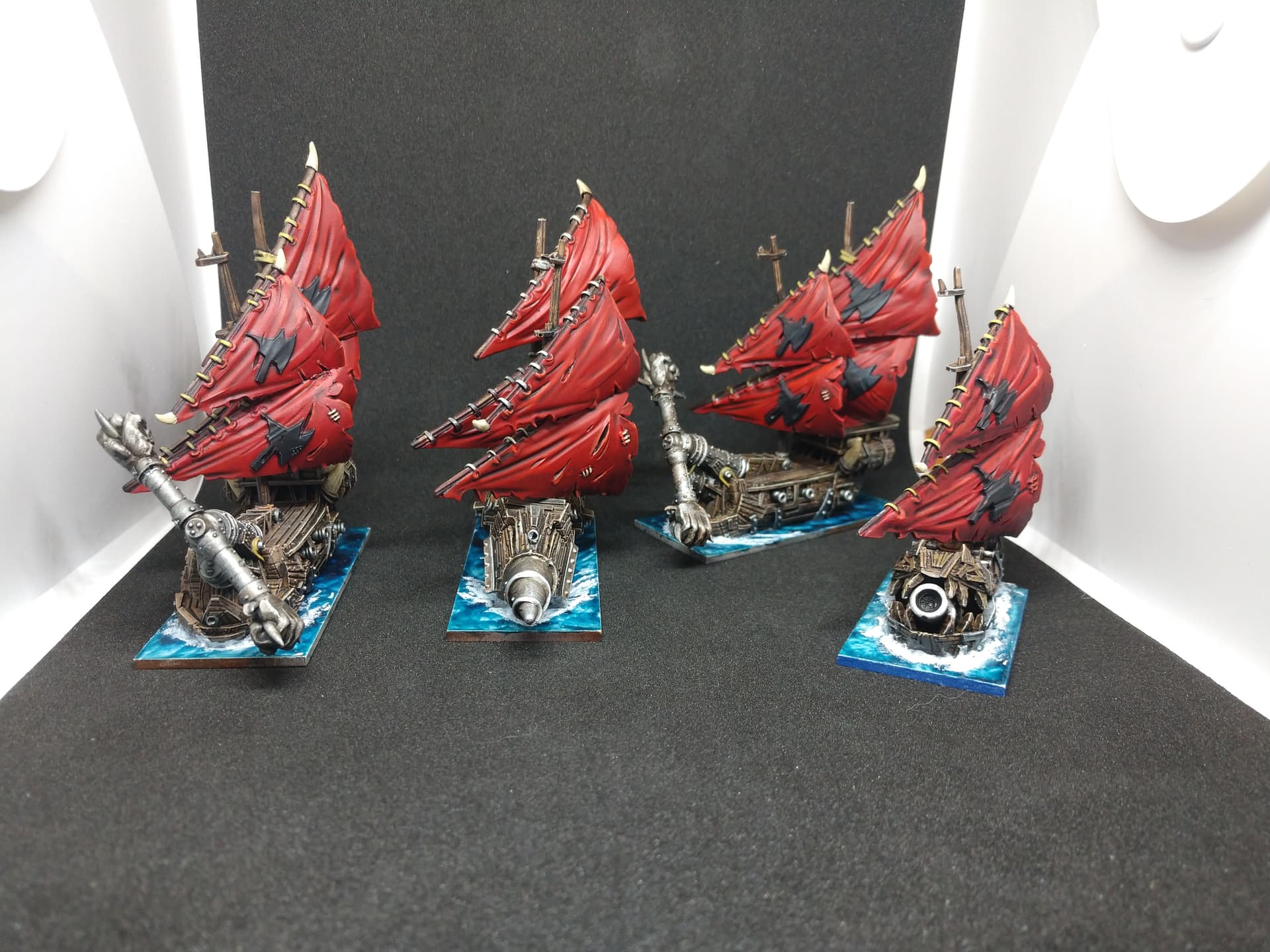 Have to say overall I am quite happy with them, tons of fun to paint and plenty of crisp edges to highlight. Had some issue with my paint on the sails post wash. First time using ArmyPainter Dark tone and it just would not come back to my base tone, only a muddy dark orange. So had to be quite extreme with highlights to get them to show and hit them all with bloodletter glaze after to try and blend it all in. Also first time doing a water base…still don’t quite have hang of it but its passable I think but defiantly room to improve.