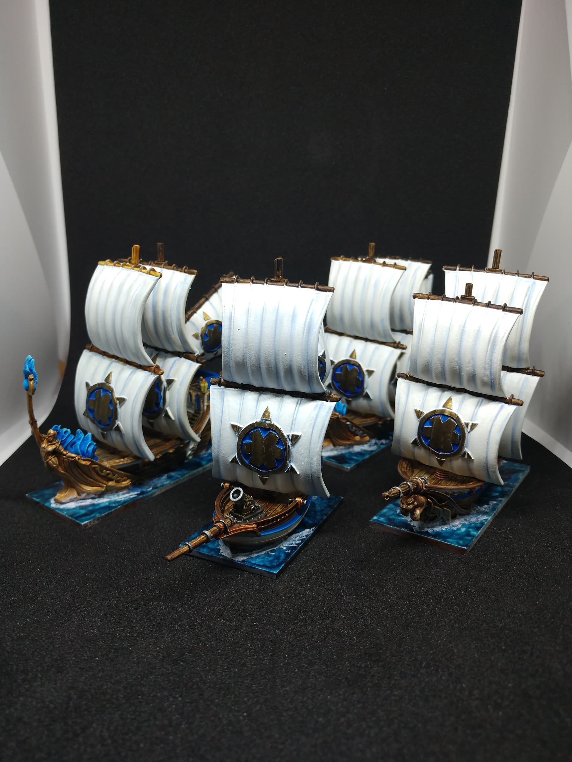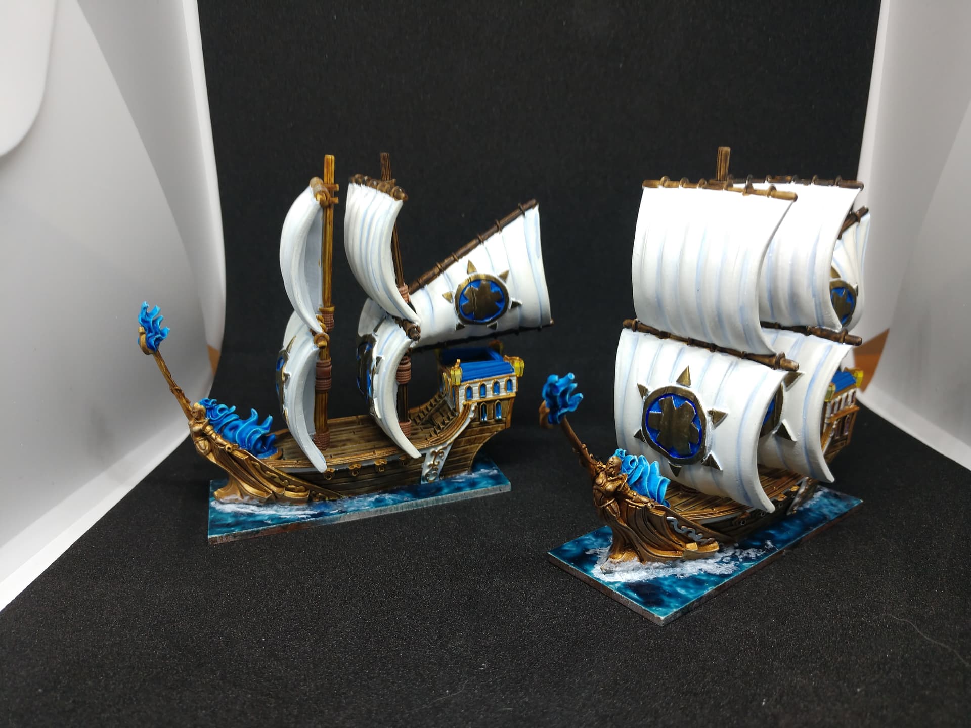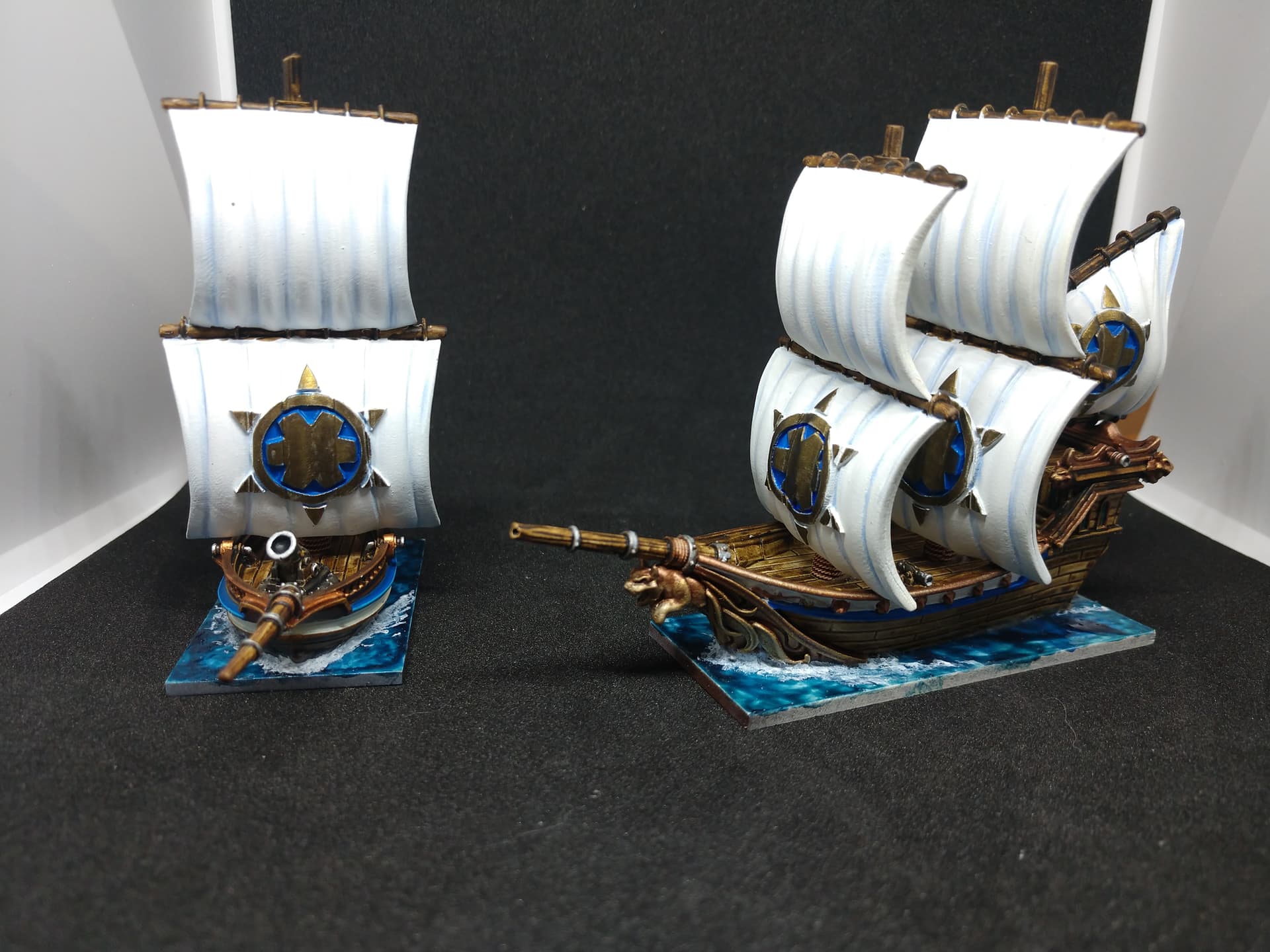 The way I went about the sails almost drove me insane, did a blue pin wash then using airbrush and whites natural transparency to bring it all back in line and lighten up the shadows. The ships themselves I was fighting at every step with my pallet choice, just every color I picked was fighting me either in coverage or the actual paint itself (Pretty sure my whites and blues are just bad). Overall was at the point of getting them bare min tabletop presentable and moving on or I was going to burn myself trying to get the “right”.