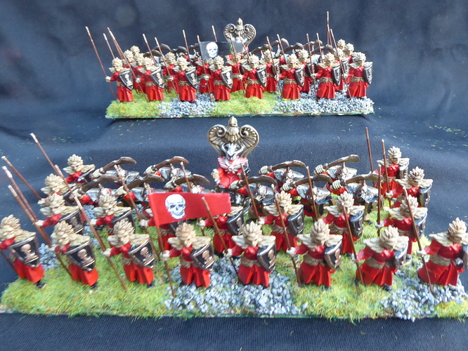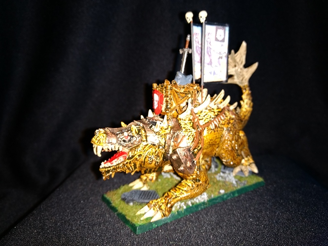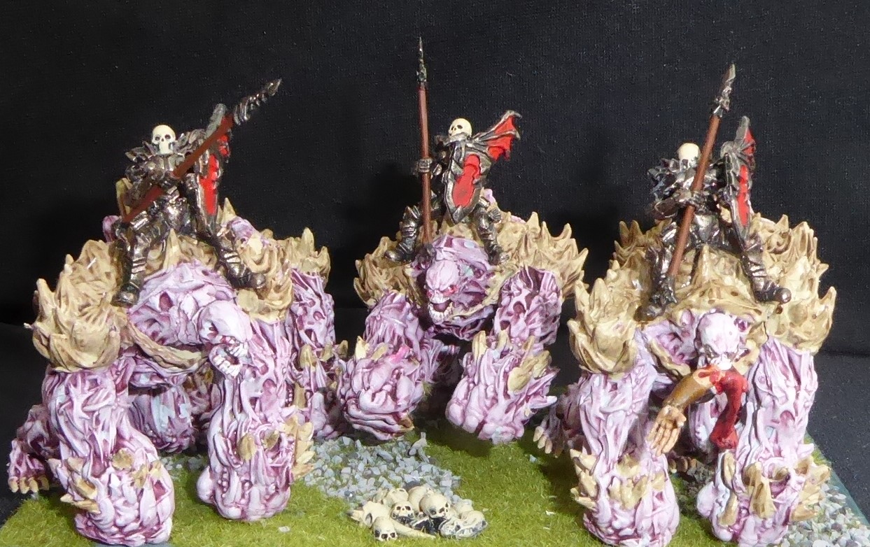 The background fluff to explain the use of Despoilers is: “One day, a patrol came across a small herd of massive creatures not seen in these parts before. From a distance these looked threatening and the patrol approached cautiously. On closer inspection however, it became apparent that the creatures were in a pitiful state, malnourished, starving and diseased. It was an easy task to round up the creatures and drive them to the nearest town. Here the local Duke and priest from the Church of the Children examined the herd and determined that the creatures were Abyssal Despoilers, a species previously thought to have been extinct since the cataclysm at the end of the 2nd Age. With appropriate care and nourishment, the Despoilers grew strong again and, in gratitude for their rescue, allowed themselves to be saddled and ridden. They were gifted to the Cult of the Dead where they now furnish the mounts for the Honour Guard. Their vicious nature and speed make them deadly foes in battle.”