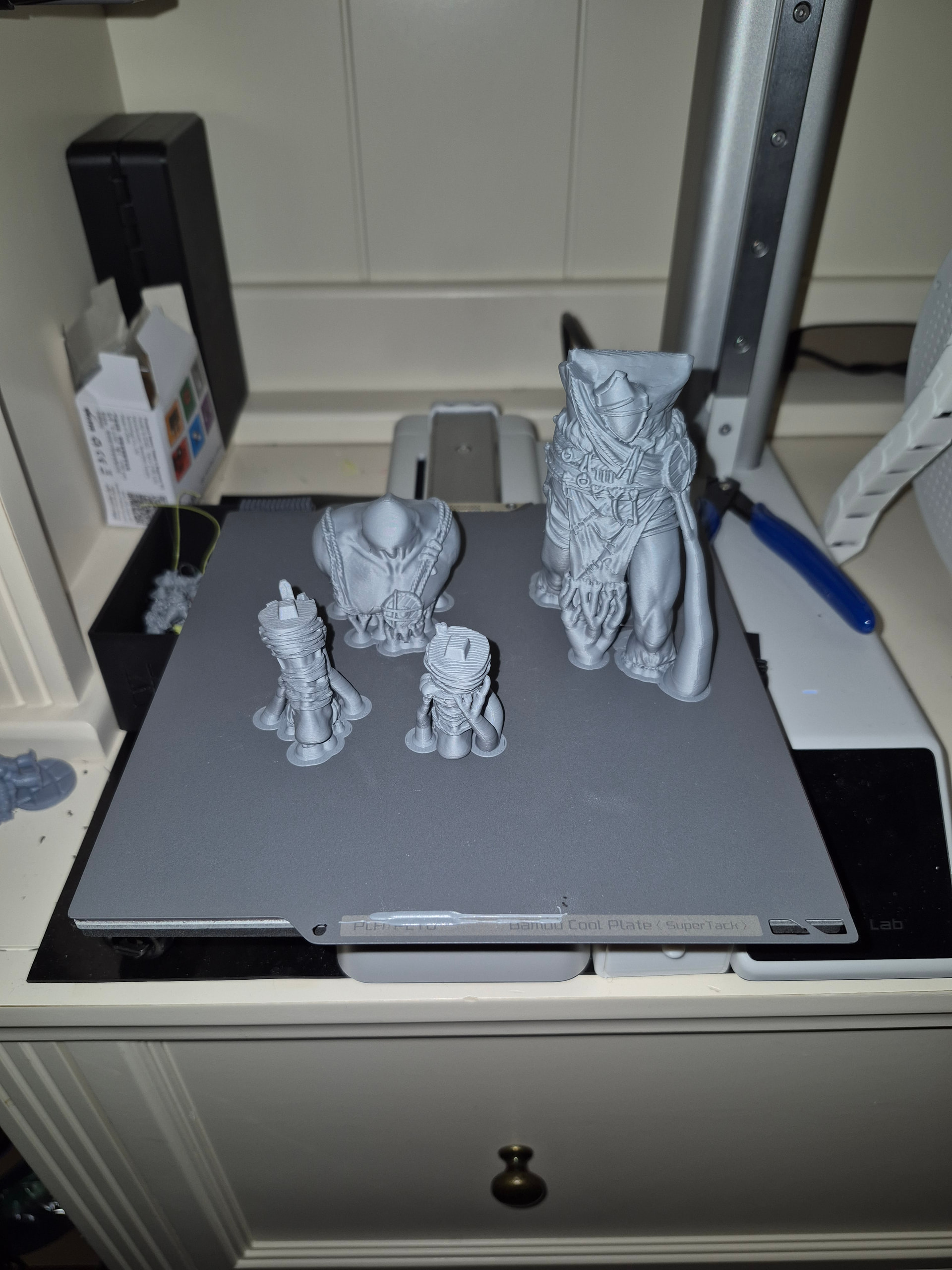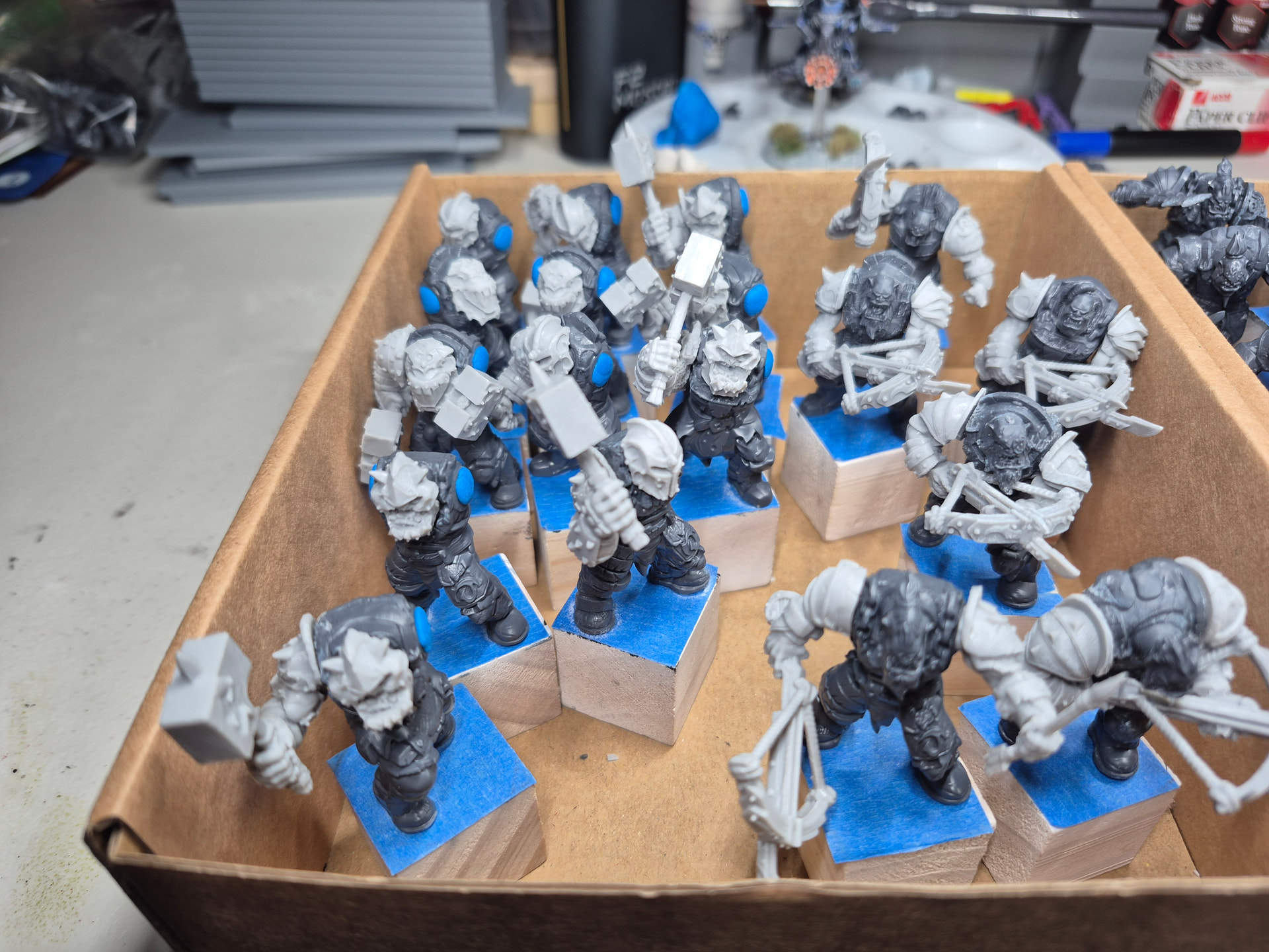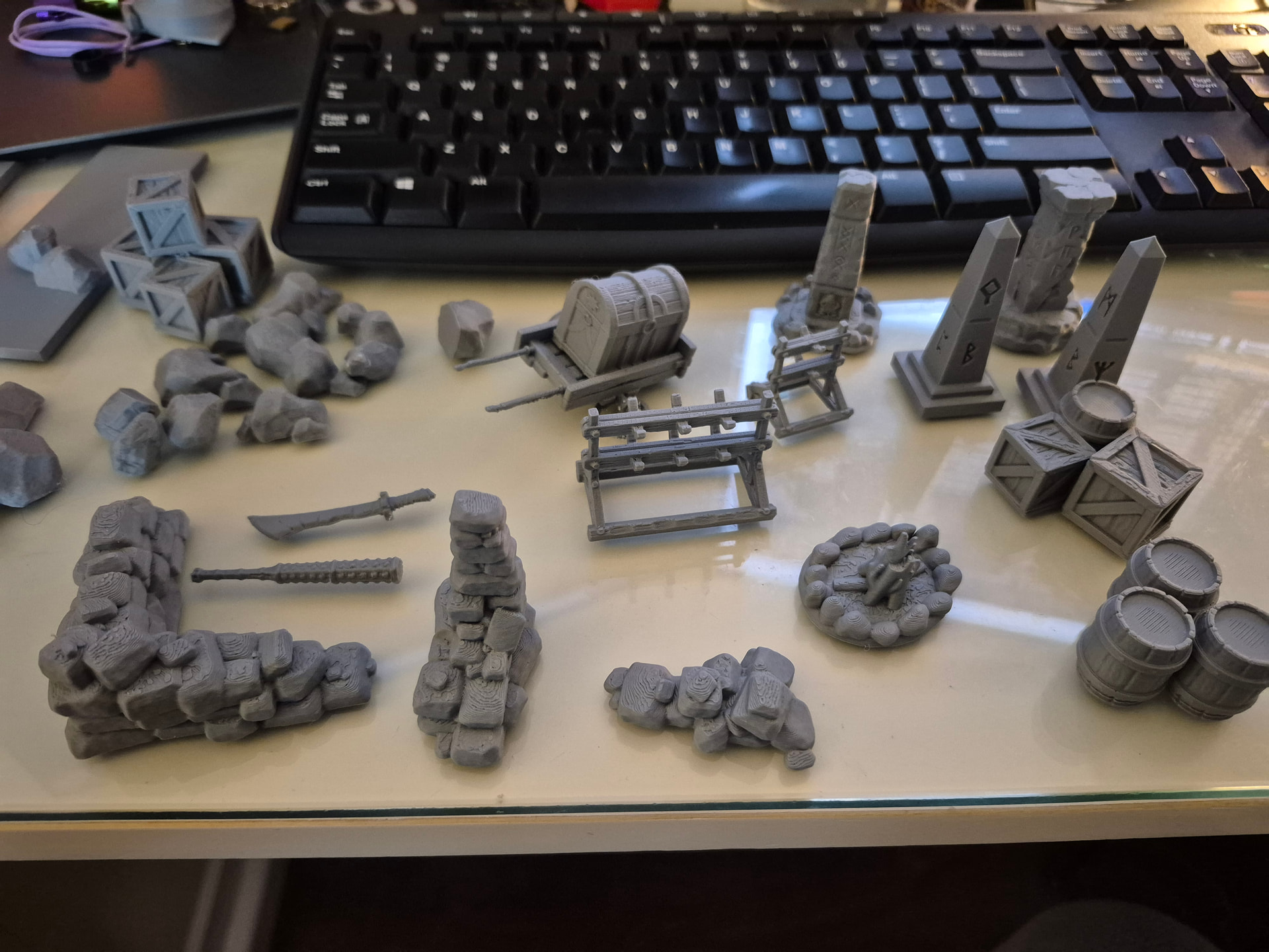 I’ve also been thinking about the basing (thanks Chris!) and have printed some bases (w/ magnet holes) and scatter bits. I’m planning to base most of my ogres as troops and put two together for regiments. For basing options, I’ve printed some rocks, rock walls, weapon rack, wagon w/ chest, crates, barrels, fire, and pillars.
