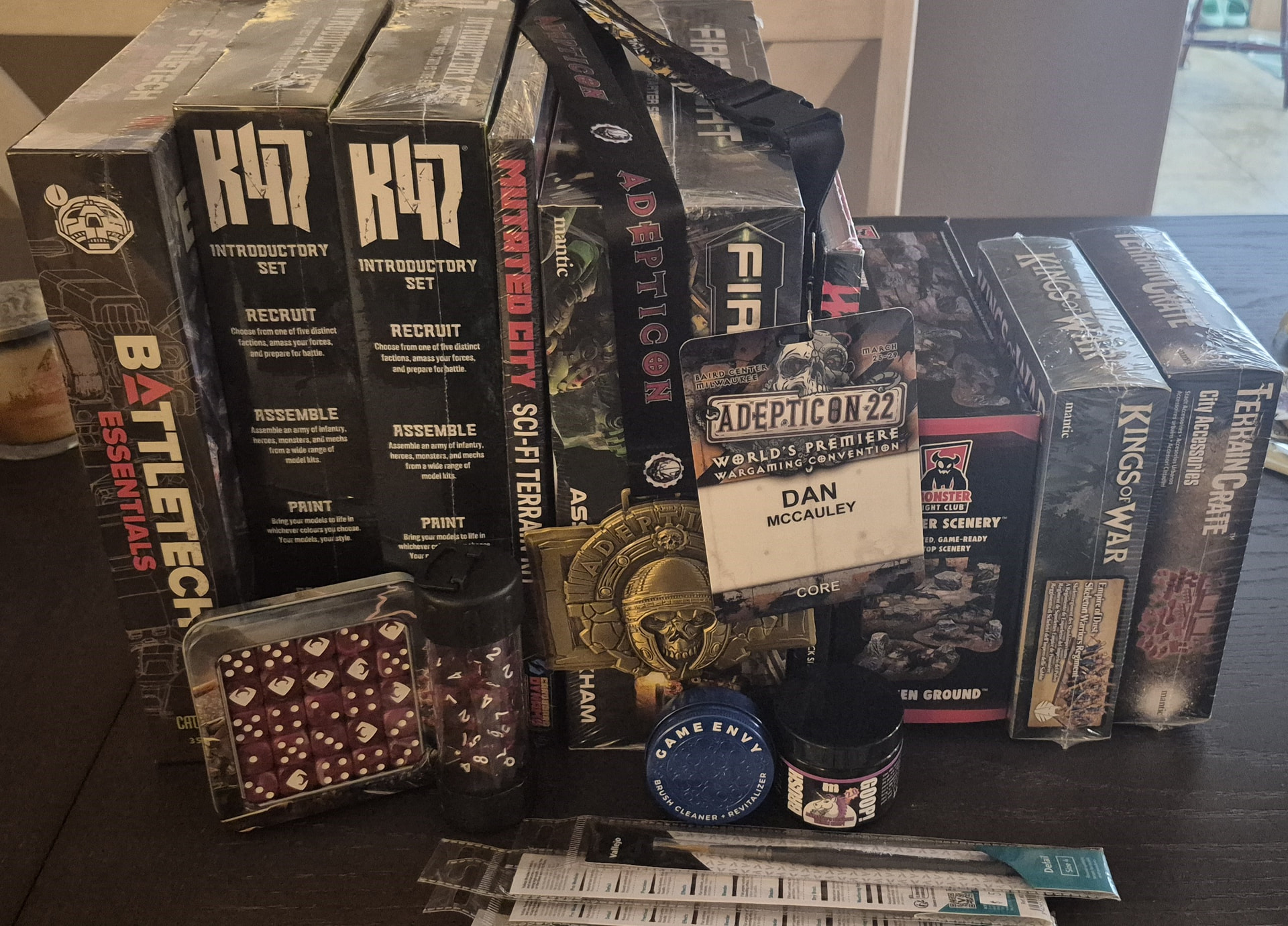 I love a deal, so for $75 I picked up the following at Adepticon: 2 copies of the K47 Intro set, Battletech Essentials, EoD regiment, terrain crate City Accessories & the Hametsu hardback rulebook by Black Site Studios. I’ve been intrigued by K47, but I don’t really need another game system (as we all say).