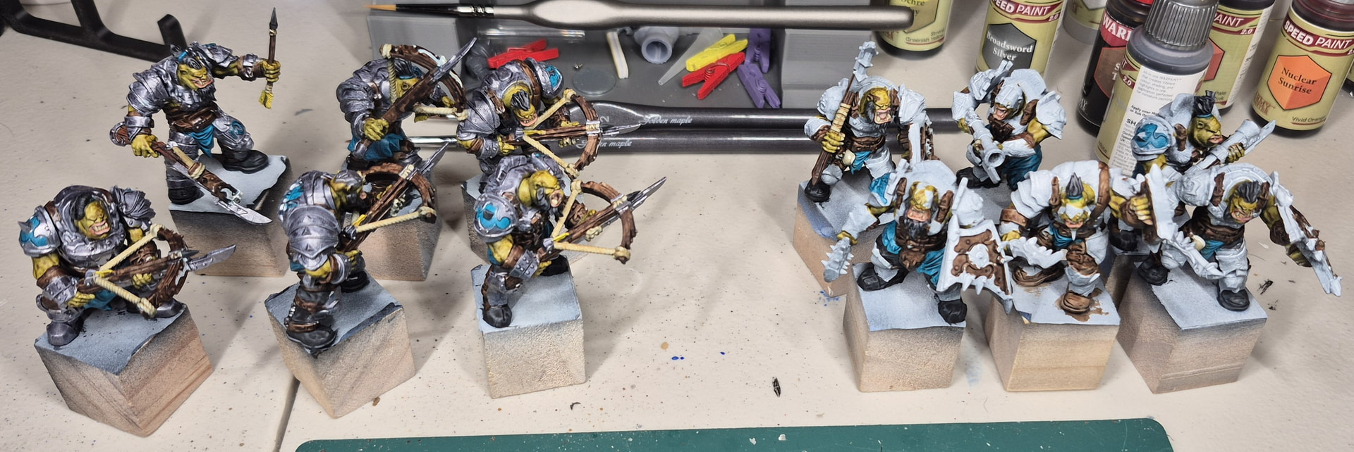 As for my progress, I’m very close to finishing six shooters, with four warriors and two boomers right behind them. I expect to have them completed tomorrow, which will give me 6 shooters, 12 boomers & 12 warriors ready for basing. I plan to do some creative basing and probably only use five models for a regiment, but using the full model count, I calculate I’ll have just over 1k points of painted models.