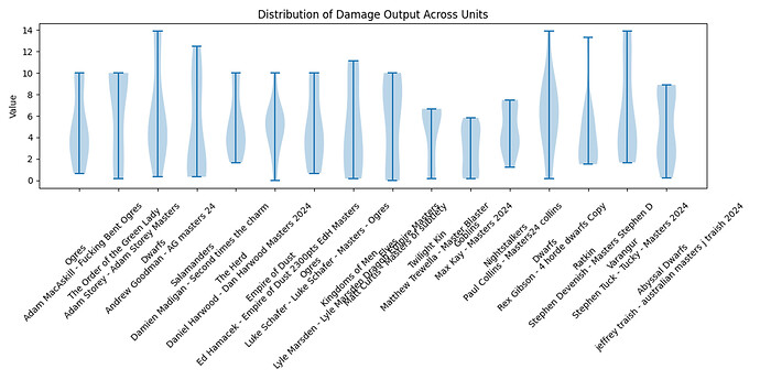 Here’s the idea. For each tournament, I scale every list to a 2300-point baseline so they’re easier to compare. Then I look at a few key stats: expected melee damage, ranged attacks, average speed, total units, unit strength, and a few others. Based on how those numbers stack up—especially compared to percentile cutoffs—I assign one of several archetypes: