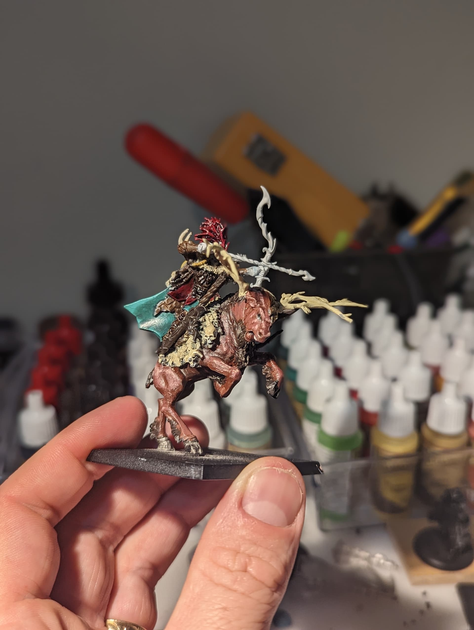 The unit leader is a Wood Elf Noble on Great stag with some upgraded antlers and a Tzaangor bow.