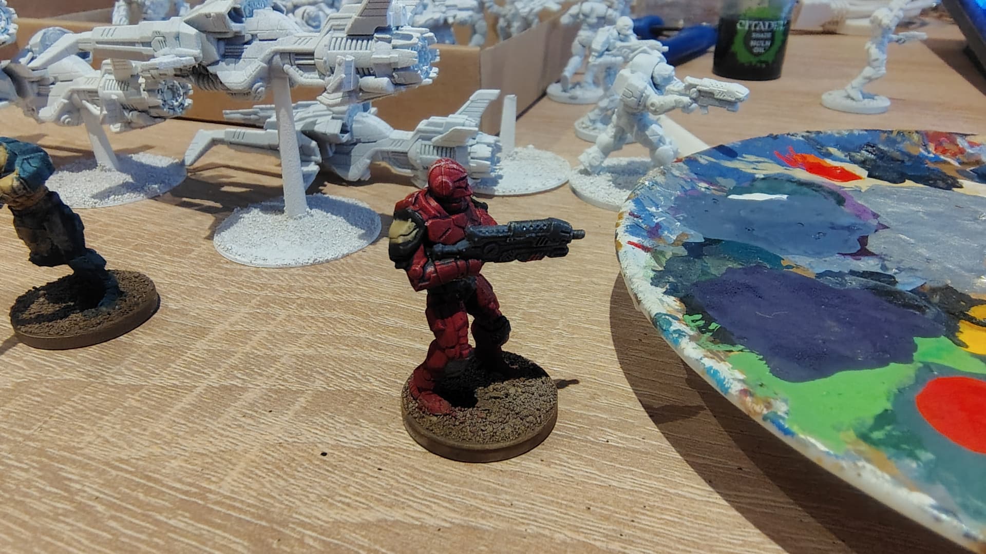 #1 Blood Ravens inspired color theme. Main body in dark red, some parts in bloody red, Dark Sand kneecaps and shoulder pads. Gun in grey with metal parts. Washed with Nuln Oil.