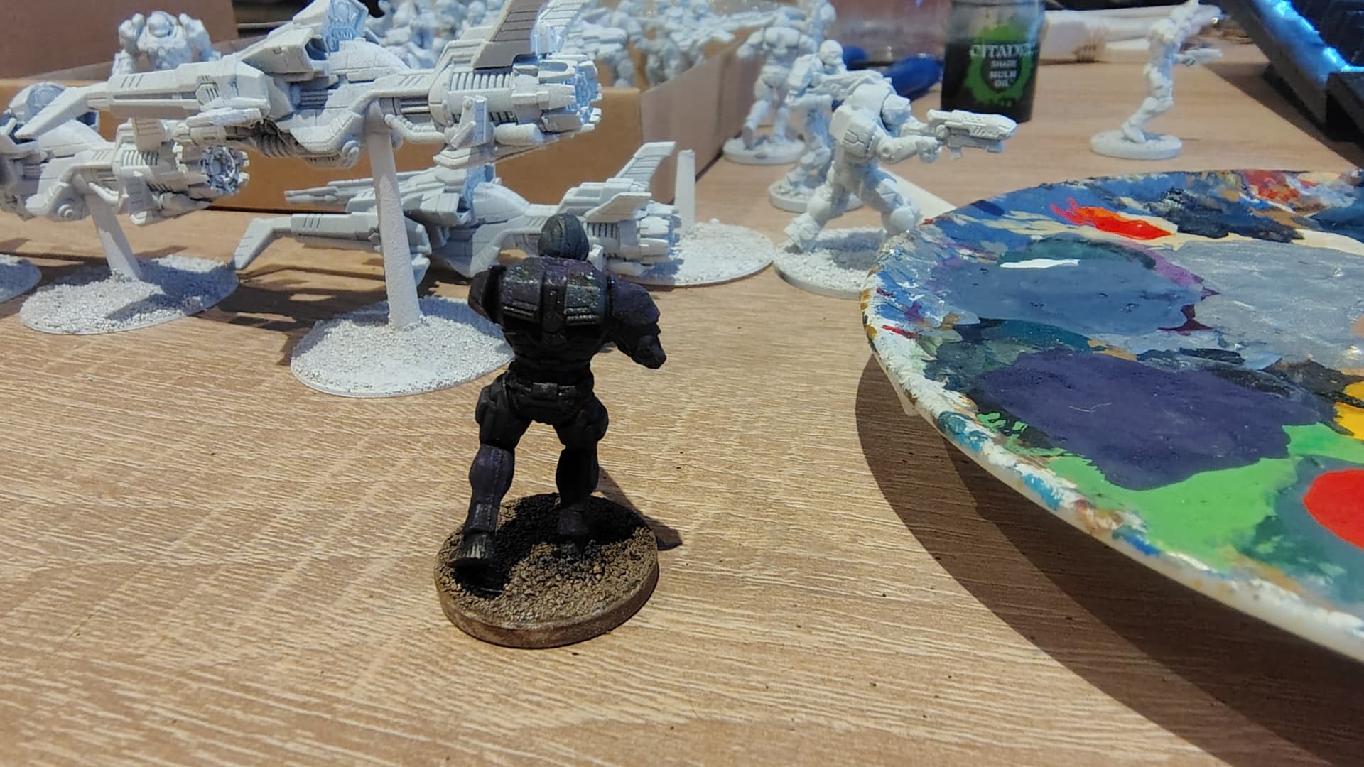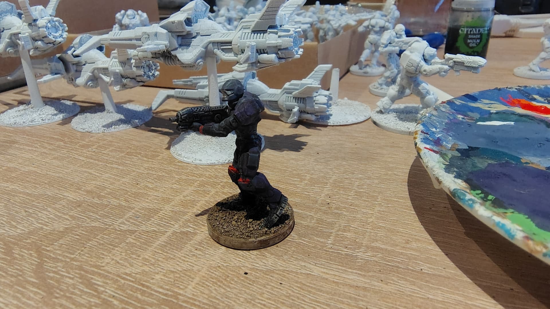 #2 XCOM 2 Advent Trooper inspired color theme Black Violet/Luftwaffe Uniform color mix for the armour plates, Luftwaffe Uniform for the rest. Connections in Red. Gun in Dark Gunmetal. Washed with Agrax Earthshade.