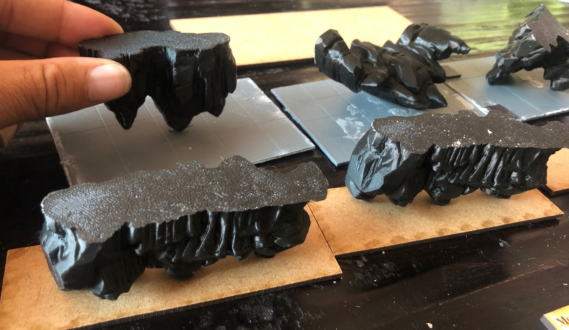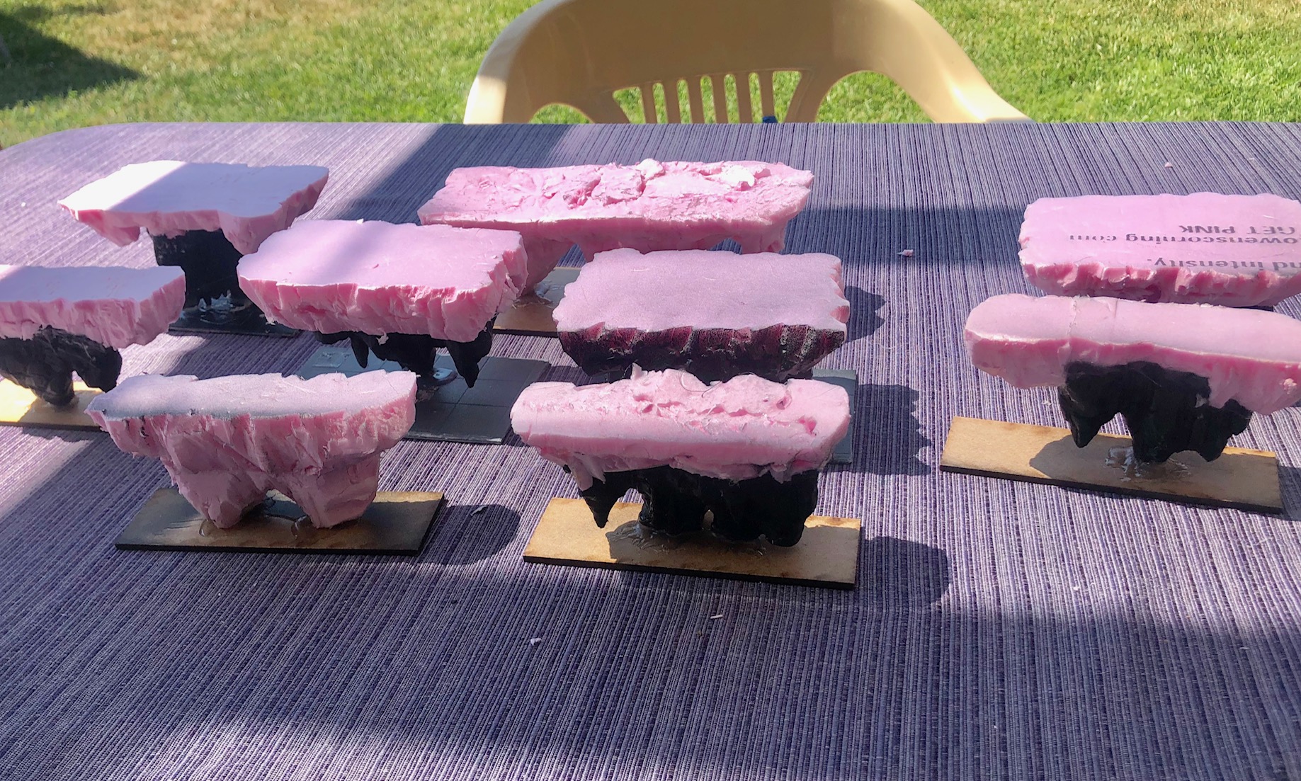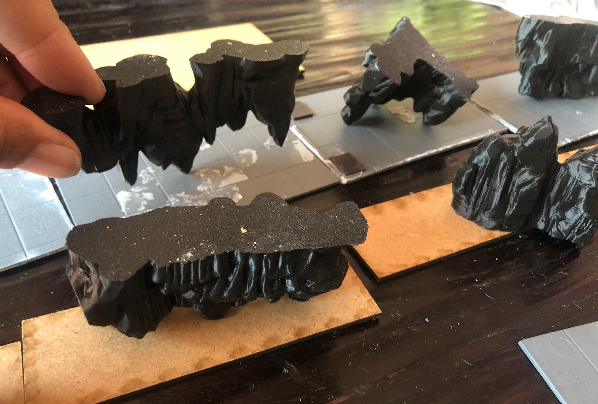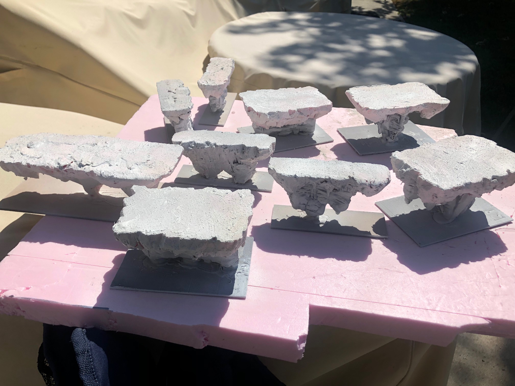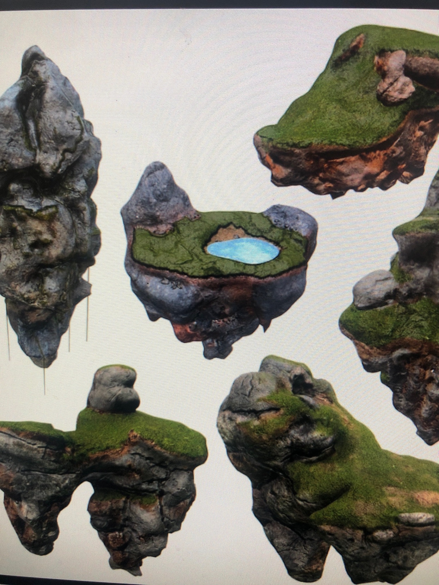 I showed some pictures above. Some parts were 3d printed from an older project that I thought would make good solutions to theunderside of the floading islands, like those from Avatar. I cut some pink foam scraps to shape the top of the landscape. Then pain with any base paint of your choice. Id recommend something thick from homedepot, but non-spray paint.