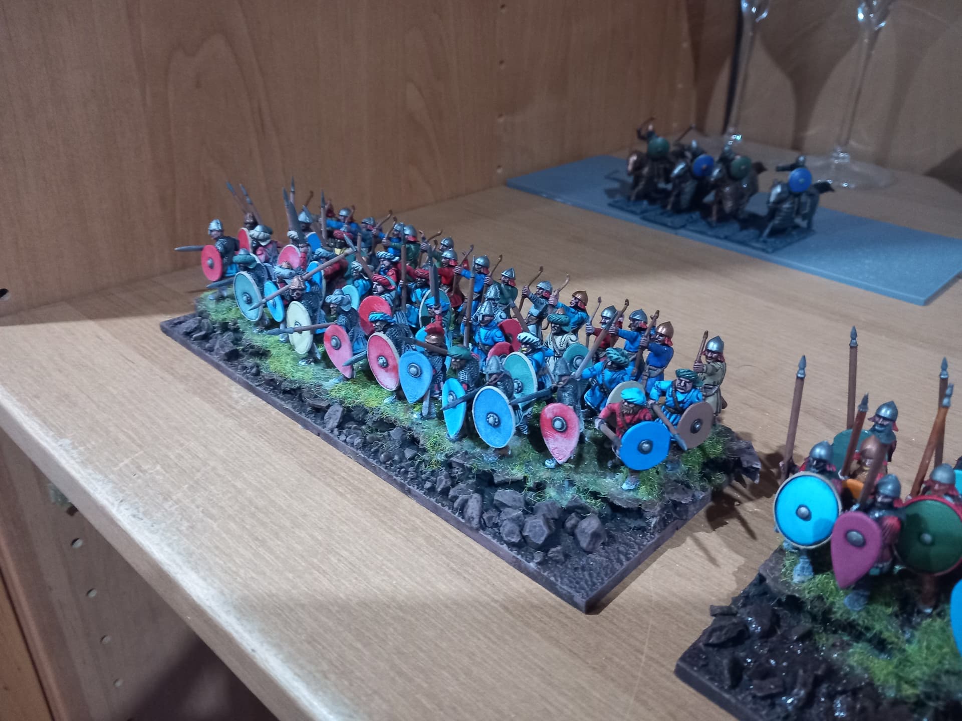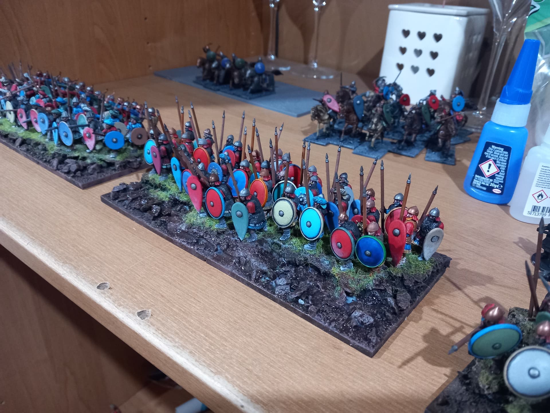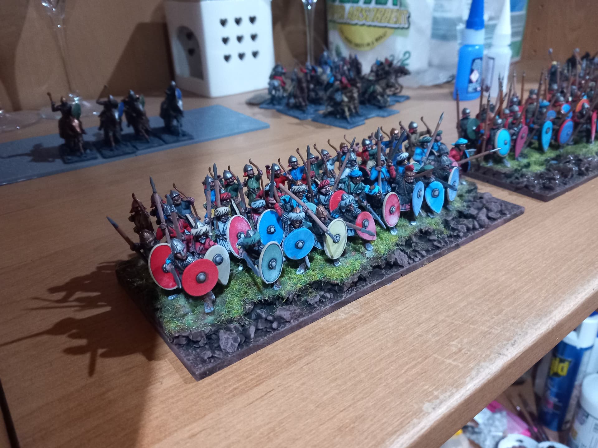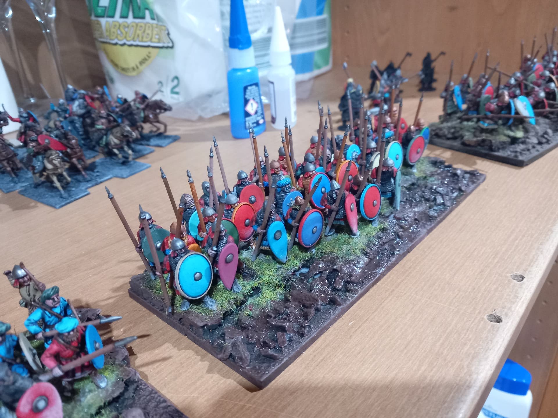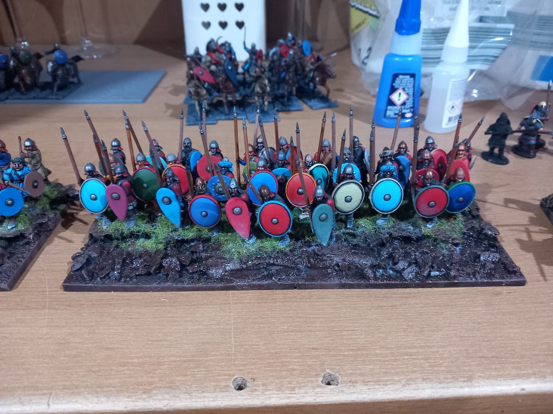 For people who are interested, the unit is fireforge Byzantine spearmen mixed with fireforge medieval Russian infantry. The kit is very similar and the Russian infantry comes with sprues for bowmen which, if you take the bow off of the sprue arm and put a shield on instead, has a very good look of shield bashing with the rim. Both kits together make very dynamic and posable miniatures.