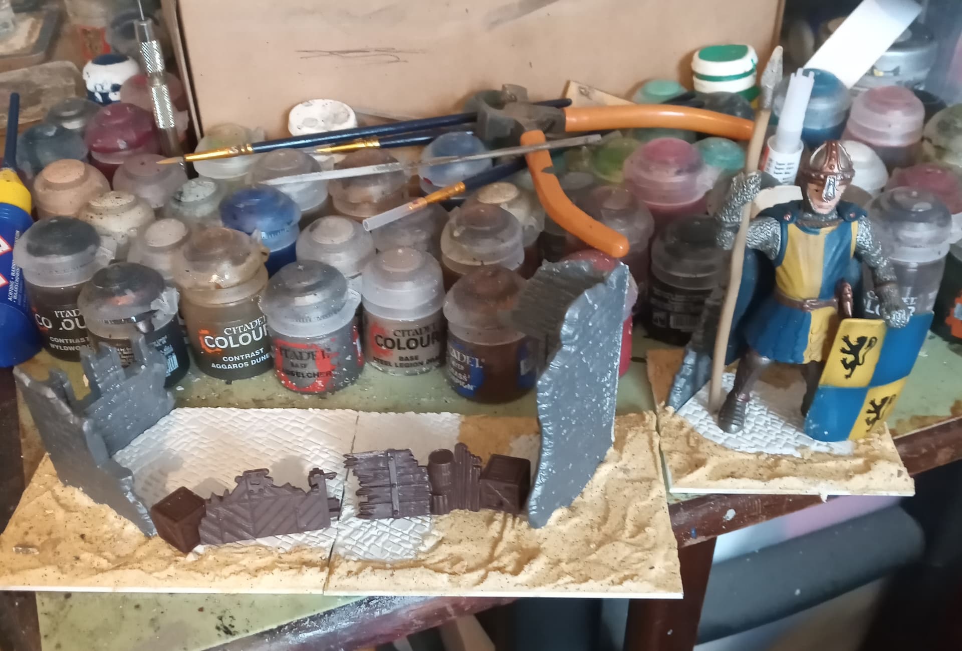 The mantic terrain crate range is awesome (where most of the physical scenery bits come from), plus greenstuffworld textured rollers and modeling clay.