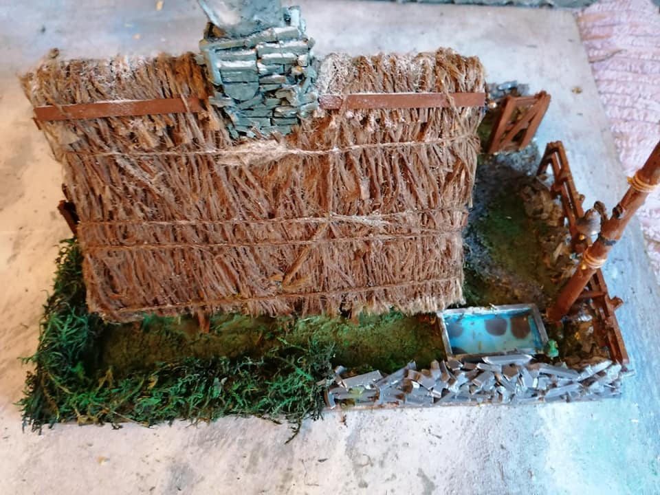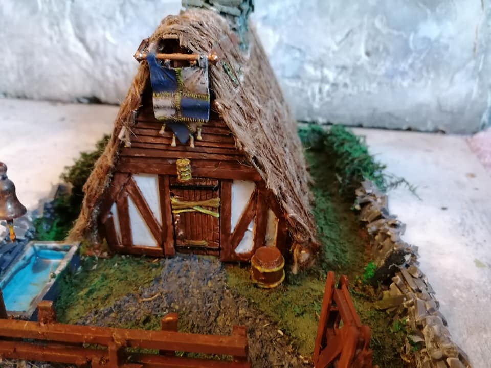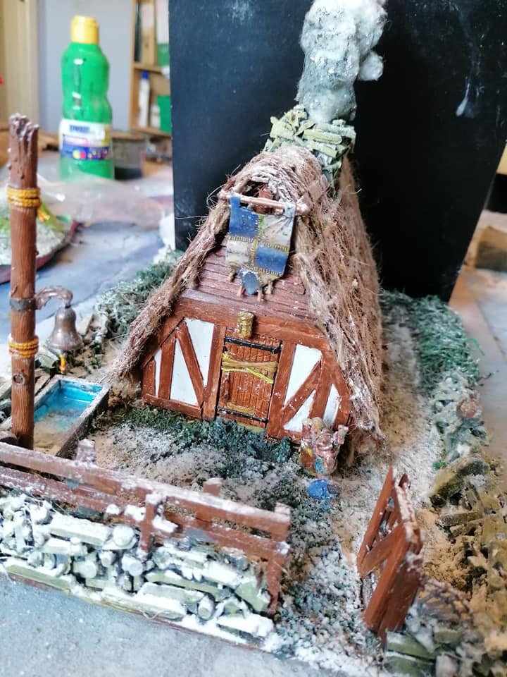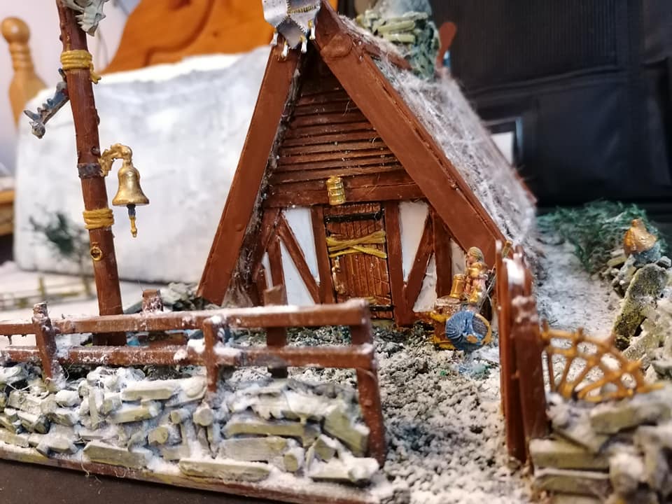 Just when you think you have it fininshed, i realized that i was missing something… the eaves… Very distinct in a Nordic style longhouse. Alsi it squares off and tidies up the edges of the thatch. The banner needed moving to make it fit, but I always felt that the top of the hitching post with the bell was missing something… Now it’s a flagpole too