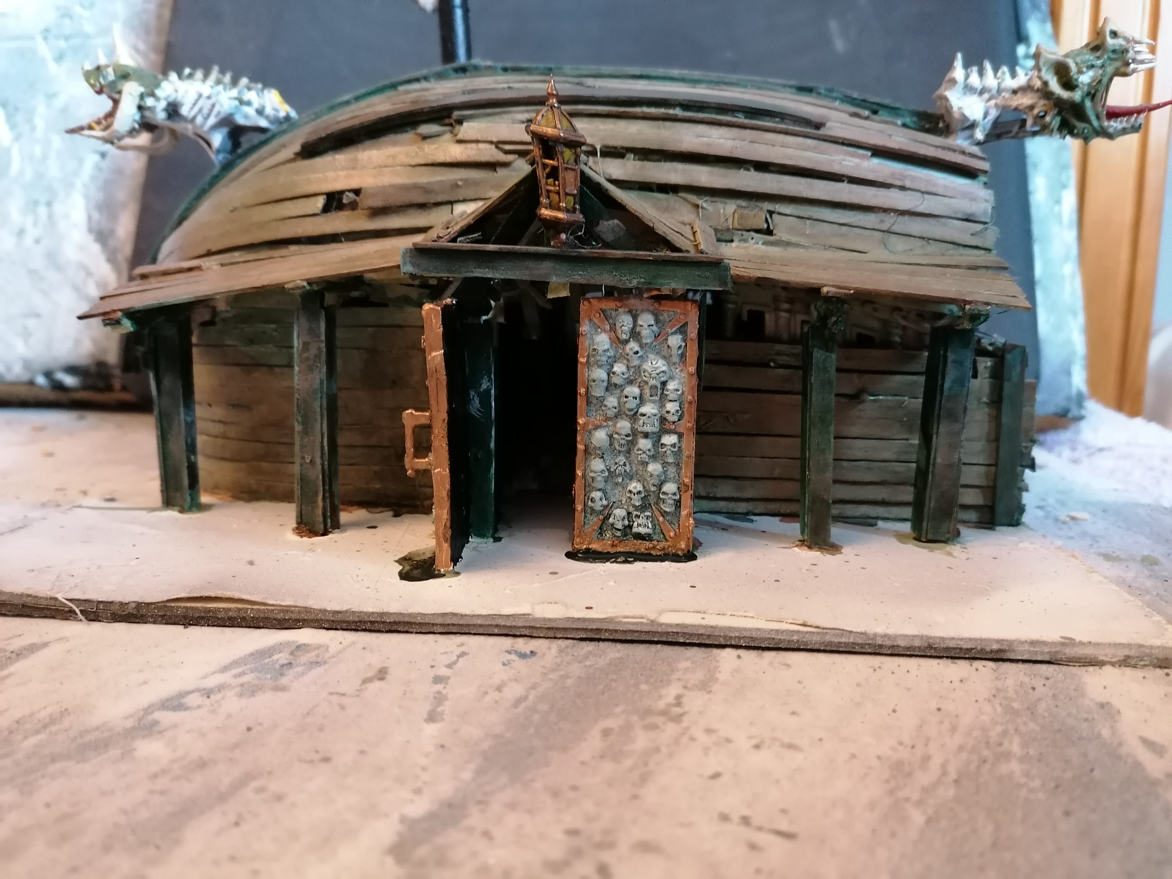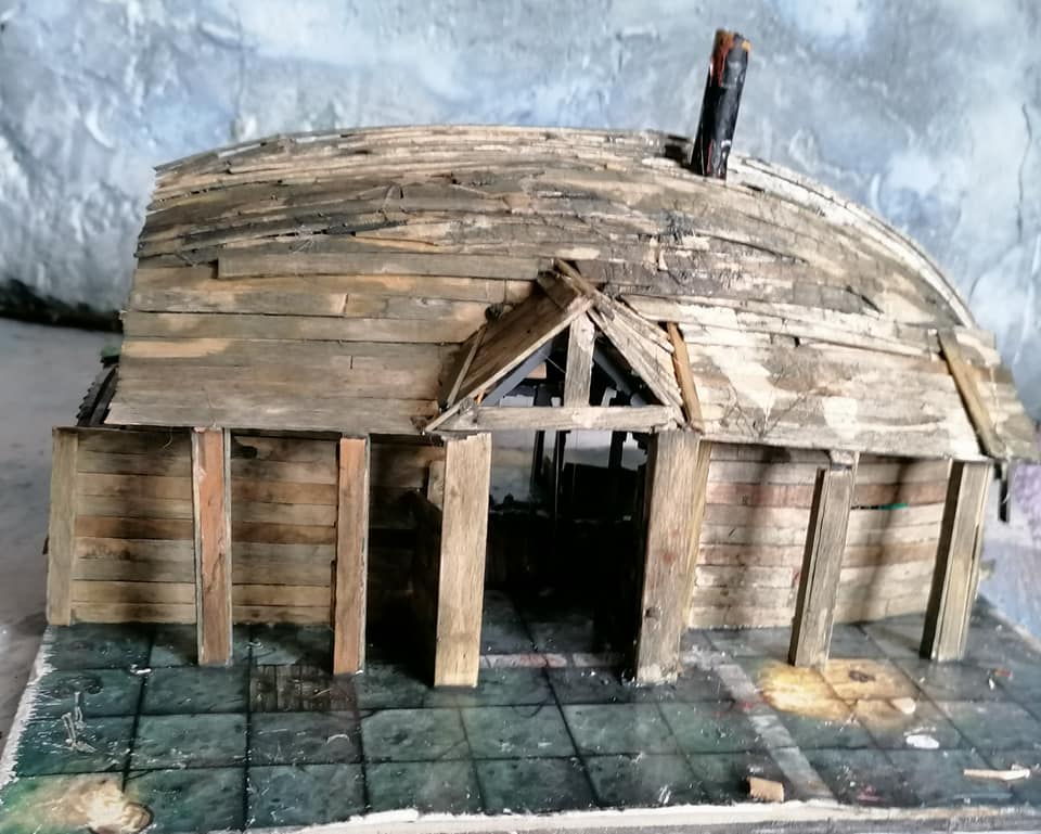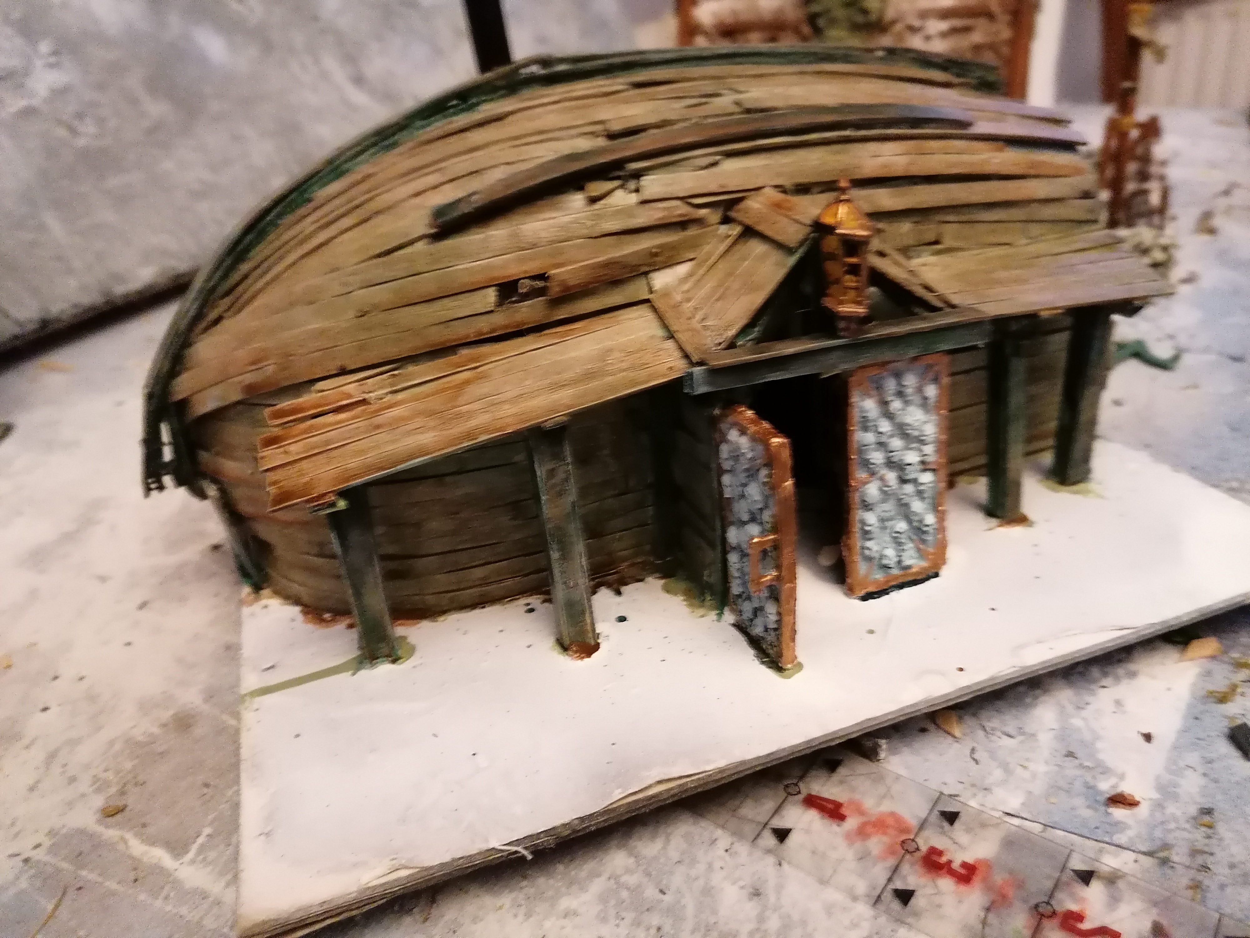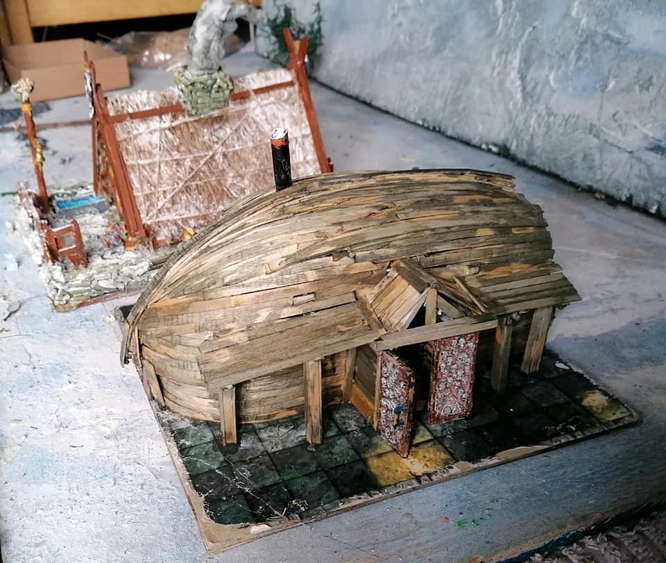 Gloomtide shipwreck Viking Longhouse starting to take shape with hull roof beams in place side lean-to and doors framework in place and panelling started on one side, waiting for glue to dry before continuing further… Time to peel the glue off my fingers and call it a day.