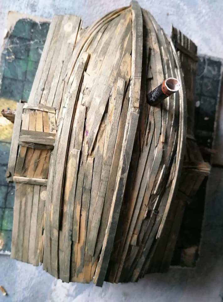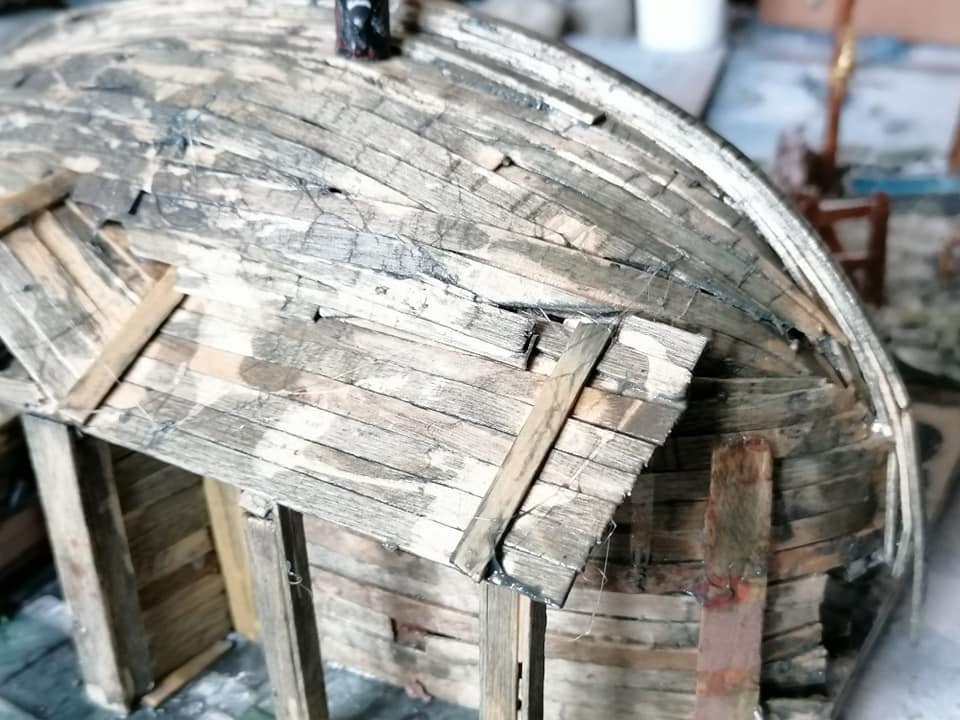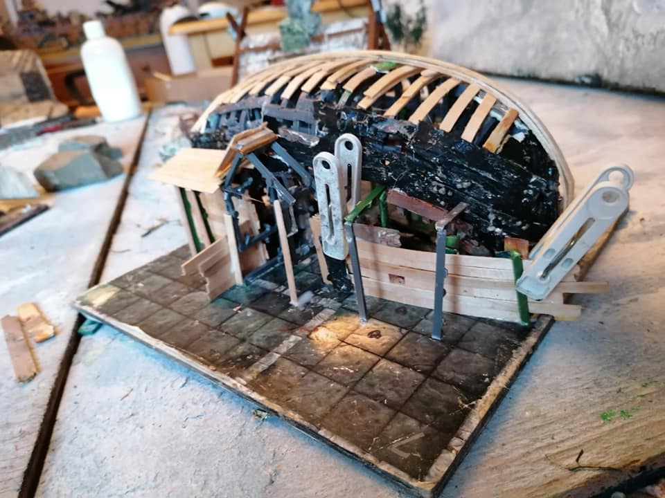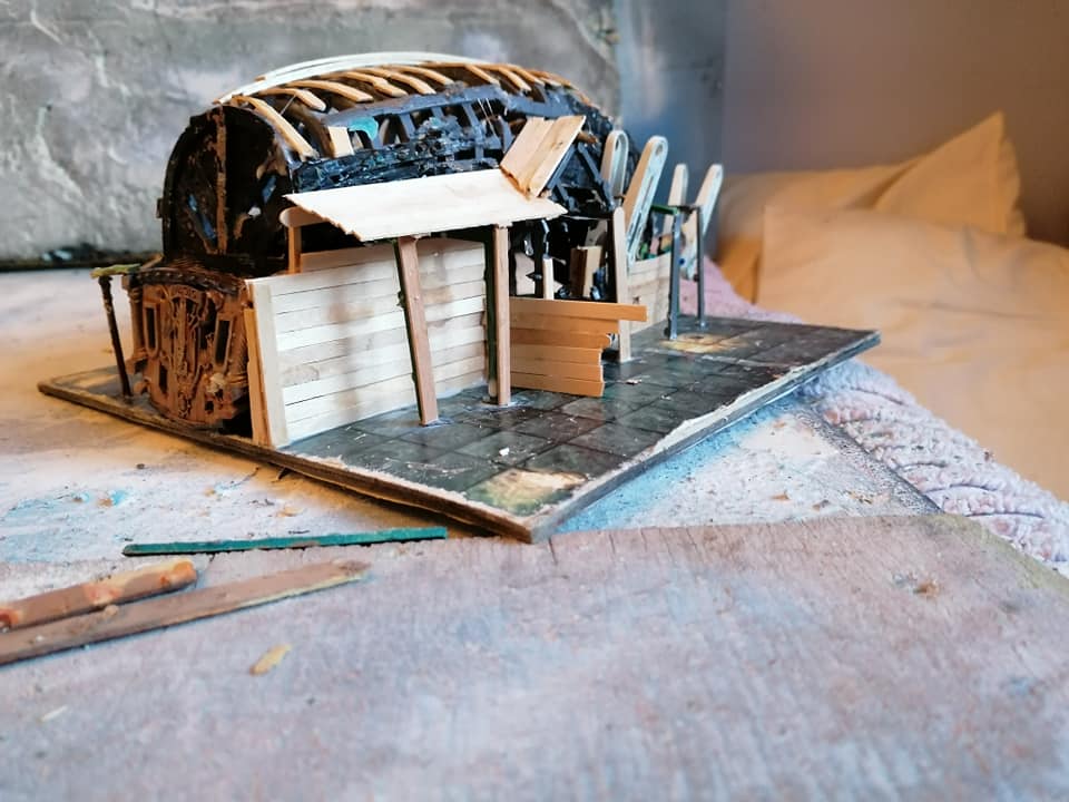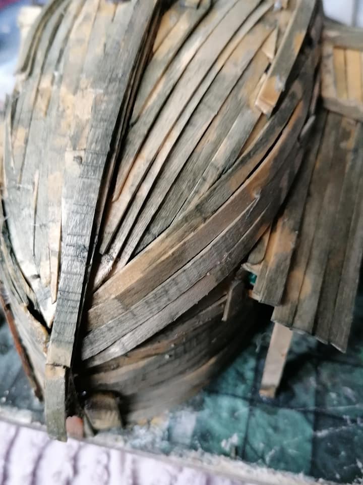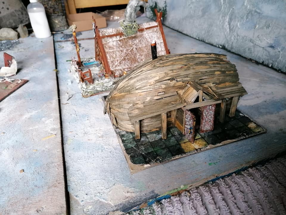 Gloomtide shipwreck Viking Longhouse starting to take shape with hull roof beams in place side lean-to and doors framework in place and panelling started on one side, waiting for glue to dry before continuing further… Time to peel the glue off my fingers and call it a day.