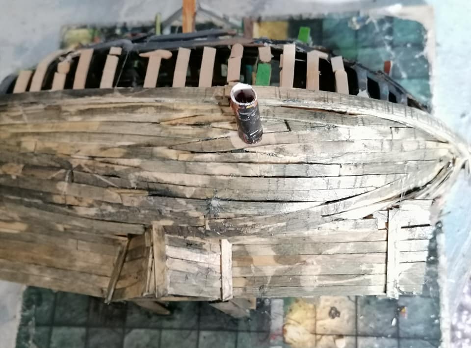Basic construction completed, though I’m not sure about the bow yet. The base itself still needs work and some painting over the basic wash to weather the wood.I’ve done a darker wash on the keel ect but I’m not sure if I should just spray paint the whole thing dark green from above and then weather it then, to seal any cracks ect. I’m not happy with the finish so opted to spray base coat the model. i checked my dark greeen, and there wasn’t enough of it, so i’ve primed the whole thing in white as a base which should seal the little cracks where i’ve glued sticks together to make beamsfor keel and uprights, but won’t hide the planking. i’ll paint from there, trust my gut feeling and see where it takes me.
