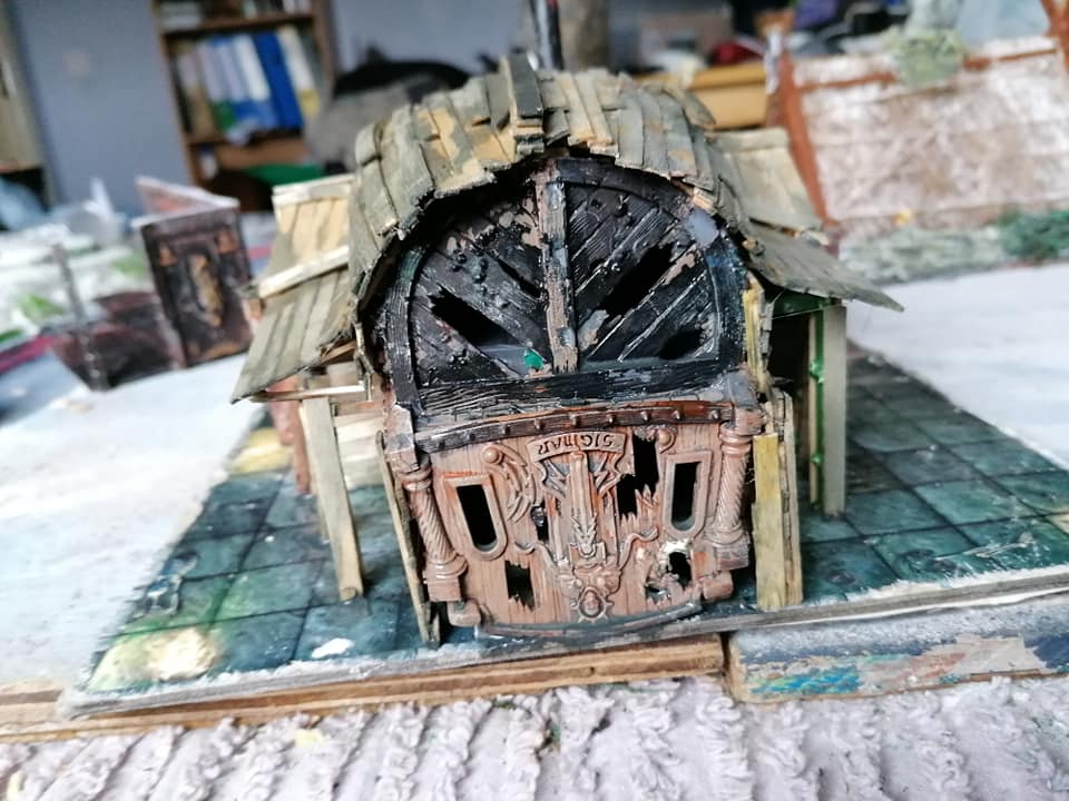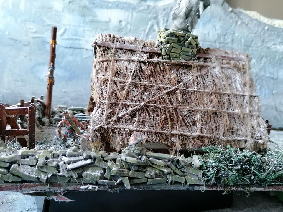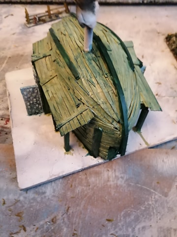 I’ve gone for Nurgle green for the planking, Caliban green for the beam work, and then a Orkskin wash over it all. I’ll probably give it a brown wash after to soak up a lot of the green from the woodwork.