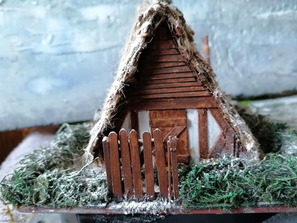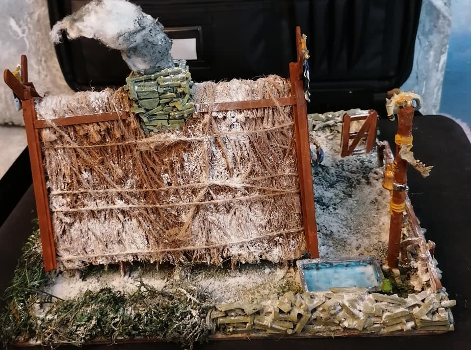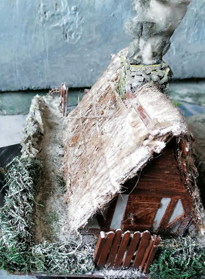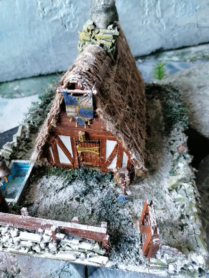 , which i opened and stuck the two big flaps together to make a peak for the roof, then cut the shorter ends into gables. I ended up cutting in half as it was just too big.Finally complete after a light flurry of snow so it matches the rest of my wintry Northern wastelands