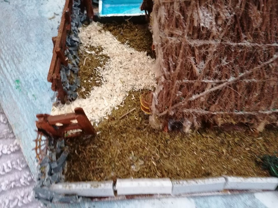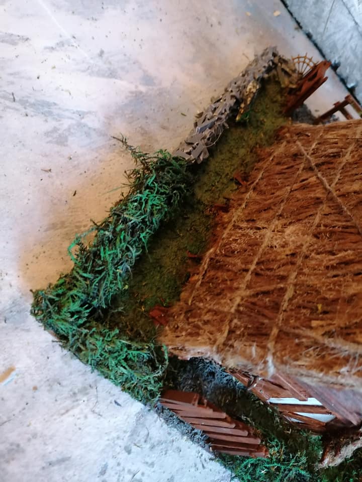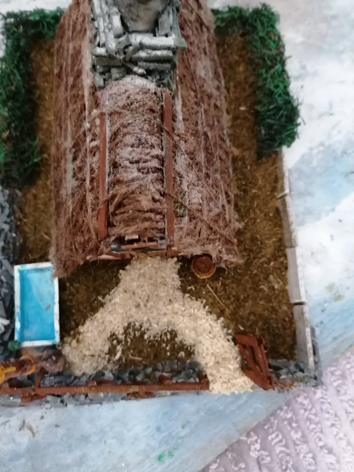 Spent the morning making grass flocking from moss and gravel from wood shavings, using an old herb grinder. Liberally coated the base with it, and will wait for it… and the pva water in the trough to dry before shaking off the excess