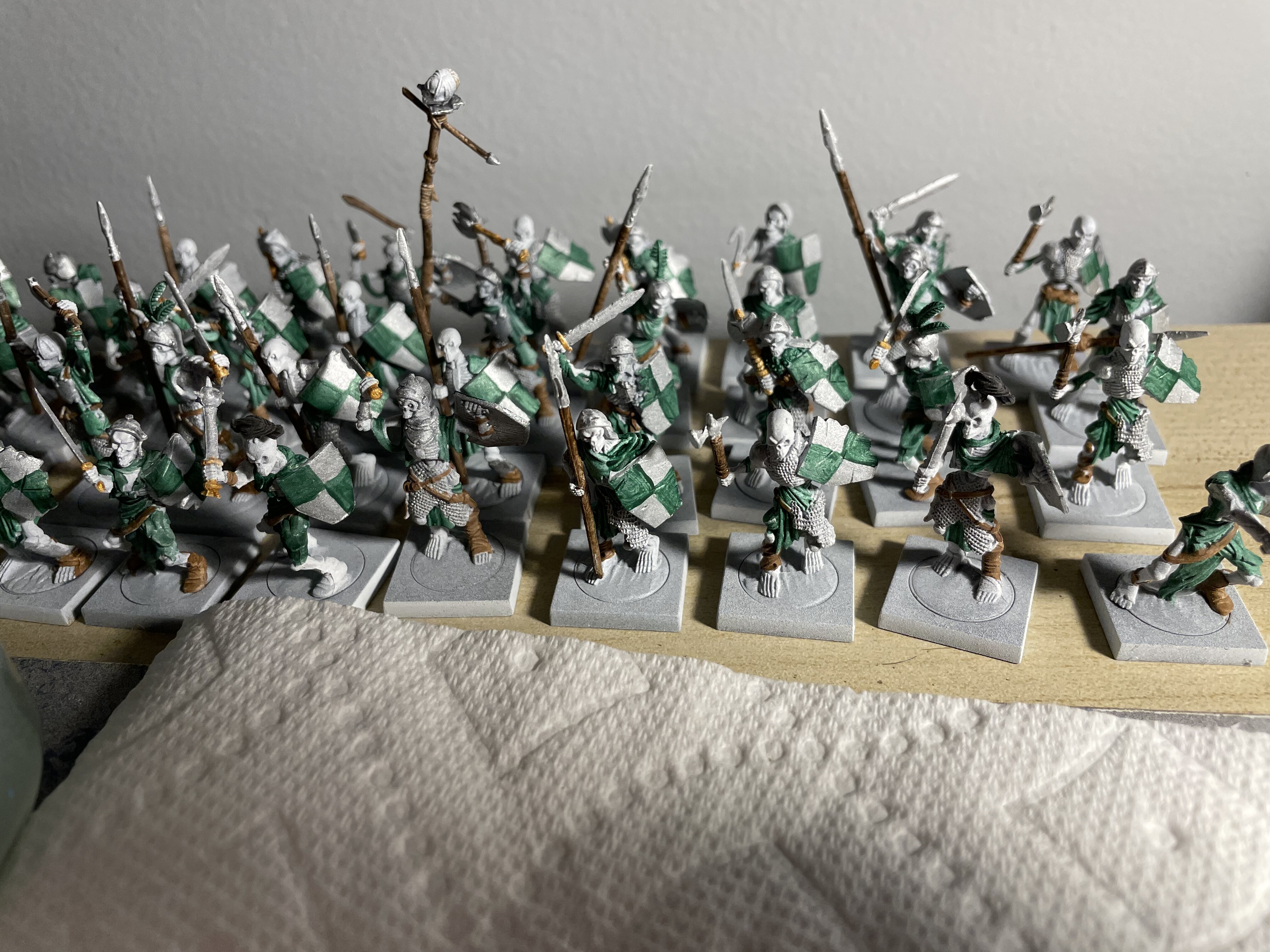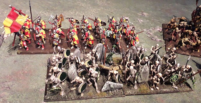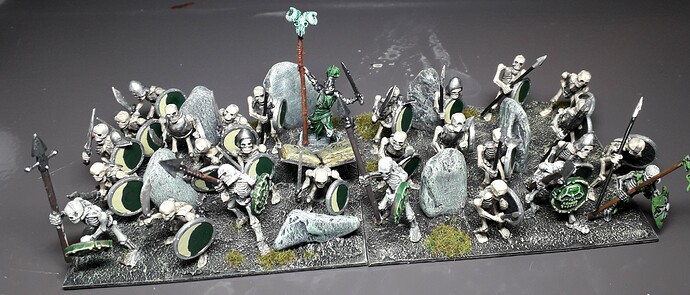 Thanks, guys. As I’ve documented on another thread, this my first attempt at painting KoW armies–I’m racing to paint up two mega armies for my sons. I’m hoping to be finished in the next week or so. The basing is rough but temporary (as I suspect they’ll change their minds on hordes vs regiments vs troops). But I’m shooting for marginal tabletop quality with the painting so they can get a feel for the pageantry of the KoW experience.