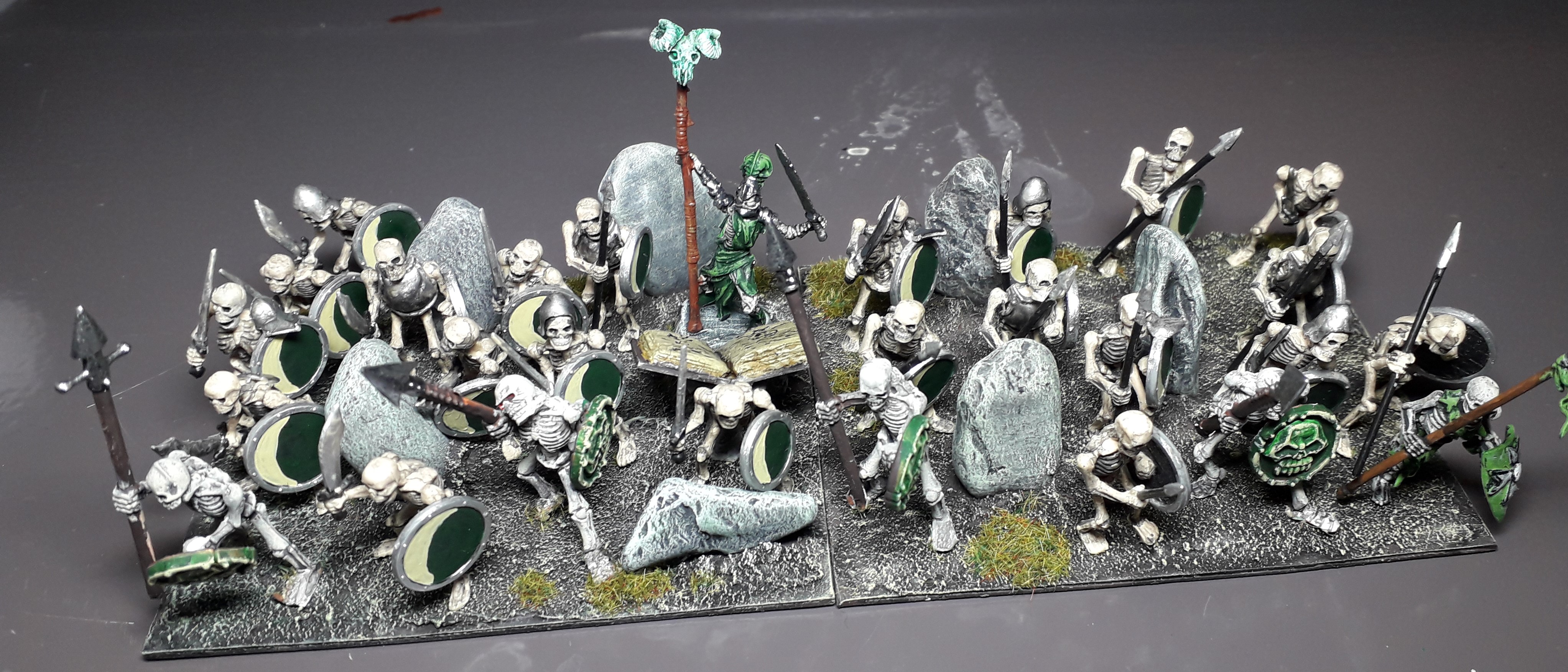for my other horde of skeletons (here in the back) I used a plain “quartered” colour scheme. It was kind of an experiment as I don’t usually use either red or yellow in my undead army, but the majority of the models had already been painted, so I only had to redo them.