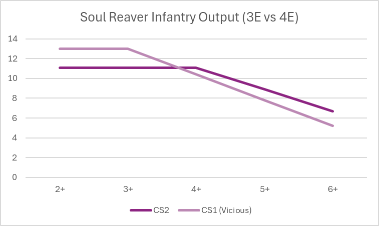 And another unit that’s getting batted around, I’m here for the changes to Soul Reaver Infantry. CS2 should be rare (and is already present in the Undead list in several places), so internal balance is restored a bit but also the swap to vicious is not all downside. Behold, charts!