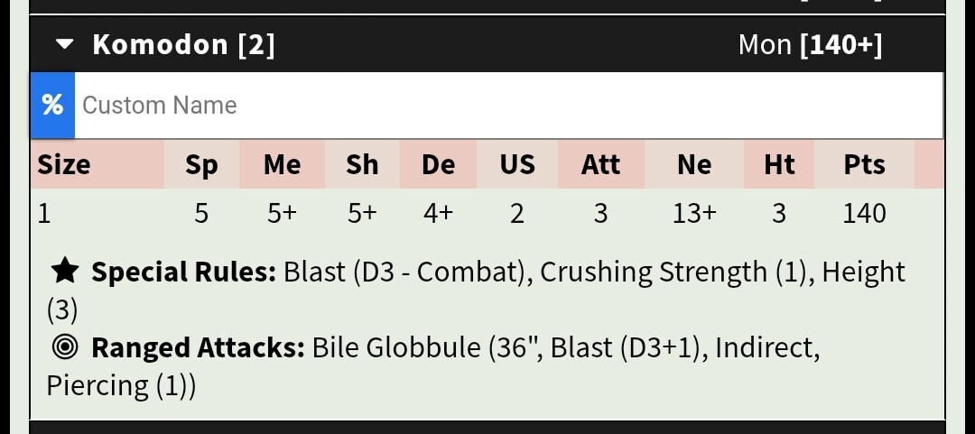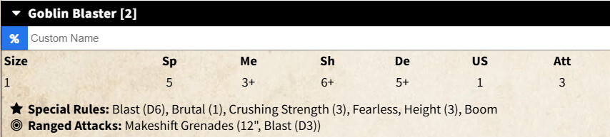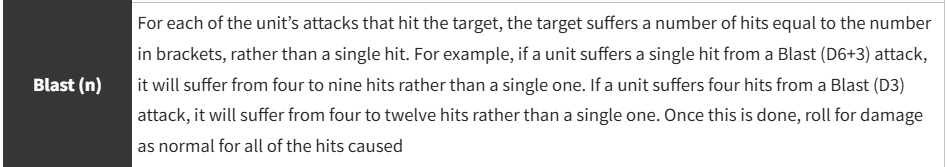 In another example, the Goblin Blaster have Blast(D6) in its special rules section, and the ranged attack profile has Blast(D3). however looking back, there’s not Blast(D6 - Combat) so the rules seem blurry since Blast(D6) is in its special rules section it should apply to its ranged attacks too, and the only reason we don’t do so, is because the Blast (D3) in the ranged profile makes it more obvious that the intent is D3 only, if not it will be strange to have Blast(D6) and Blast(D3) in the same attack.