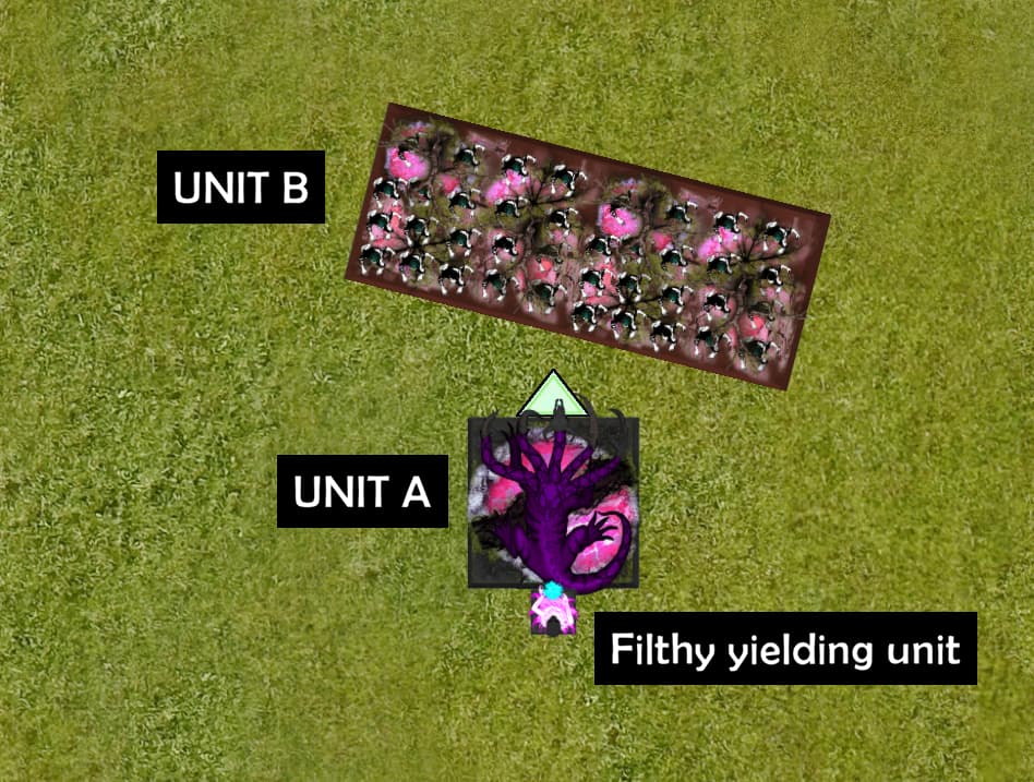 Unit A moves up so it’s front facing is within the forest but it’s center-point is not.
