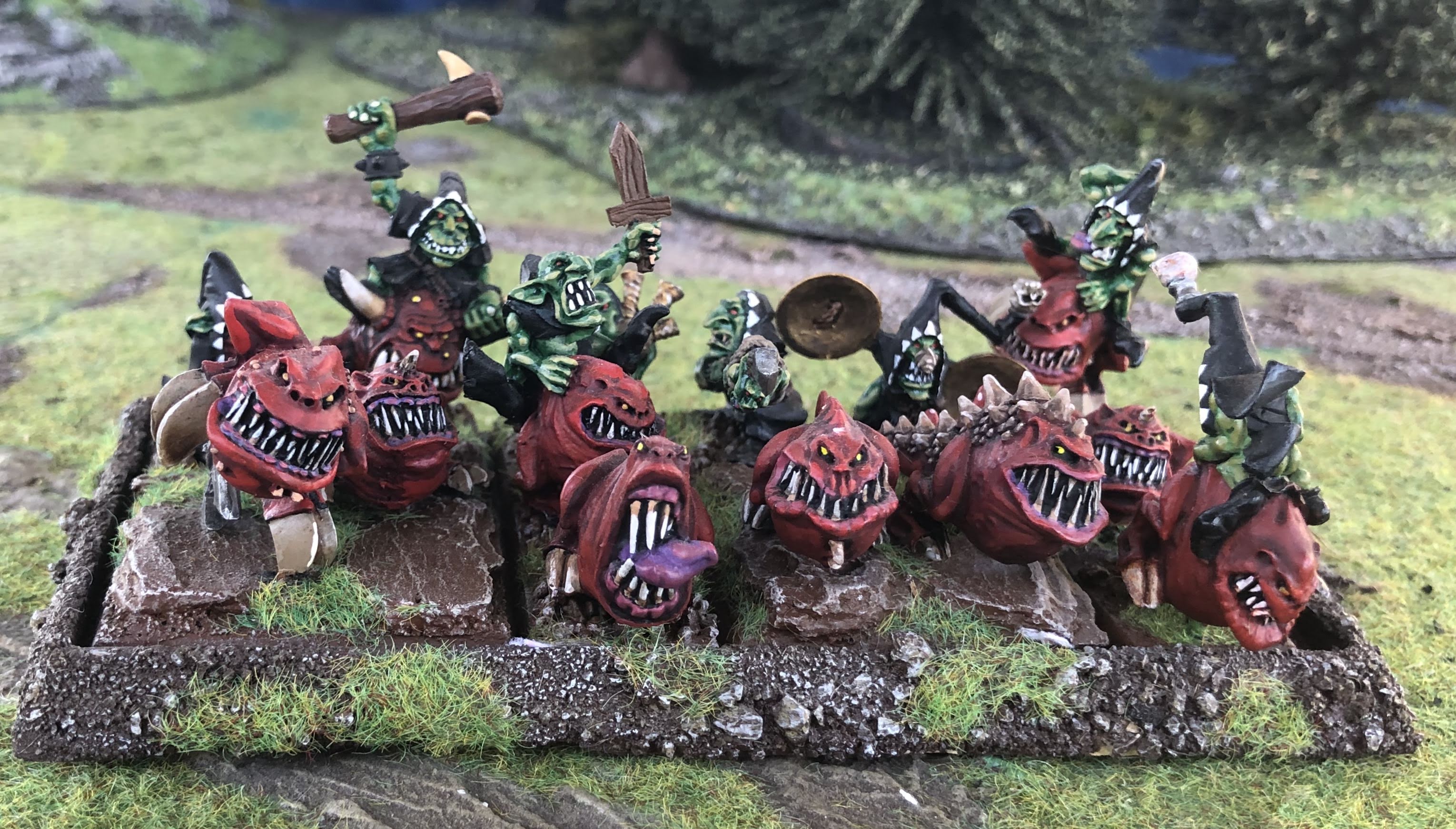 Gobbo chariot horde. Note the interchangeable base. With opponents agreement, I use the smaller base as a regiment (It’s the right size but oriented wrong which is to my own disadvantage. But hey the model is cool!) and the larger tray when playing it as horde (Correct size)