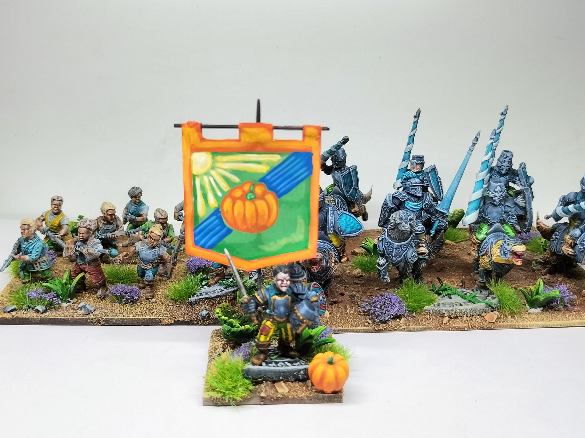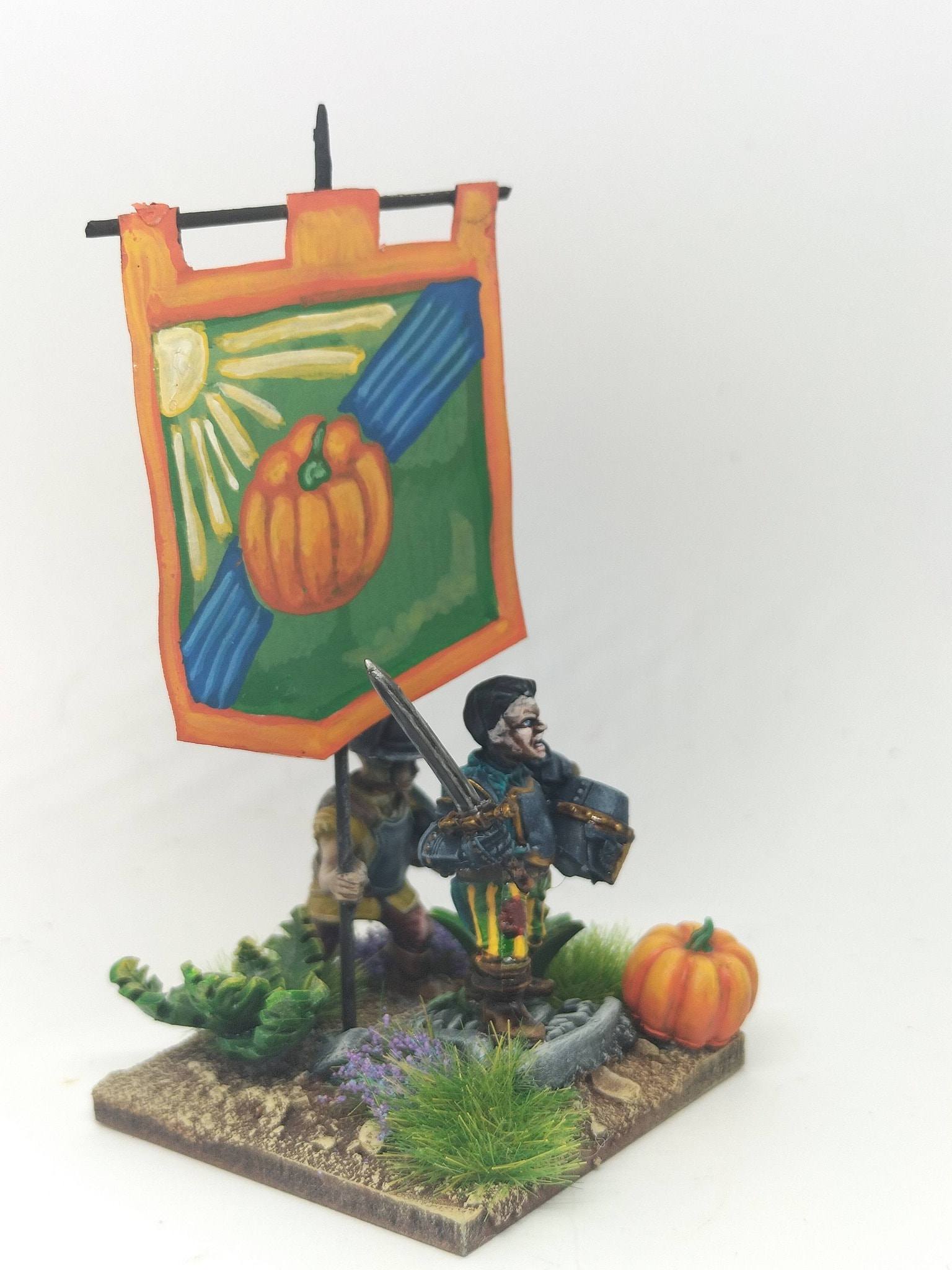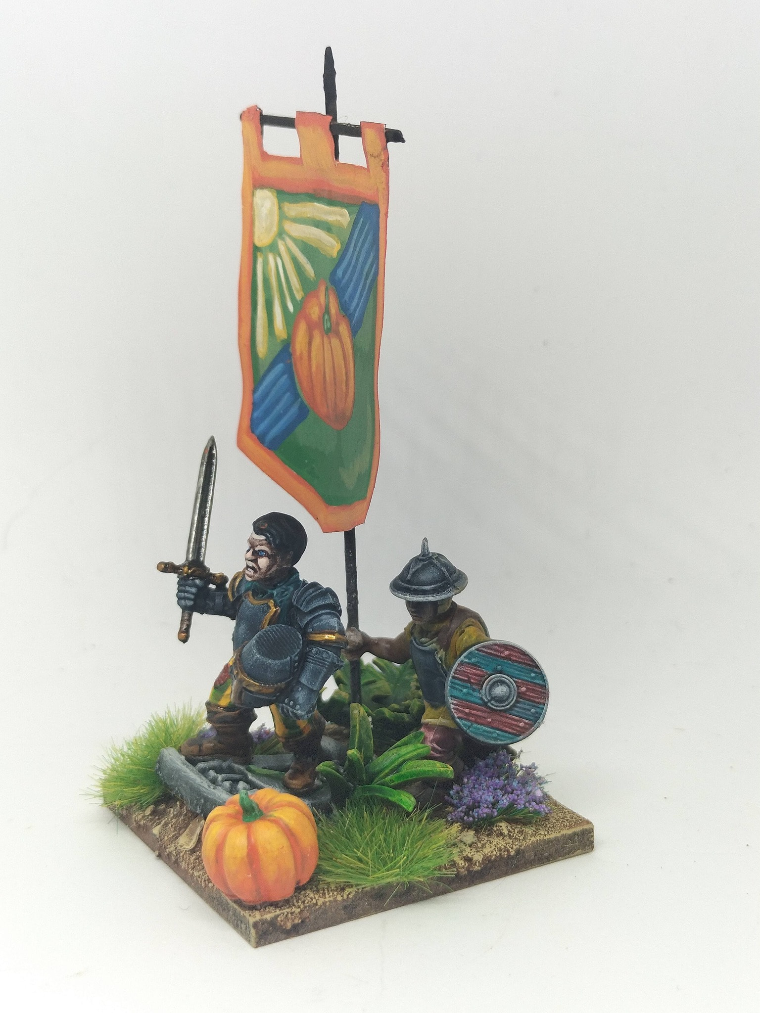 I then went on to paint the Main Man, I converted a set of stalwart arms to make the model look as though he has taken his helmet off while inspiring his troops. I made a scenic base from the Salamander bits and after reading the Stand at Callenspire I chose to put a Pumpkin on his base, the Standard bearer is a normal Halfling with a hole drilled through her hand and a wire spear placed there to make a banner pole.I decided to paint the banner to represent Aerons affiliation to the Shire, sun , grass, water and Pumpkins