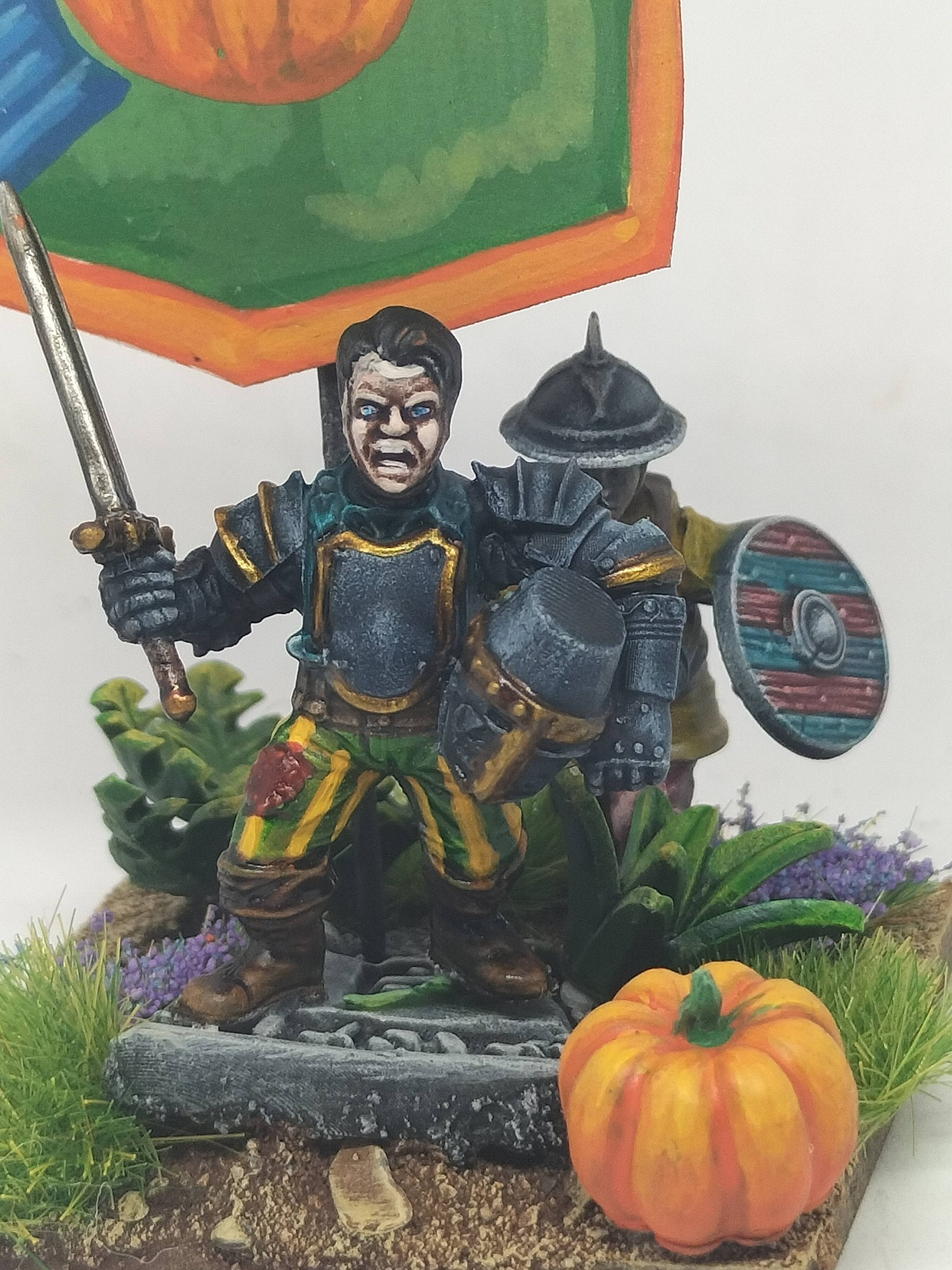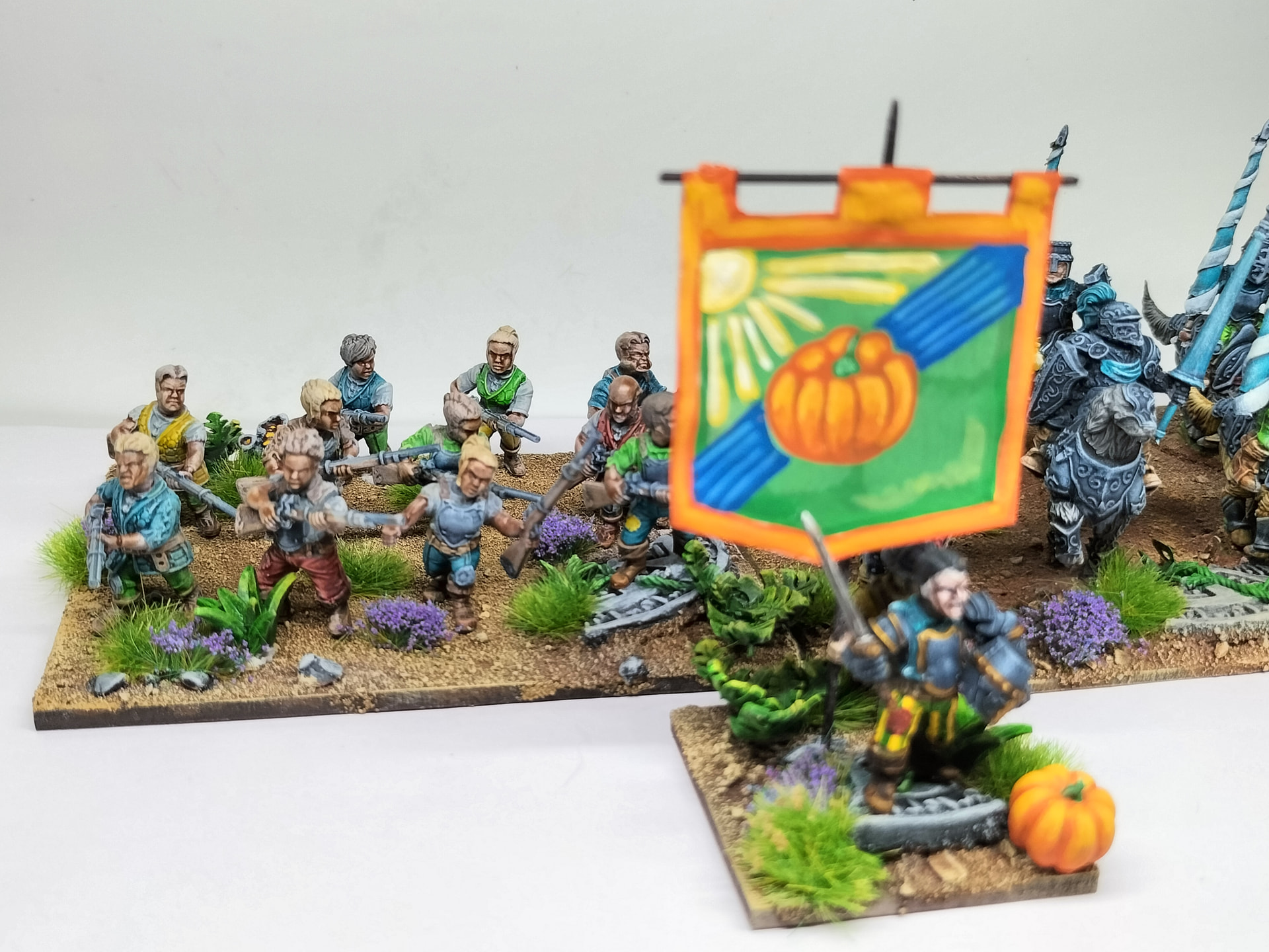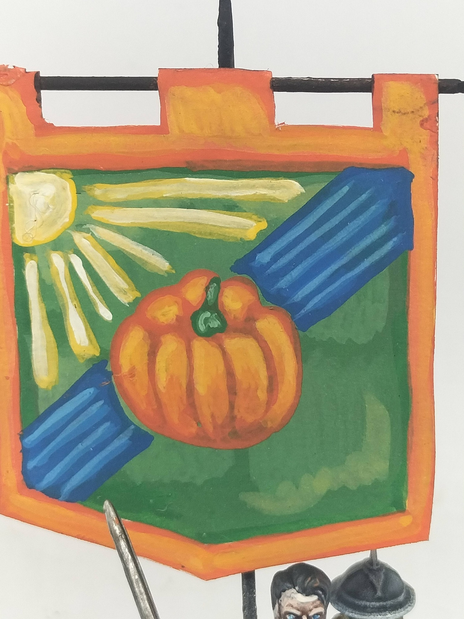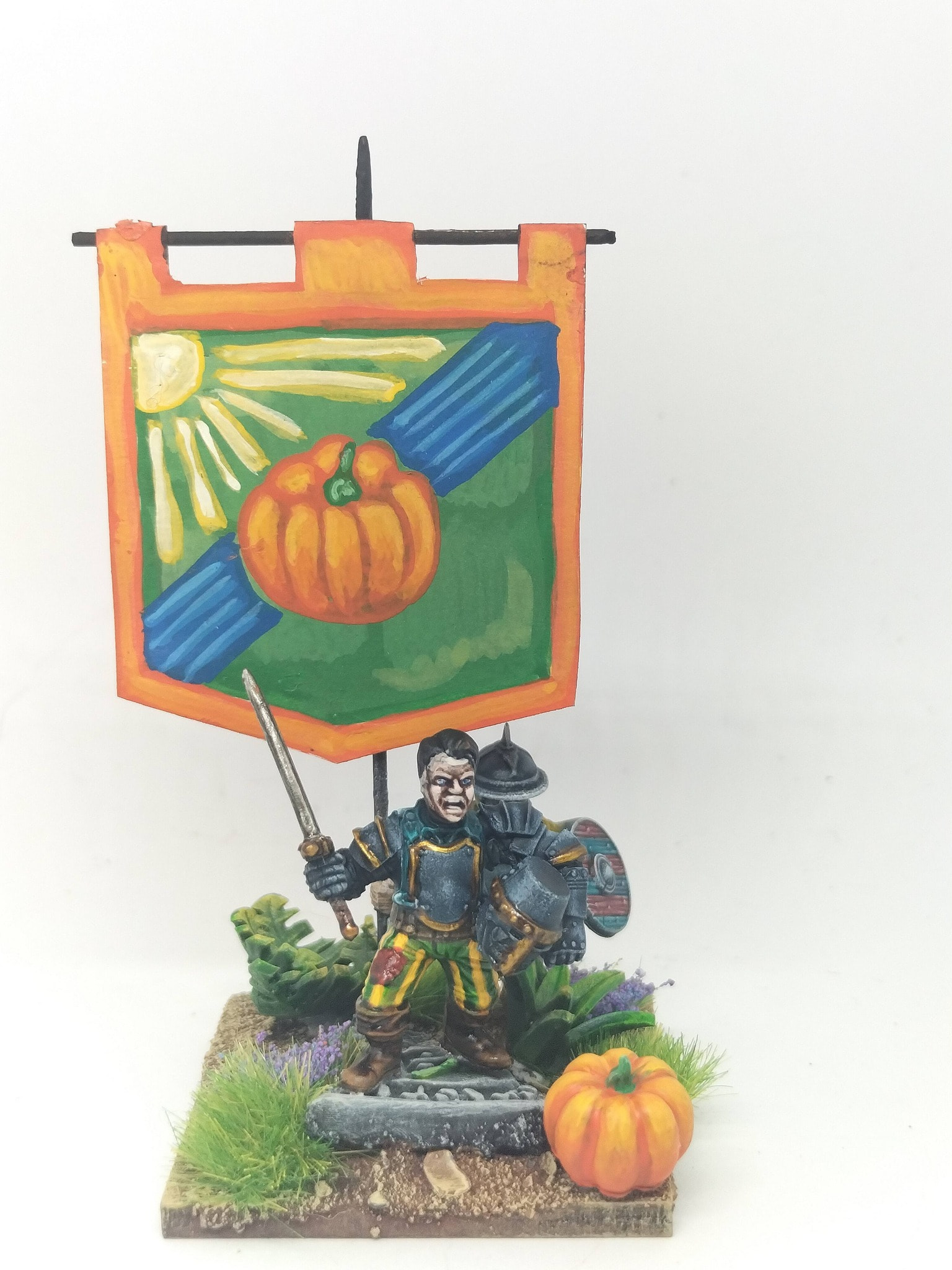 I then went on to paint the Main Man, I converted a set of stalwart arms to make the model look as though he has taken his helmet off while inspiring his troops. I made a scenic base from the Salamander bits and after reading the Stand at Callenspire I chose to put a Pumpkin on his base, the Standard bearer is a normal Halfling with a hole drilled through her hand and a wire spear placed there to make a banner pole.I decided to paint the banner to represent Aerons affiliation to the Shire, sun , grass, water and Pumpkins
