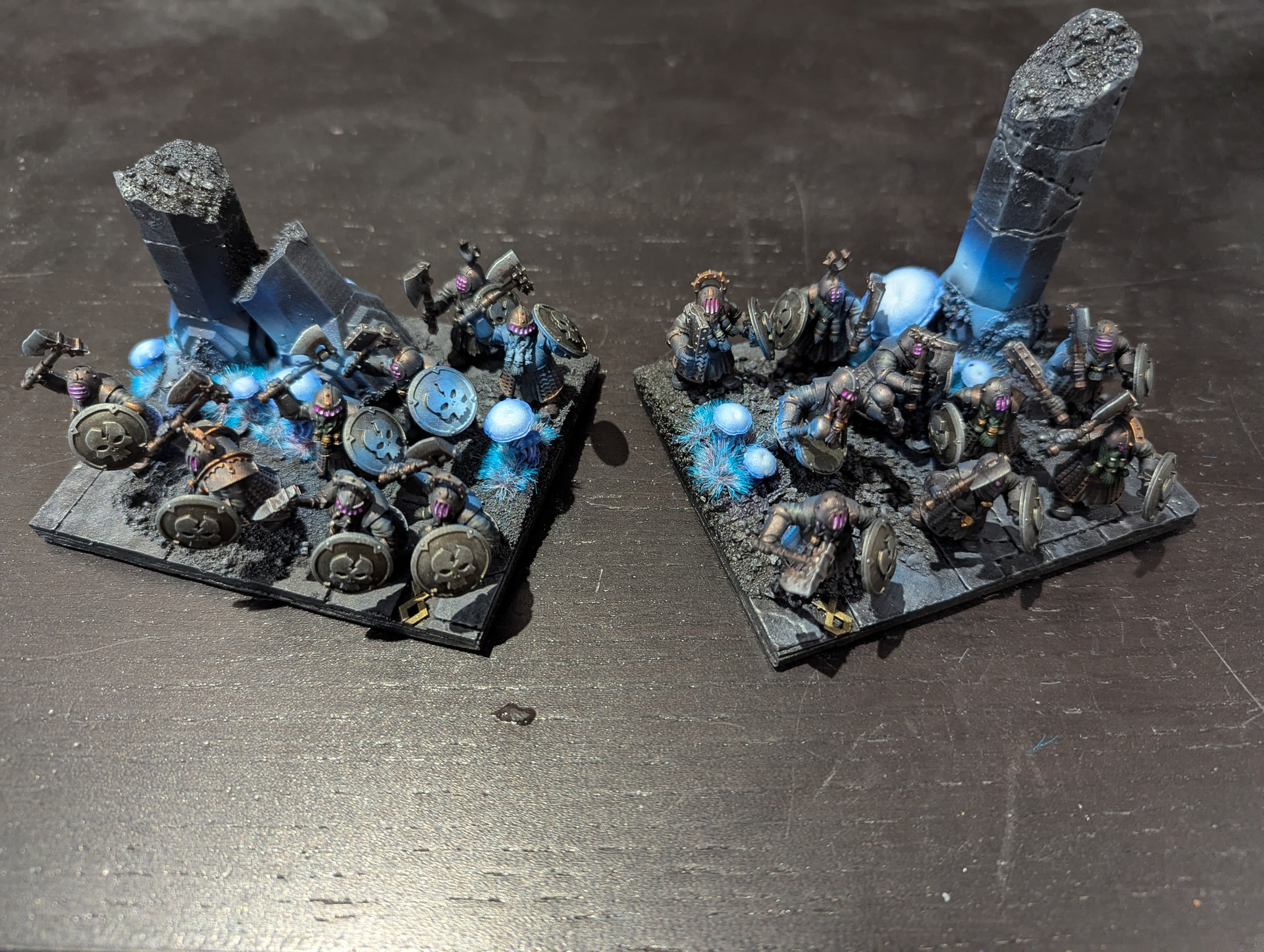 Heyo, I have a minor update while I’m trying to find out what would be the best next step to work on. Logically, it’s finishing the bases (close gaps, add smaller debris, test place some flora), but also I’m not really in the mood. The other things are working on the Black Souls, which I prefer, so I tried different light colors for their eyes/helmet eye slits. Initially I wanted a bright, cold and soulless blue, but didn’t achieve a good result. So I changed to a reliable alternative, purple. As long as it works with the dark and blue base scheme that I’ve planned for the bases, I’m happy. The Black Souls still lack some colors, but it’s coming together satisfying