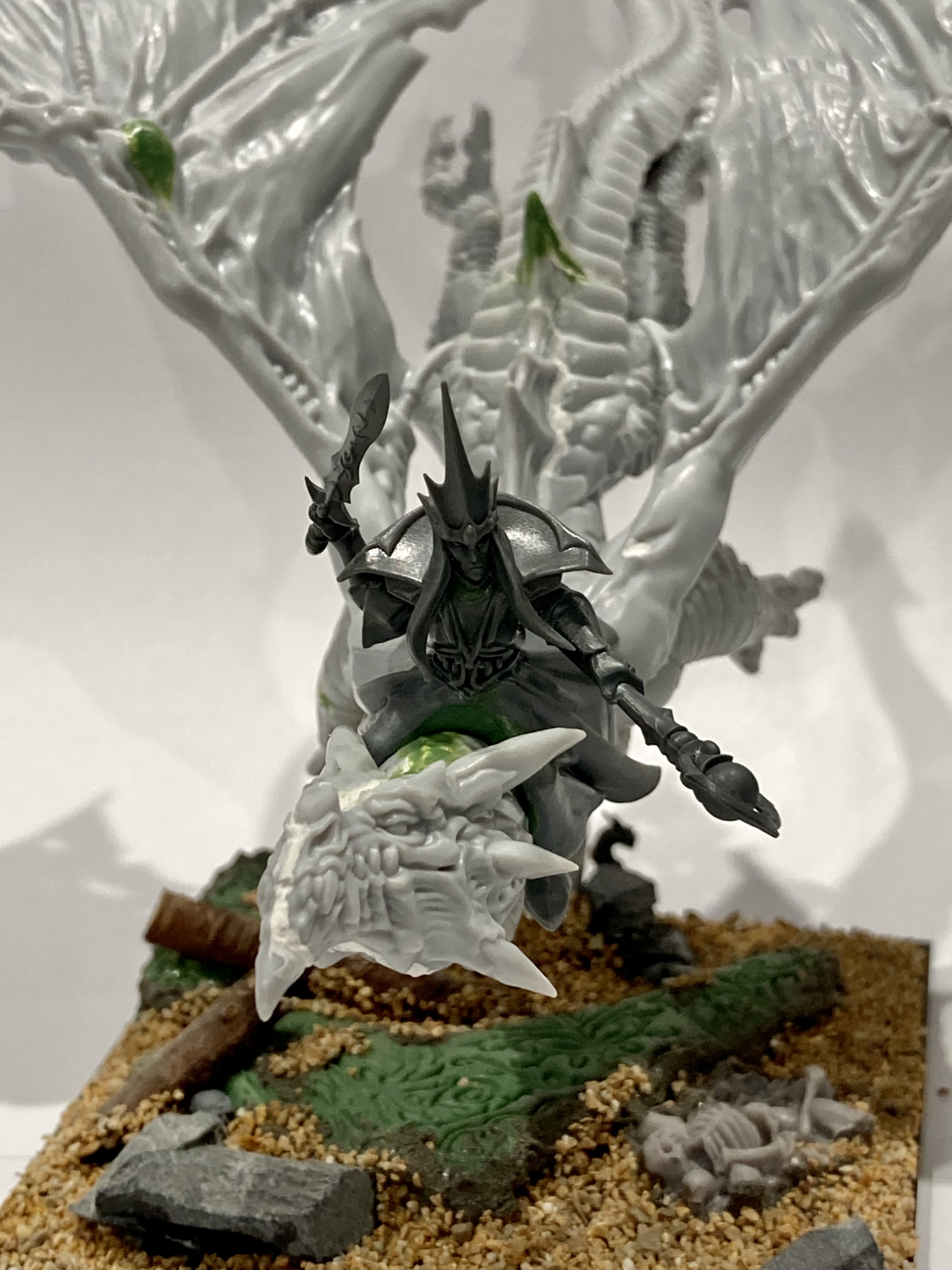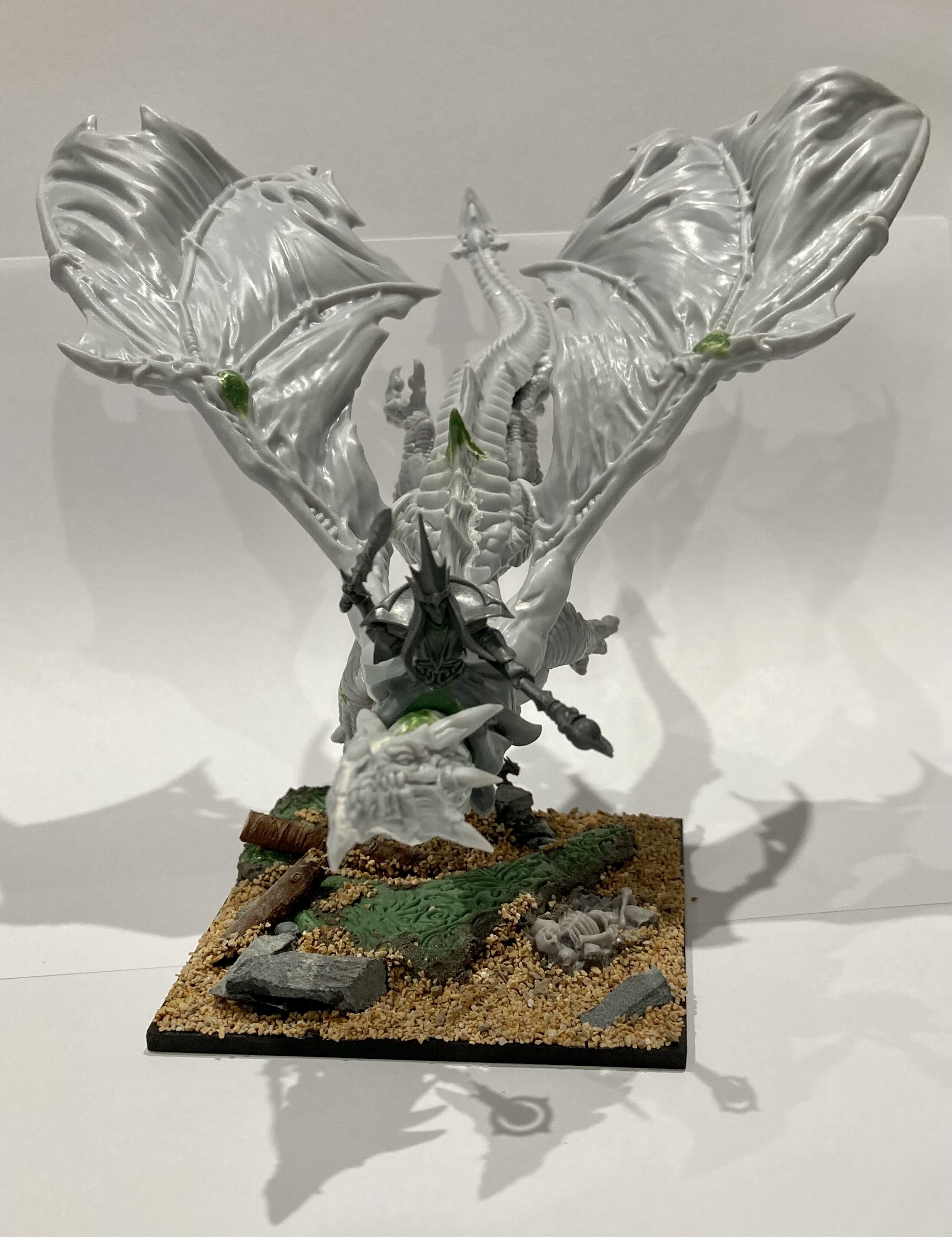 I picture him flying over the dragons lair (feeding ground) amongst an old abandoned temple in an enchanted glade. I think I will paint the base seperate from the dragon first.