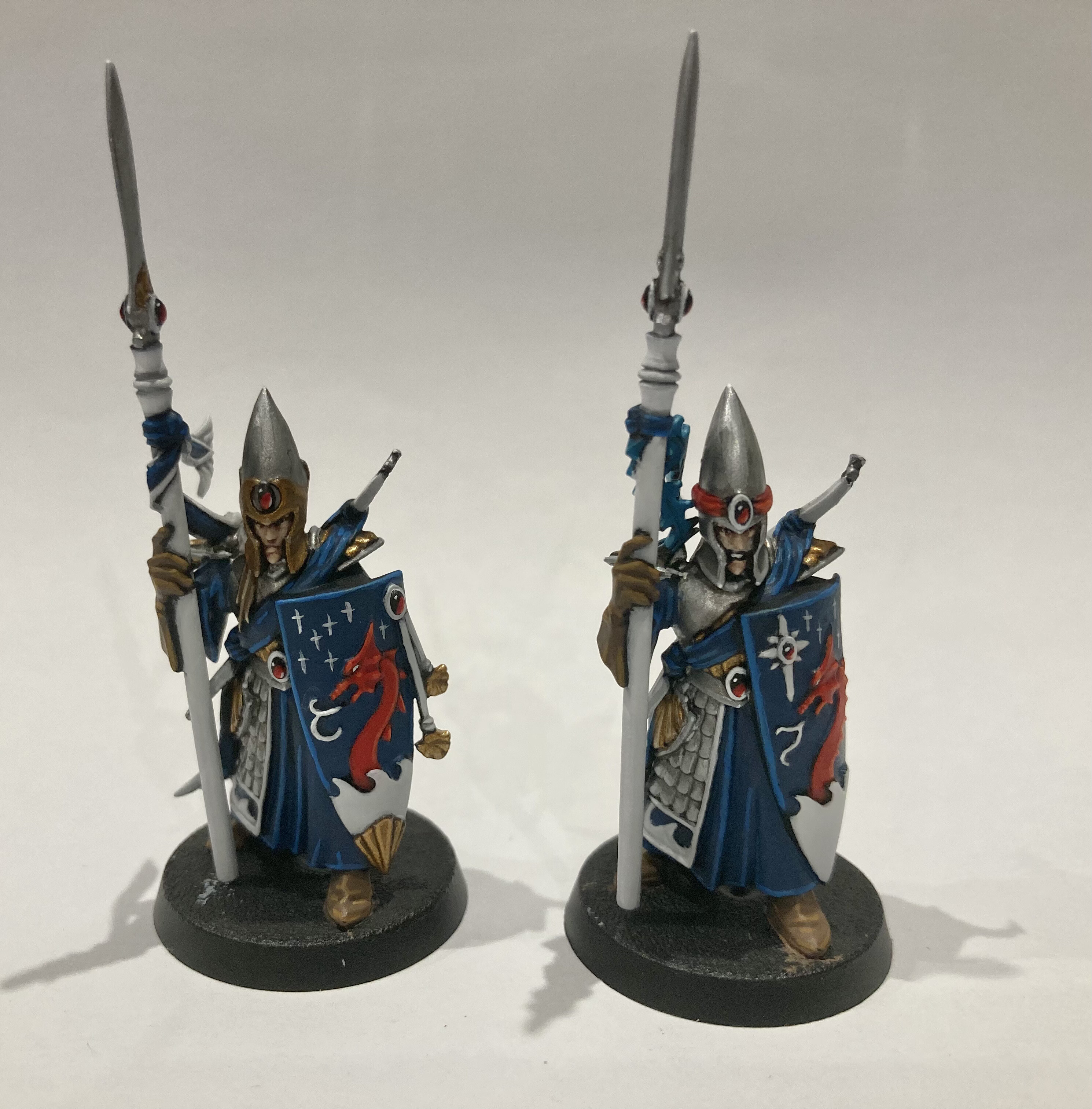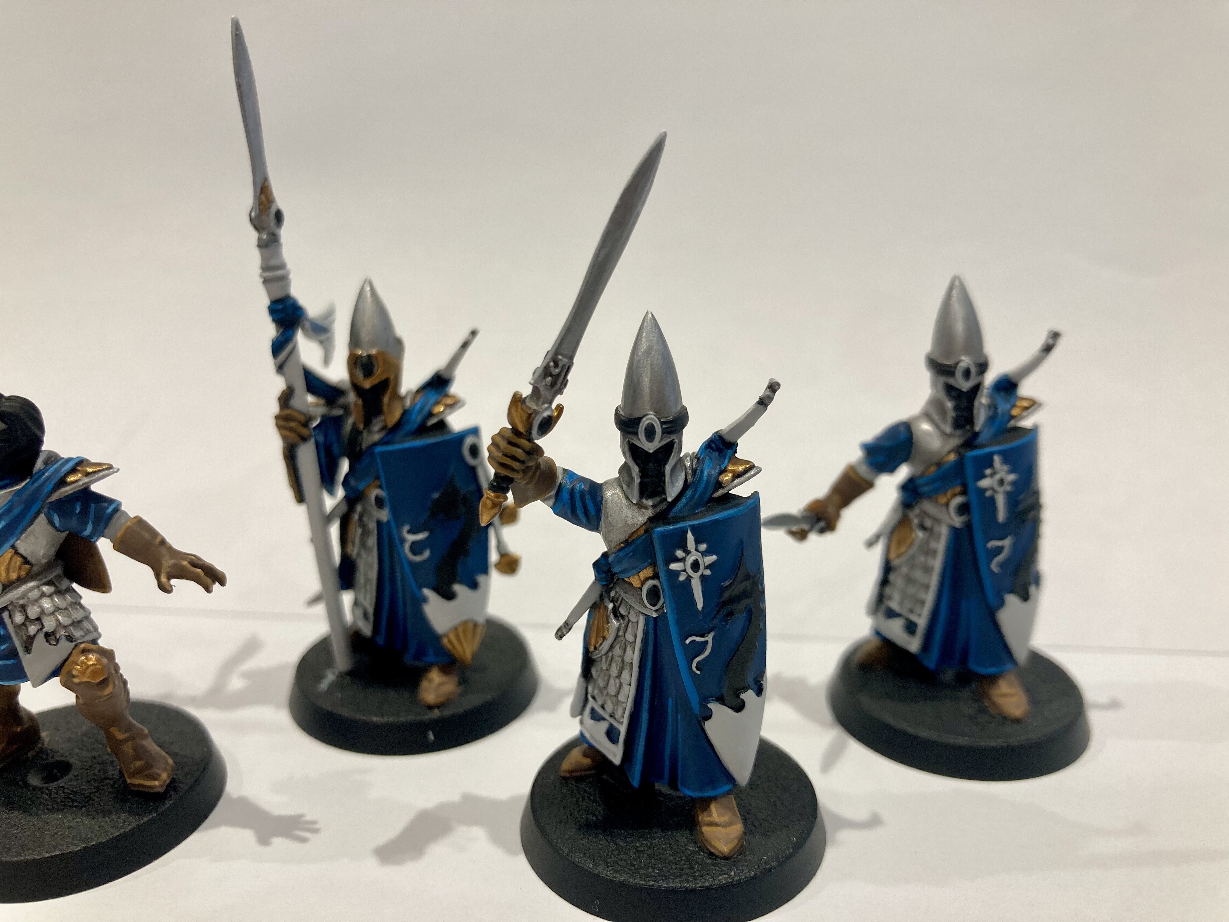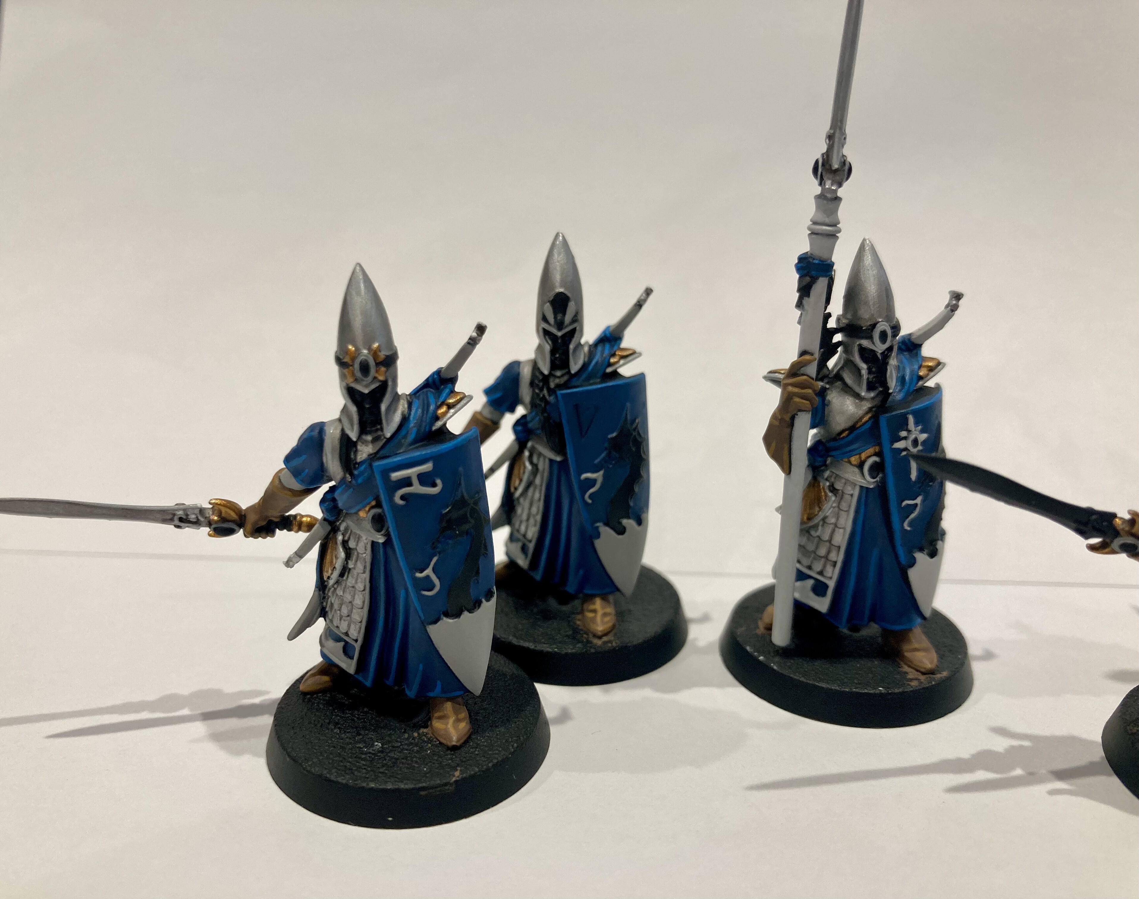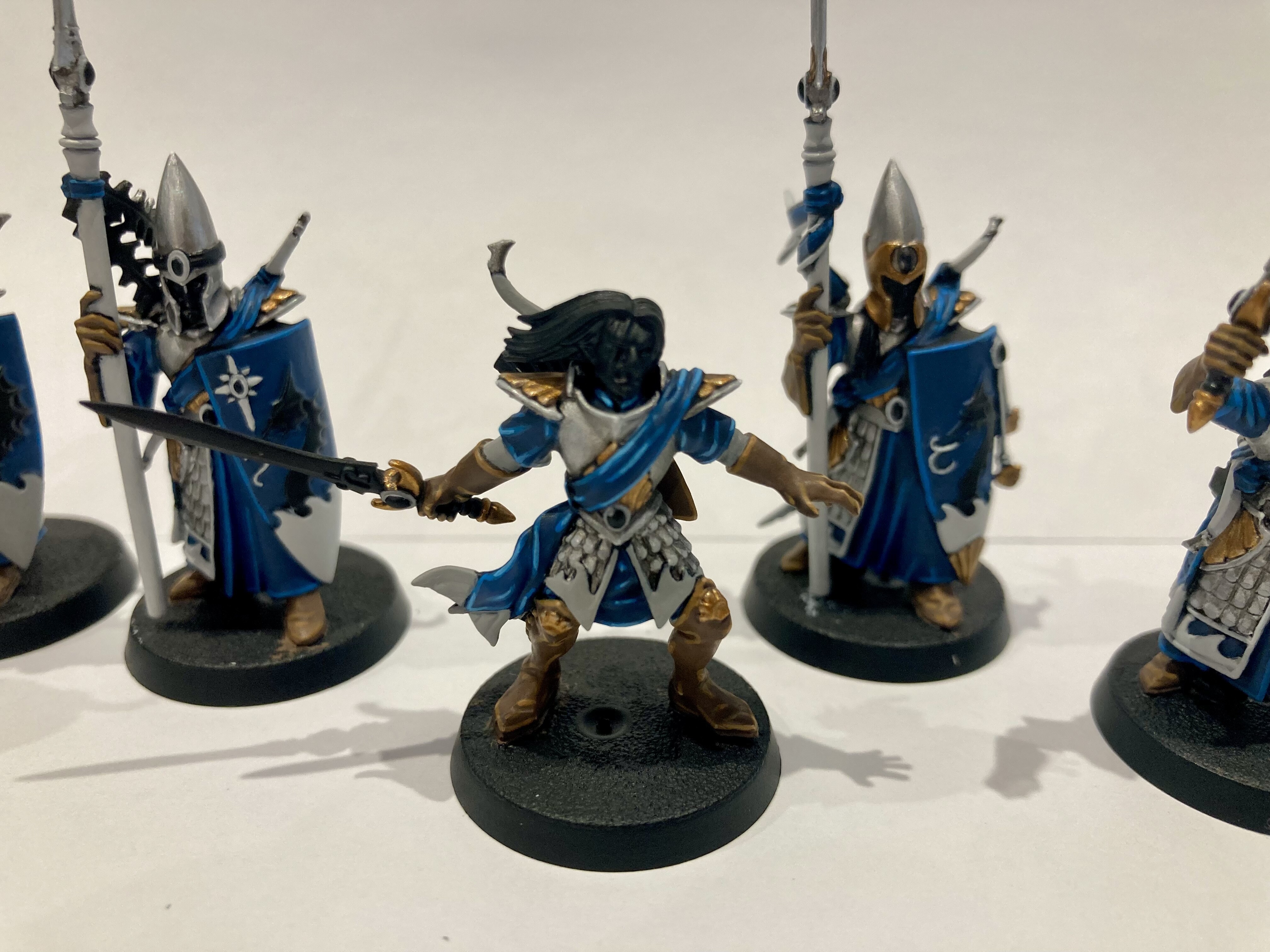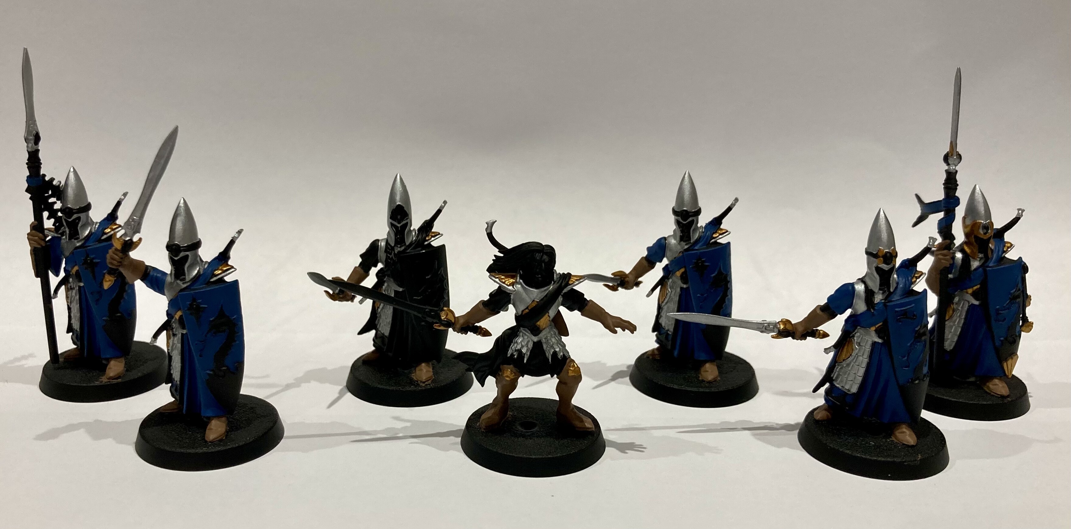 A war band of sea guard with a few base layers down. I don’t like painting over a black undercoat anymore. However, these guys will be joining my existing sea guard when I multibase them, and they were undercoated black several years ago. Most of these were converted with a sword arm using the old GW shadow warriors kit (ran out of spears!).