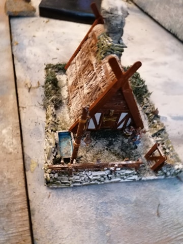 Longhouse tavern project is finally complete, apart from the Landlord and his dog models which i’m still waiting to arrive. The WIP pics are in my terrain post, but i thought i’d stick one pic here of the end result… not bad result for a house made from a waste cardboard box, if i say so myself. i’m pretty pleased with the outcome.