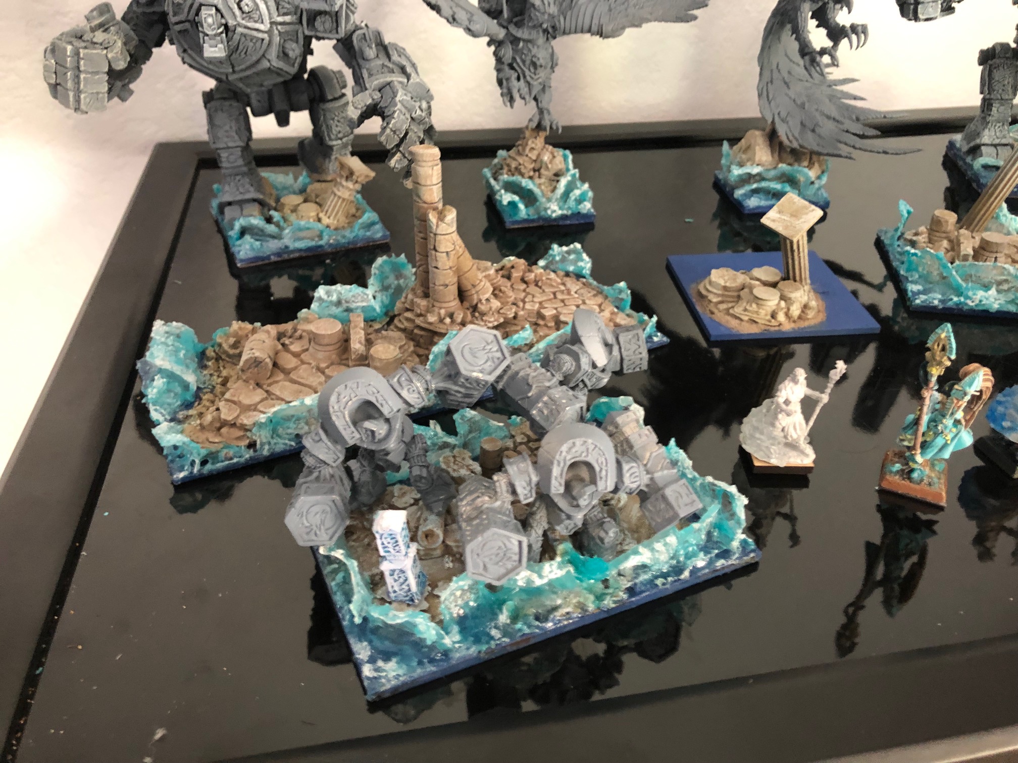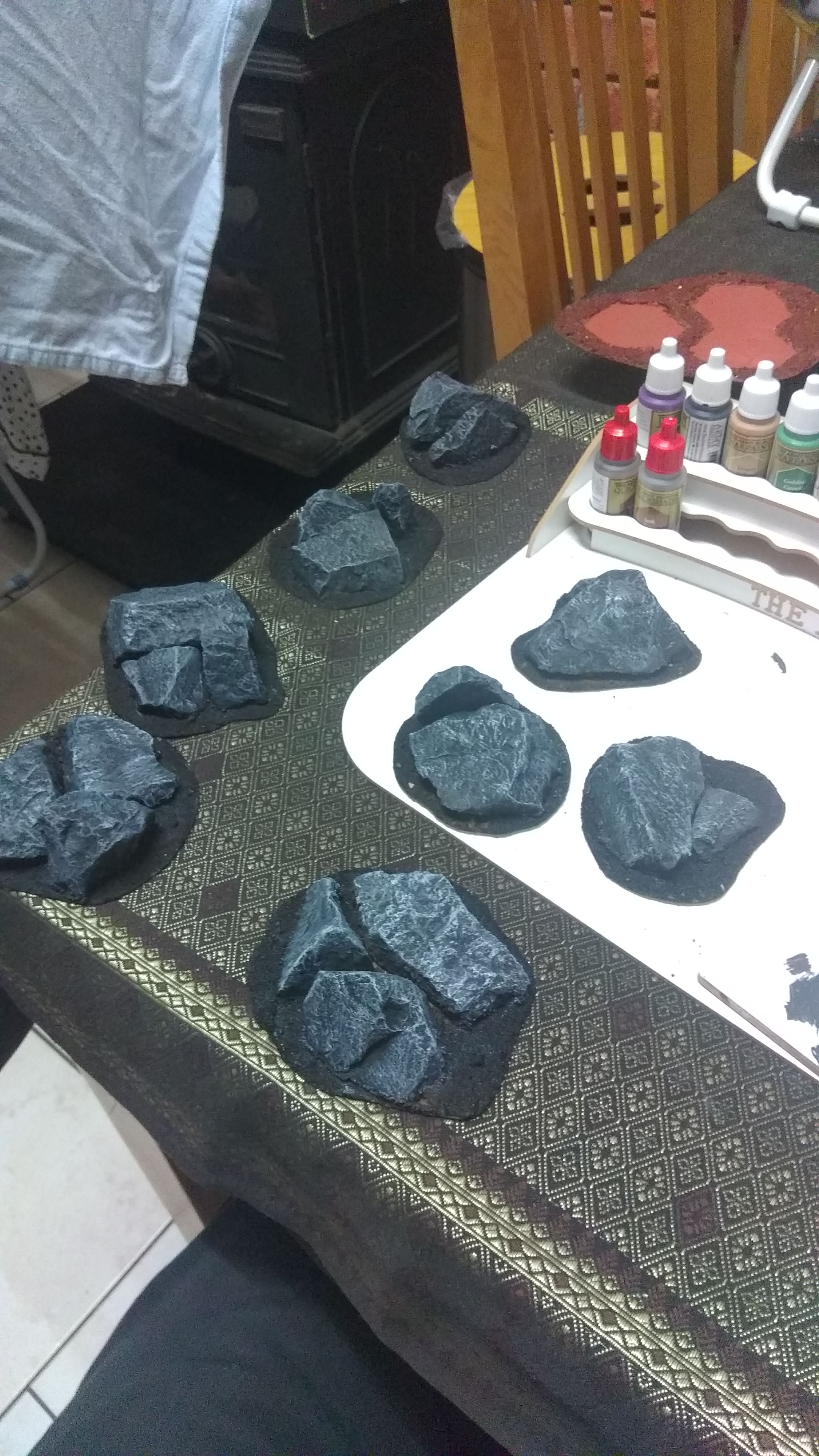 These are dead easy to do, glue stones to cardboard, sprayed black, wetbrush Eshin grey, then dry brush Ulthan Grey.