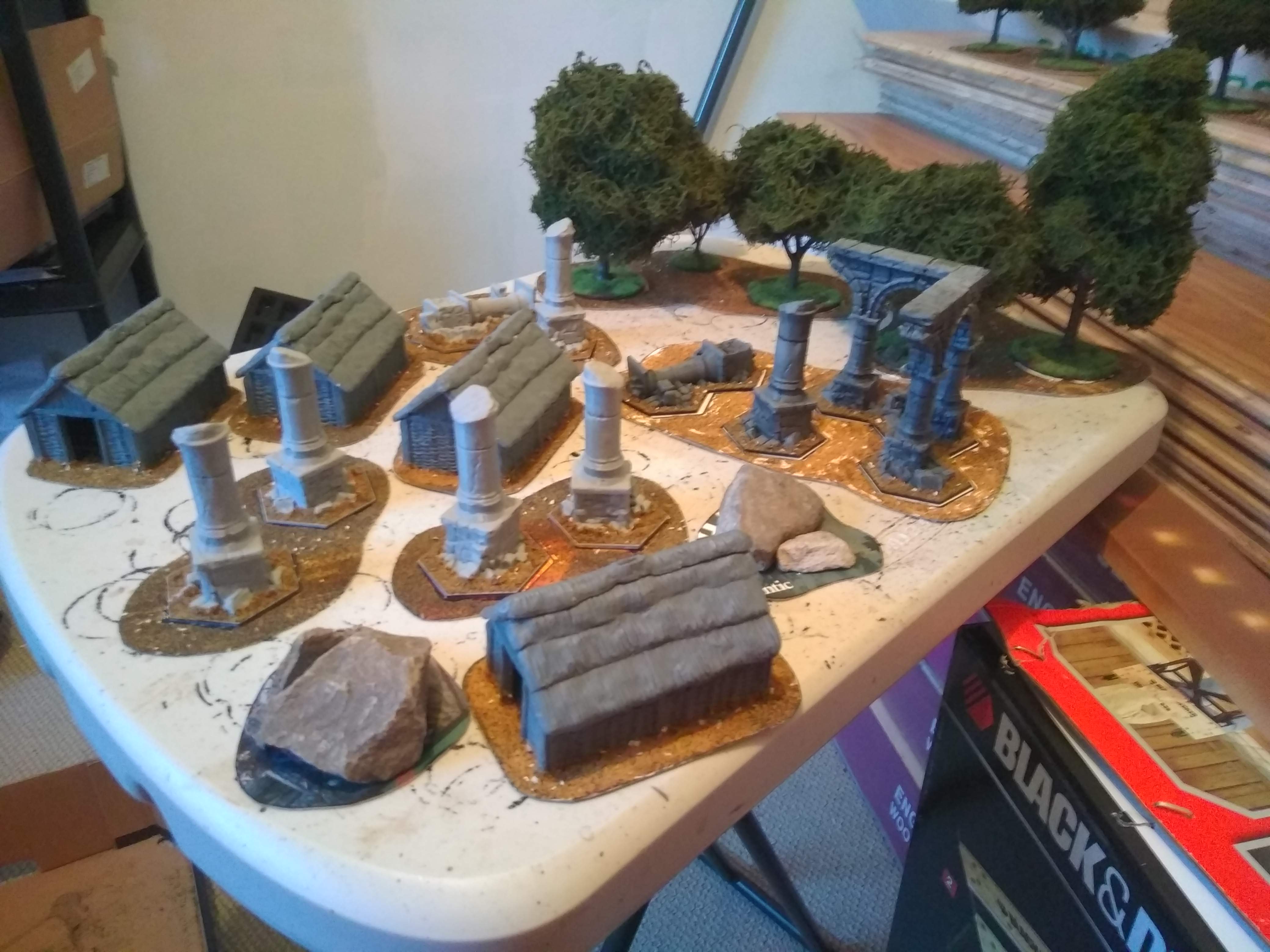 Been working on my terrain, 4 ruins, 4 pieces of woodland, 4 Saxon houses, and 8 rocky outcrops. Individual Ruins and trees can be moved off to help units navigate through/over them.