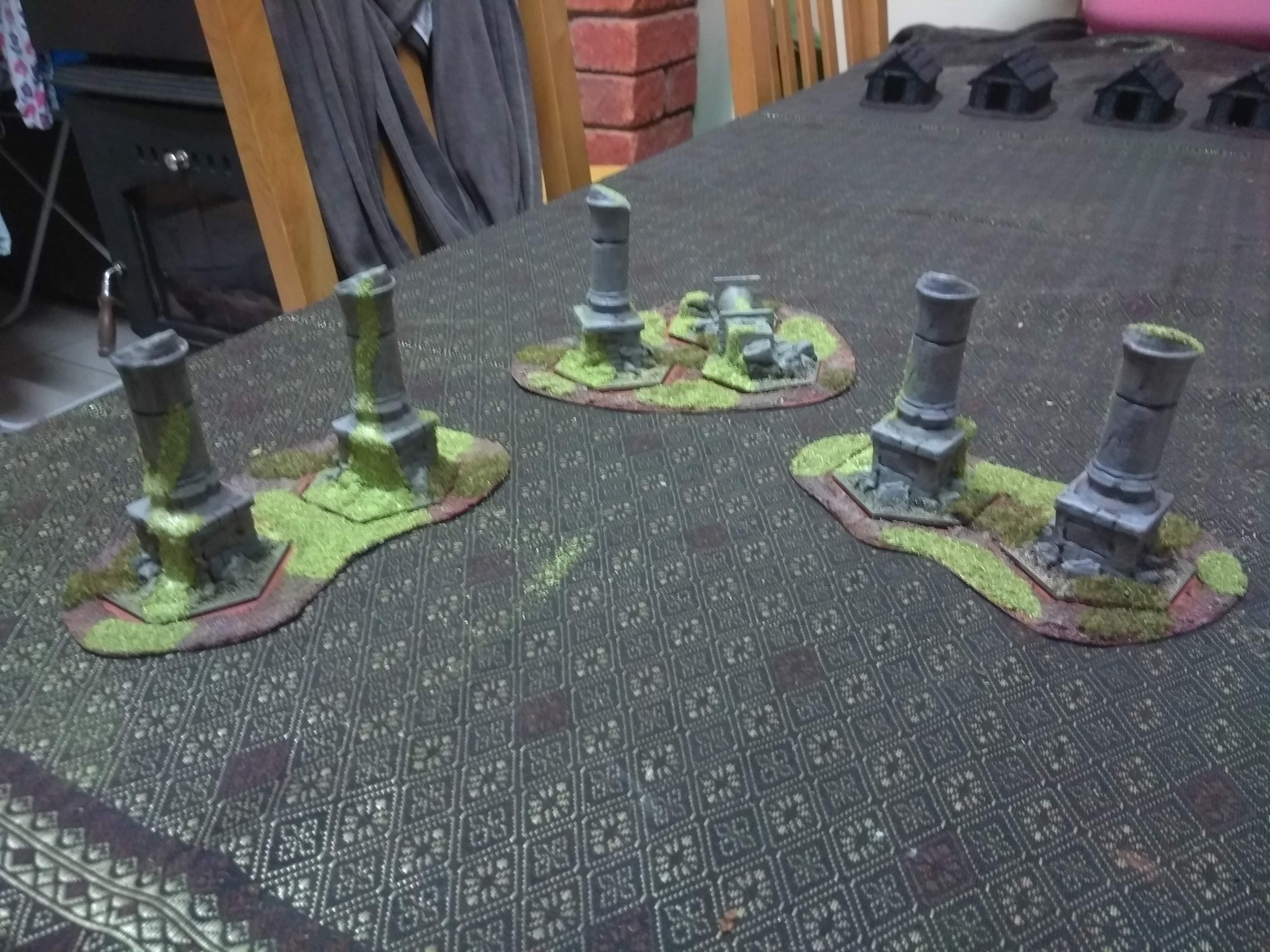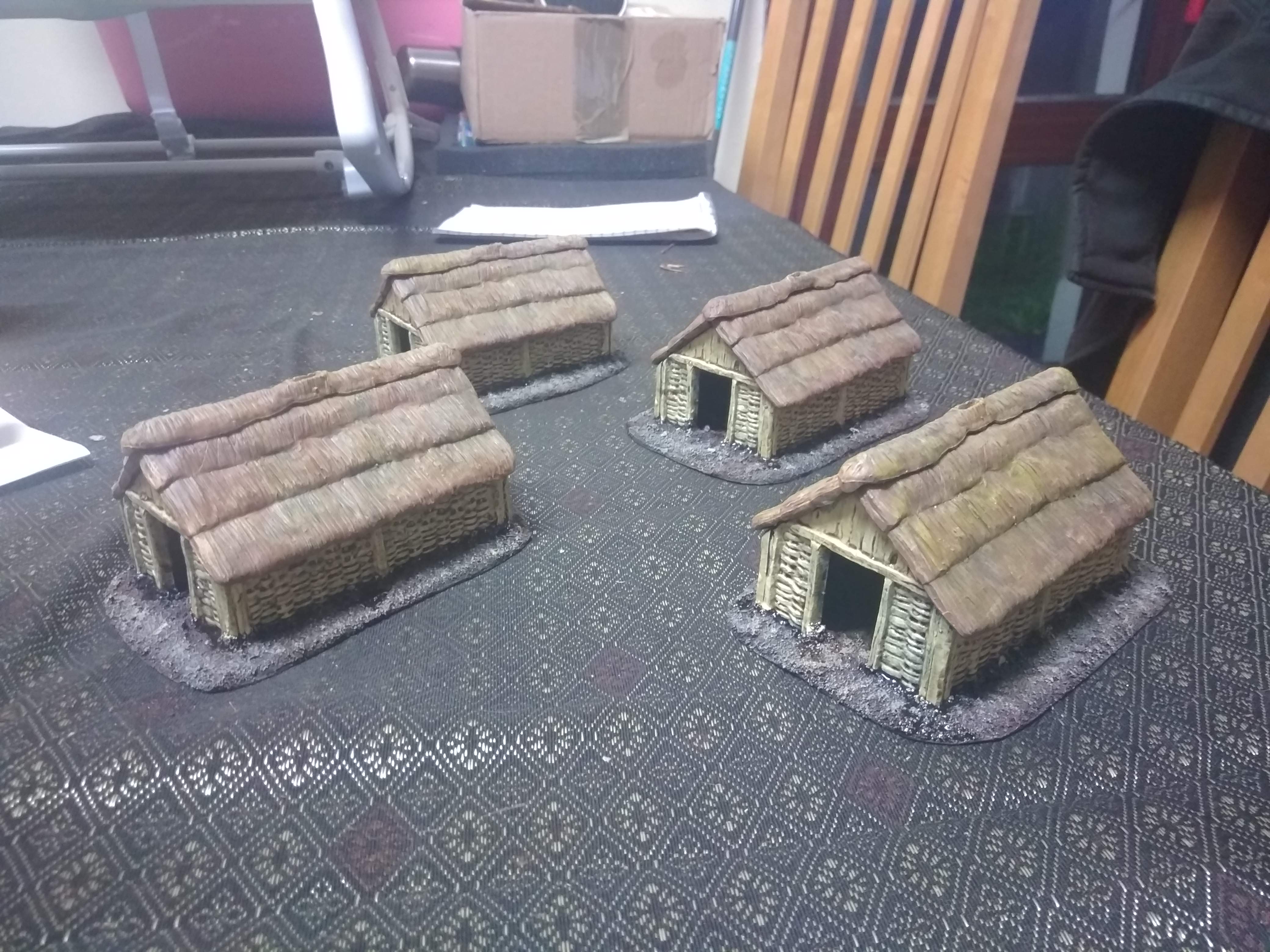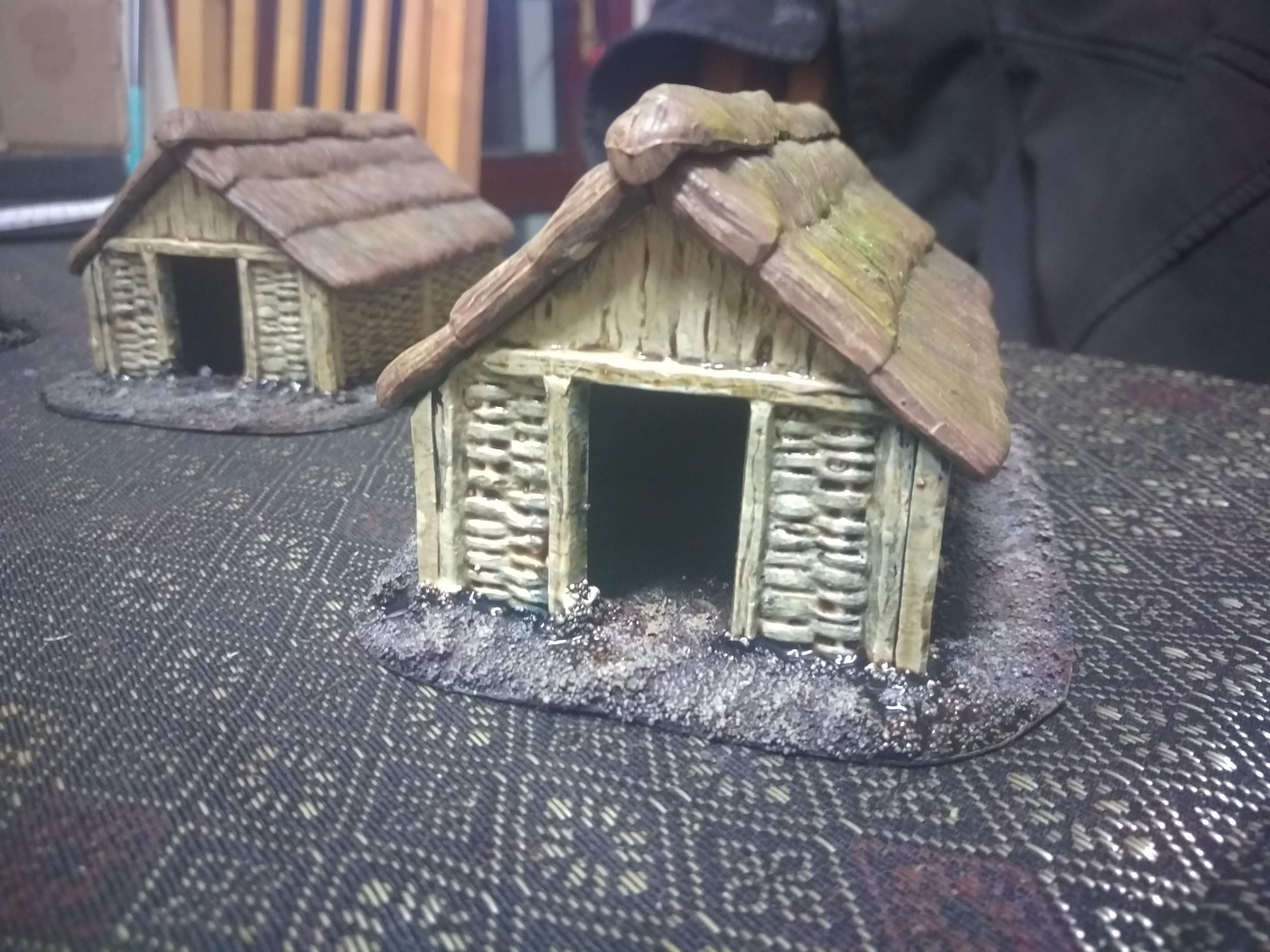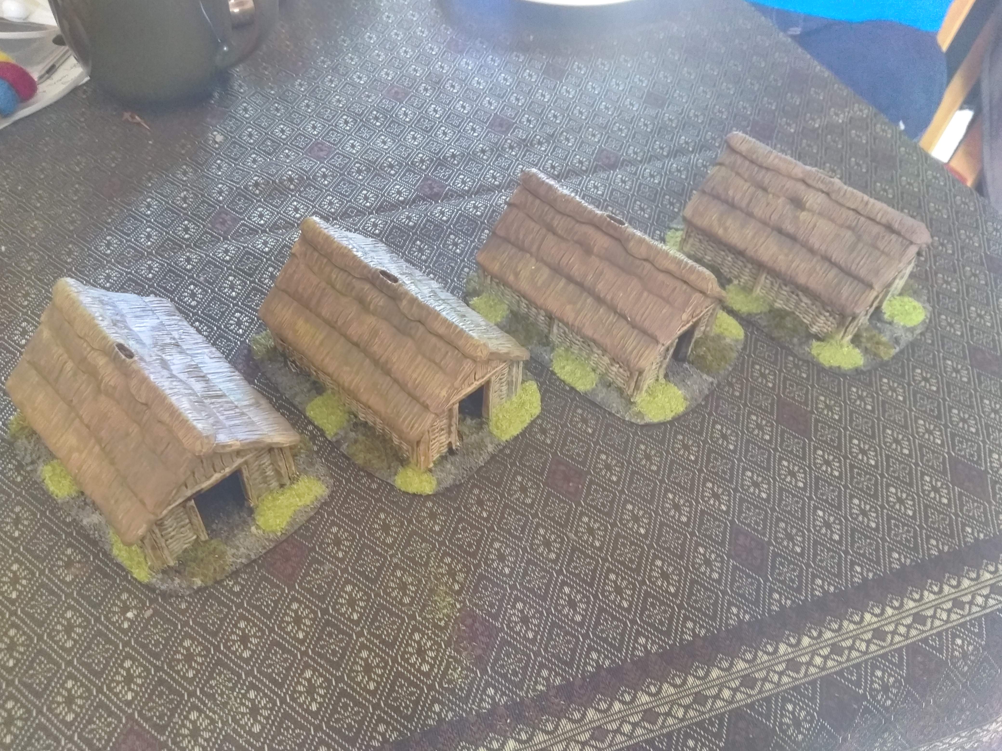 Been working on these today. The thatch has some yellow in it that doesn’t quite show in the photos. Will add grass to the bases tomorrow when the wash on the sides has dried.