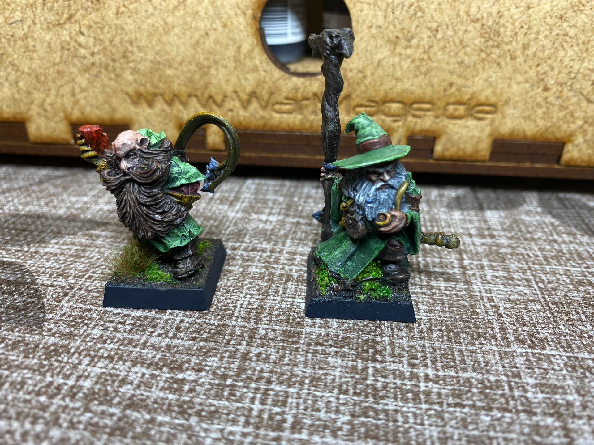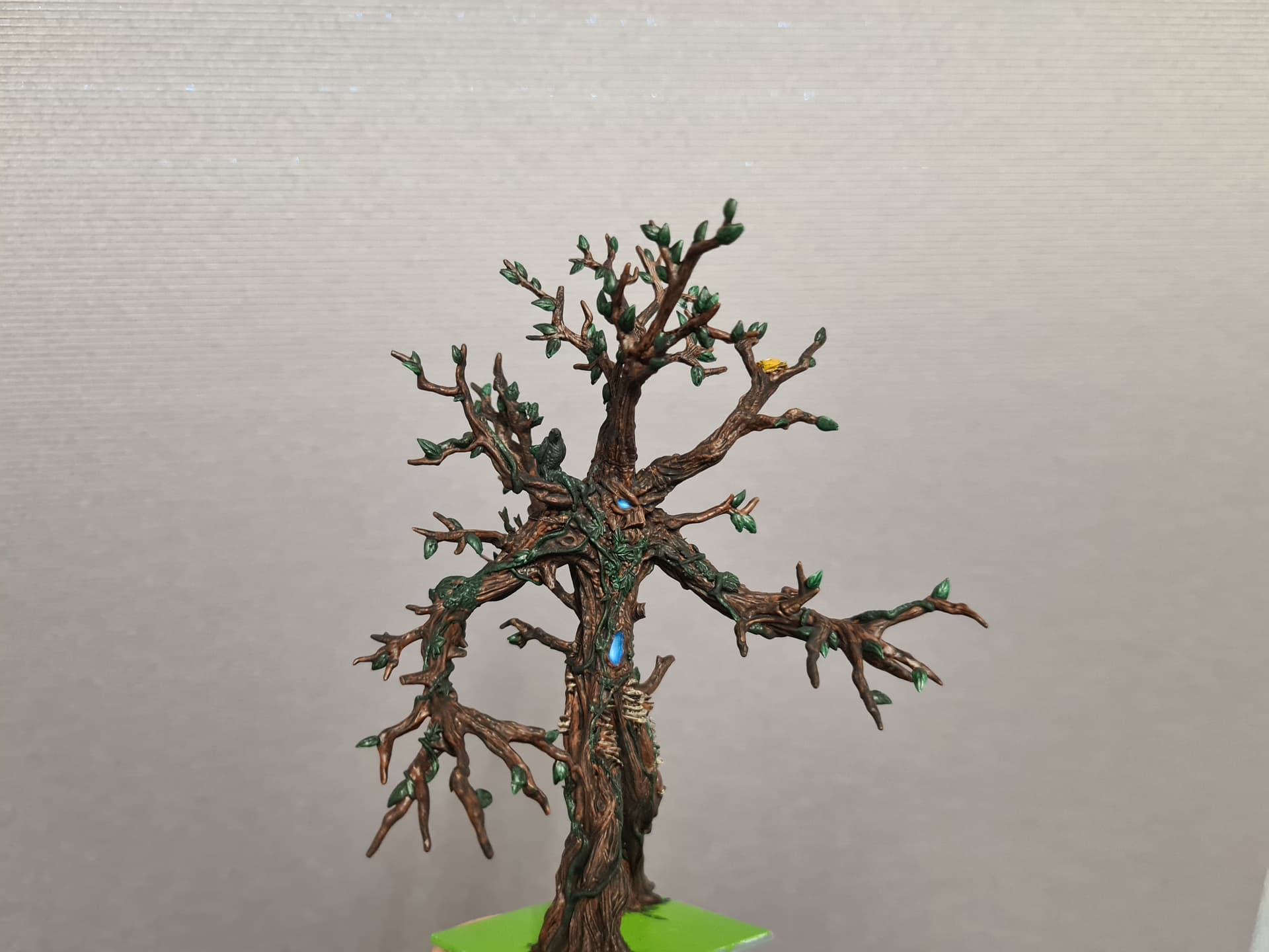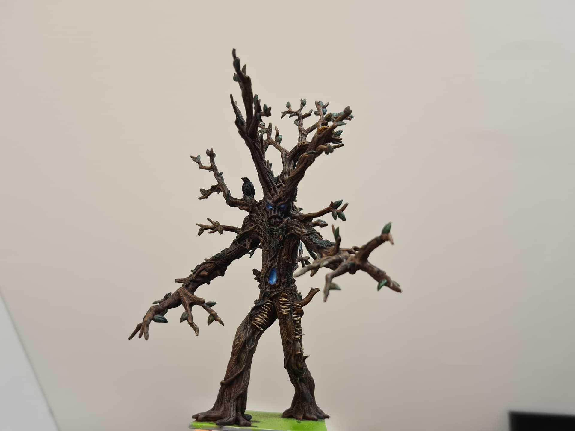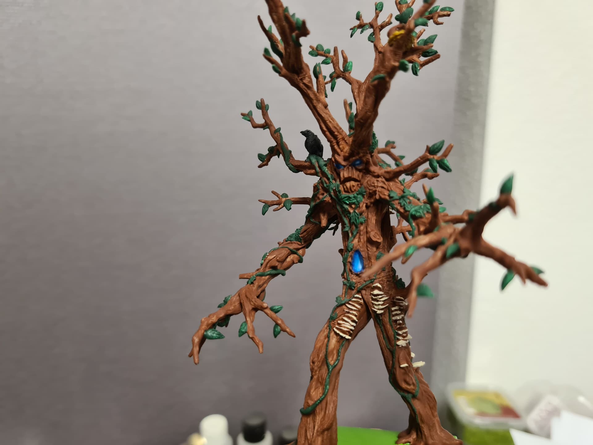 Work continues on the Tree Herder … dark/black washes done and I like how it emphasizes the glowing eyes/heart now … will continue with drybrushing and highlighting, but will try to still keep the central areas around the blue parts very dark to get as much contrast as possible.