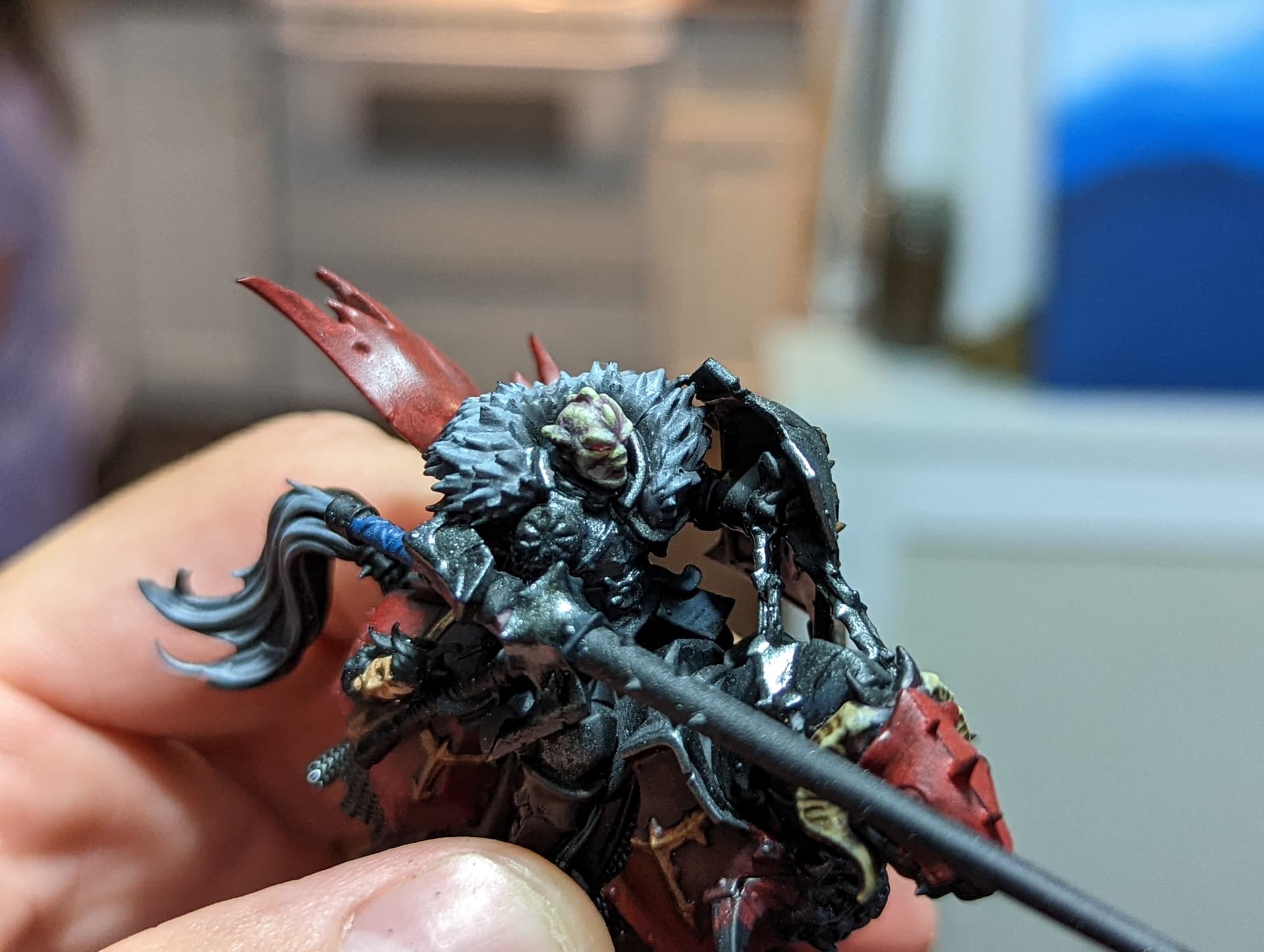 This picture doesn’t show how BIG this dude is - he barely fits on a 40mm! Anyway, almost entirely contrast paint, including the new Gutrippa green, which turned out great once washed with strong tone.