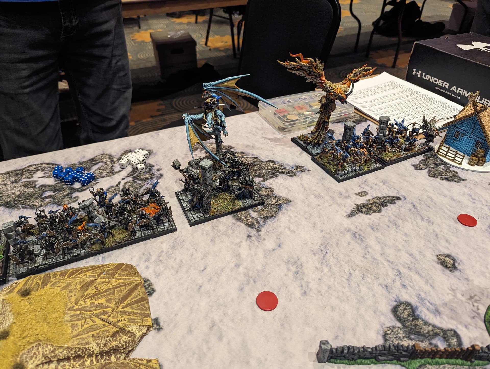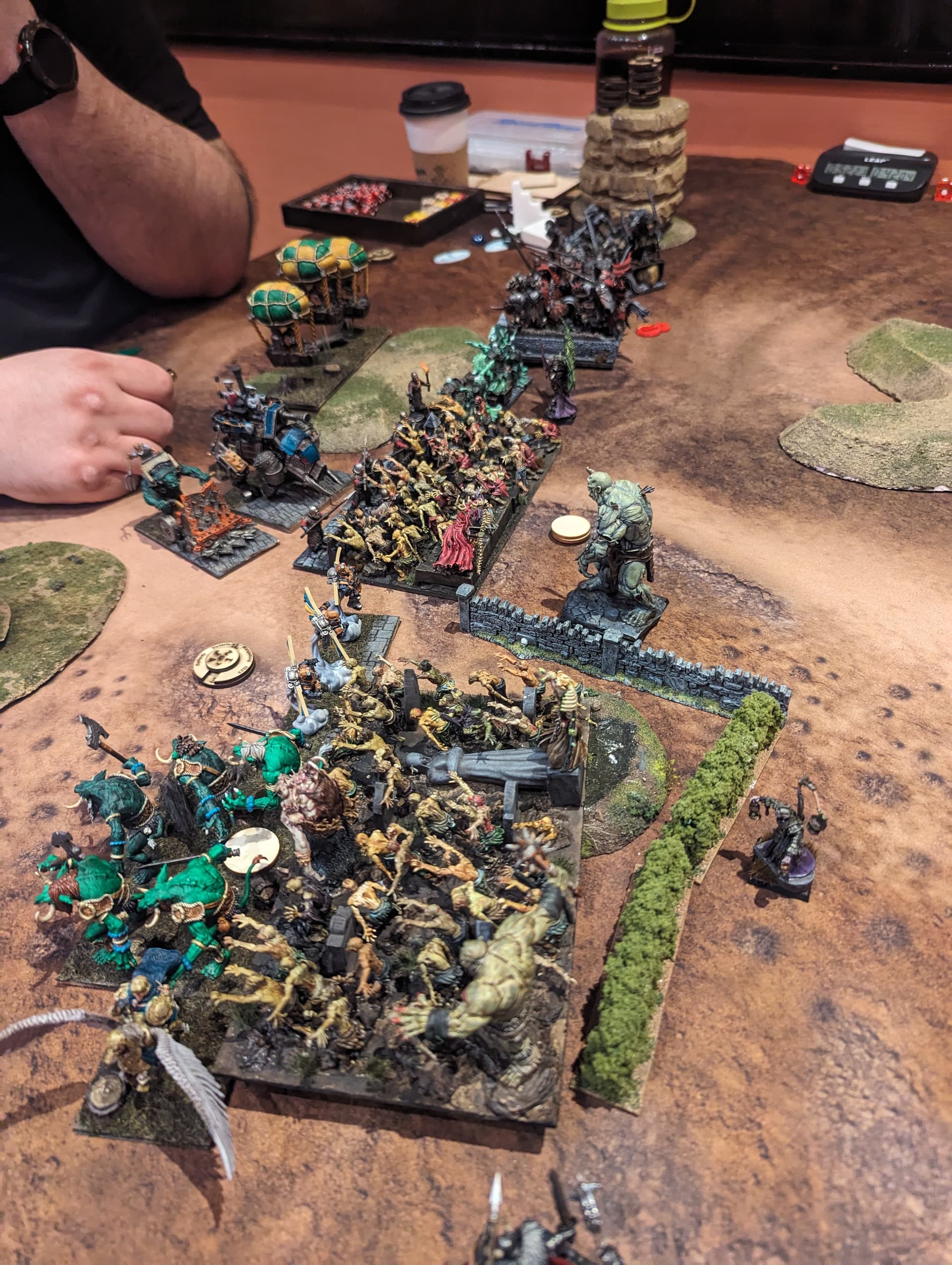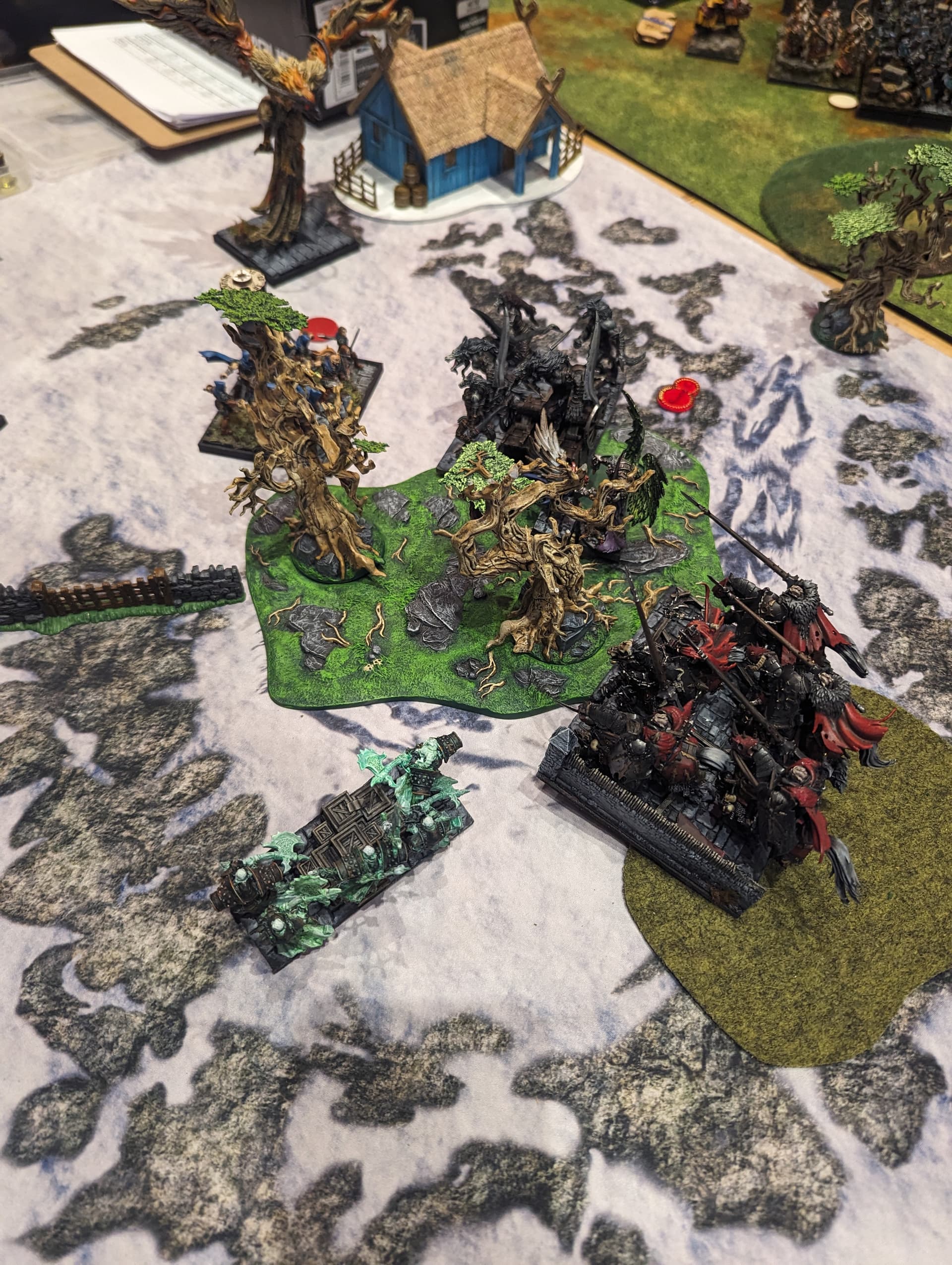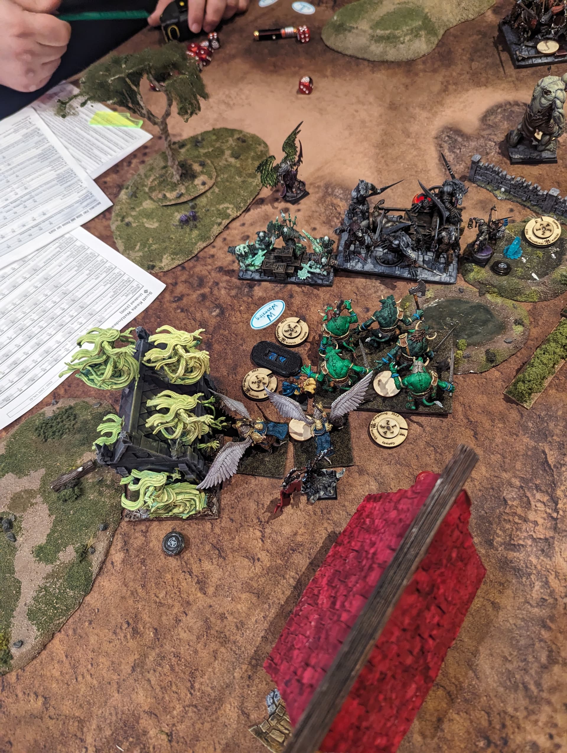 I spread out my line too wide to try to contest all 3 zones. This allowed his Stoneclaw horde and Lord on Large Beast to stall out my Mhorgoth group and kept them out of most of the game. Eric the Bold with Wings of Honeymaze chased Mhorgoth around all game.