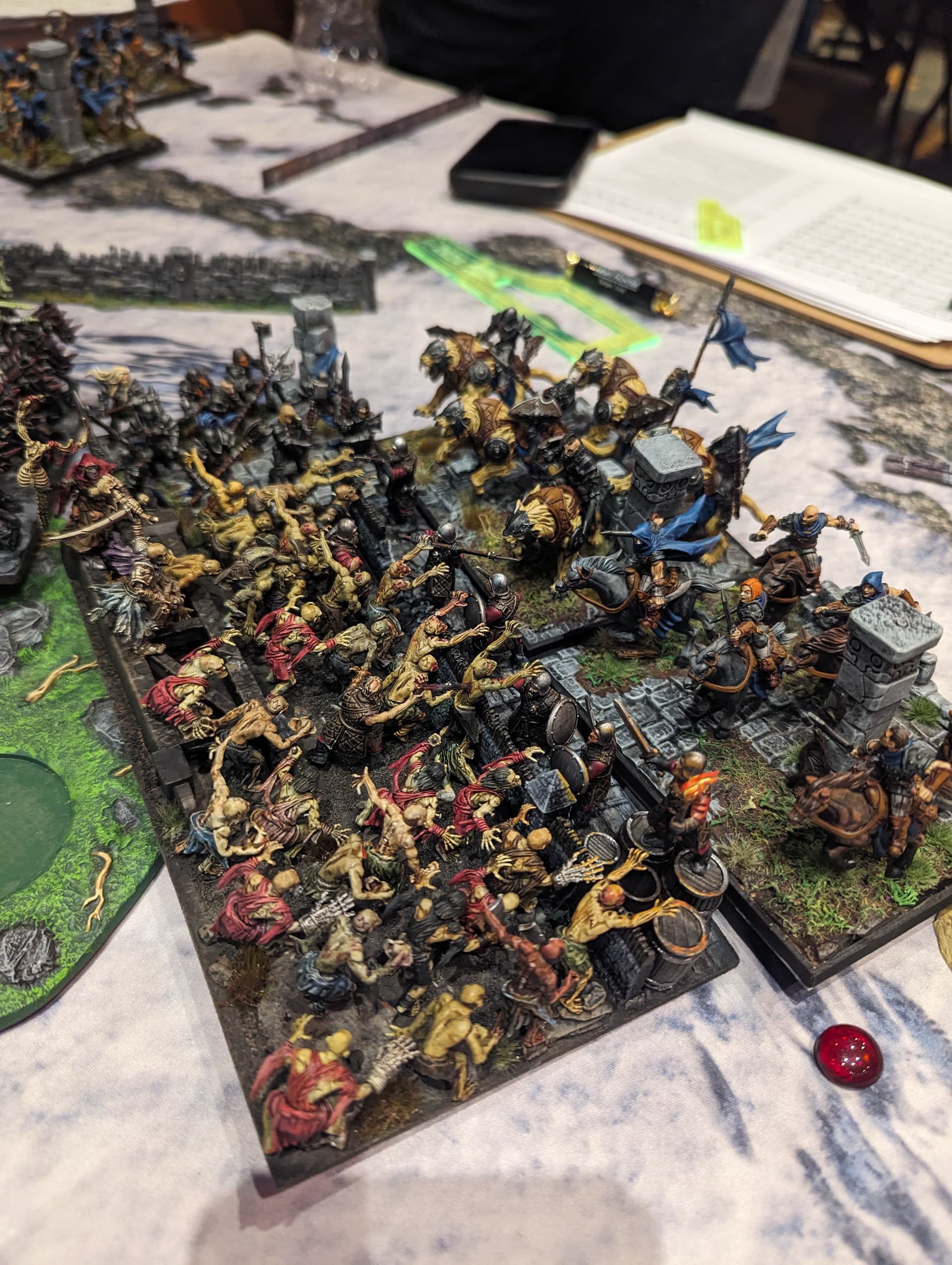 Game 2 saw Undead vs Halflings in Stockpile. Again, the zombie legions backed up by 3 1/2 hammers were really daunting for my opponent and we smashed it up in a really compact part of the board. I was able to repeatedly combo charge his big units like the Heroes of Hoddenberg and take them off without significant reprisals.