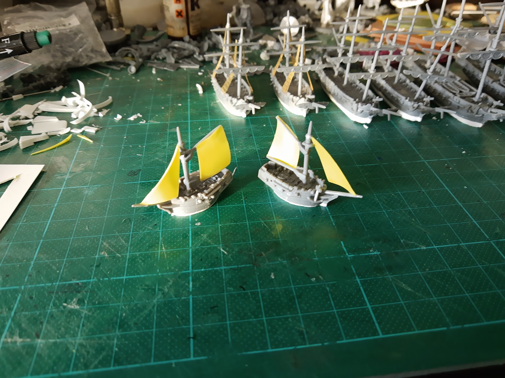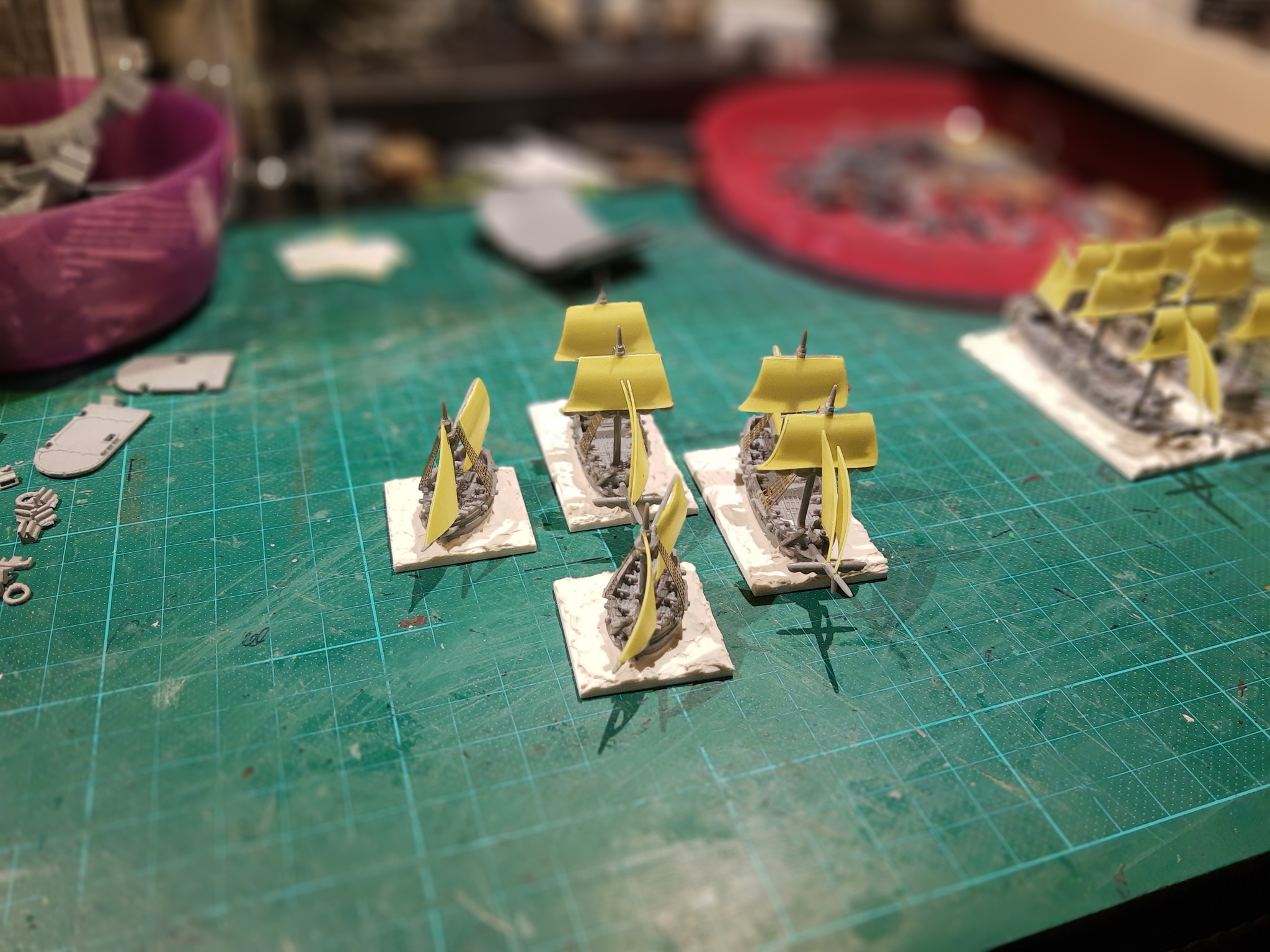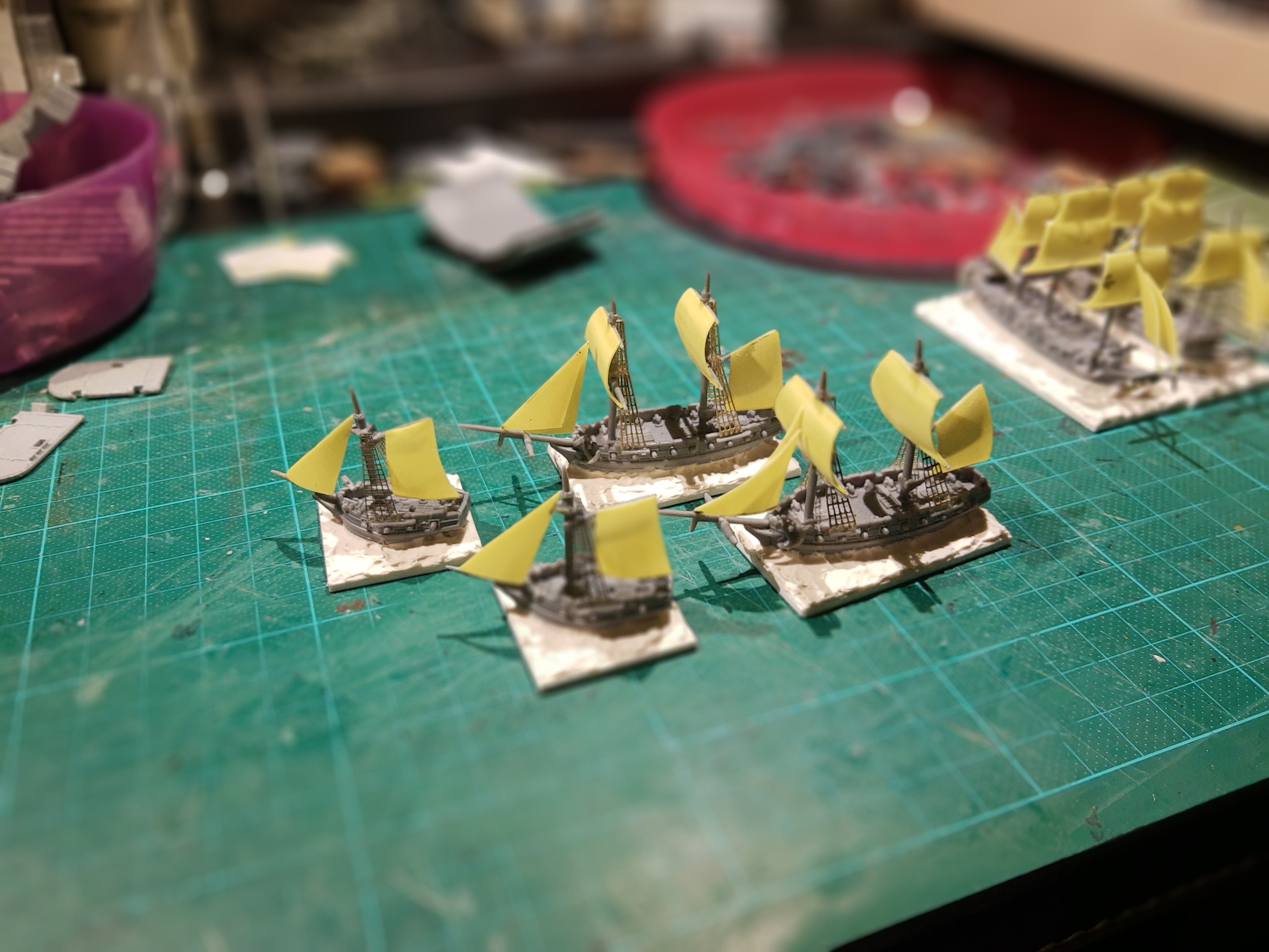 because the Warlord ships are deeper in the water than the Mantic ships, I added plasitc card underneath to add more freeboard and also started experimenting with plastic card for sails (instead of the paper sails coming with the box)