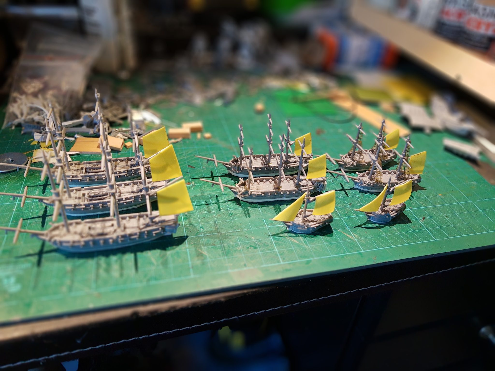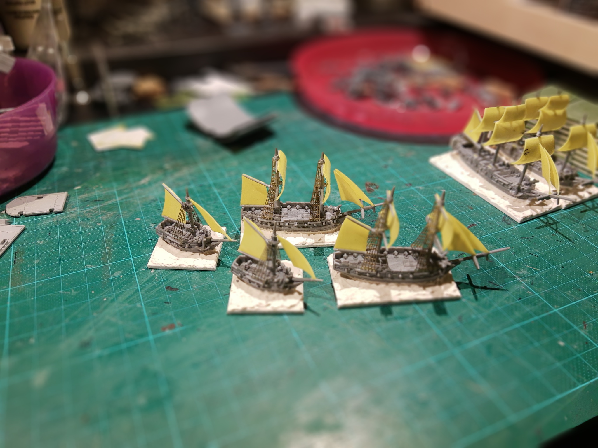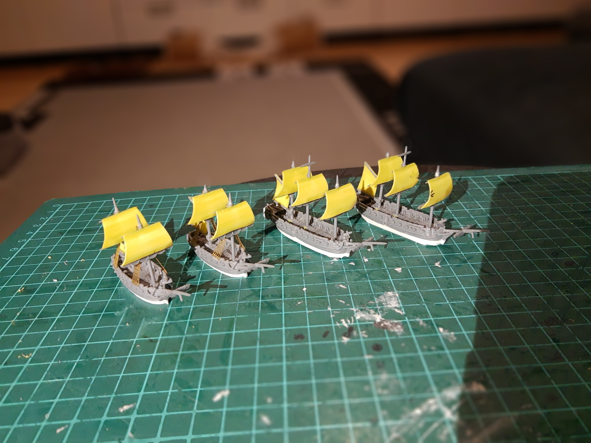 because the Warlord ships are deeper in the water than the Mantic ships, I added plasitc card underneath to add more freeboard and also started experimenting with plastic card for sails (instead of the paper sails coming with the box)