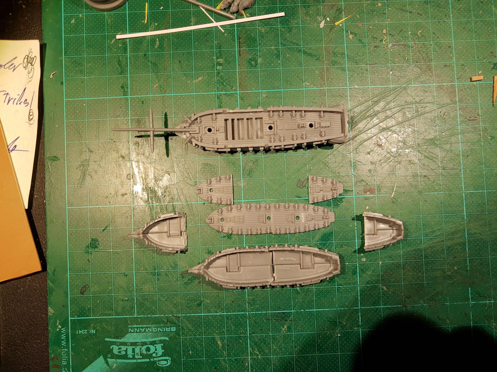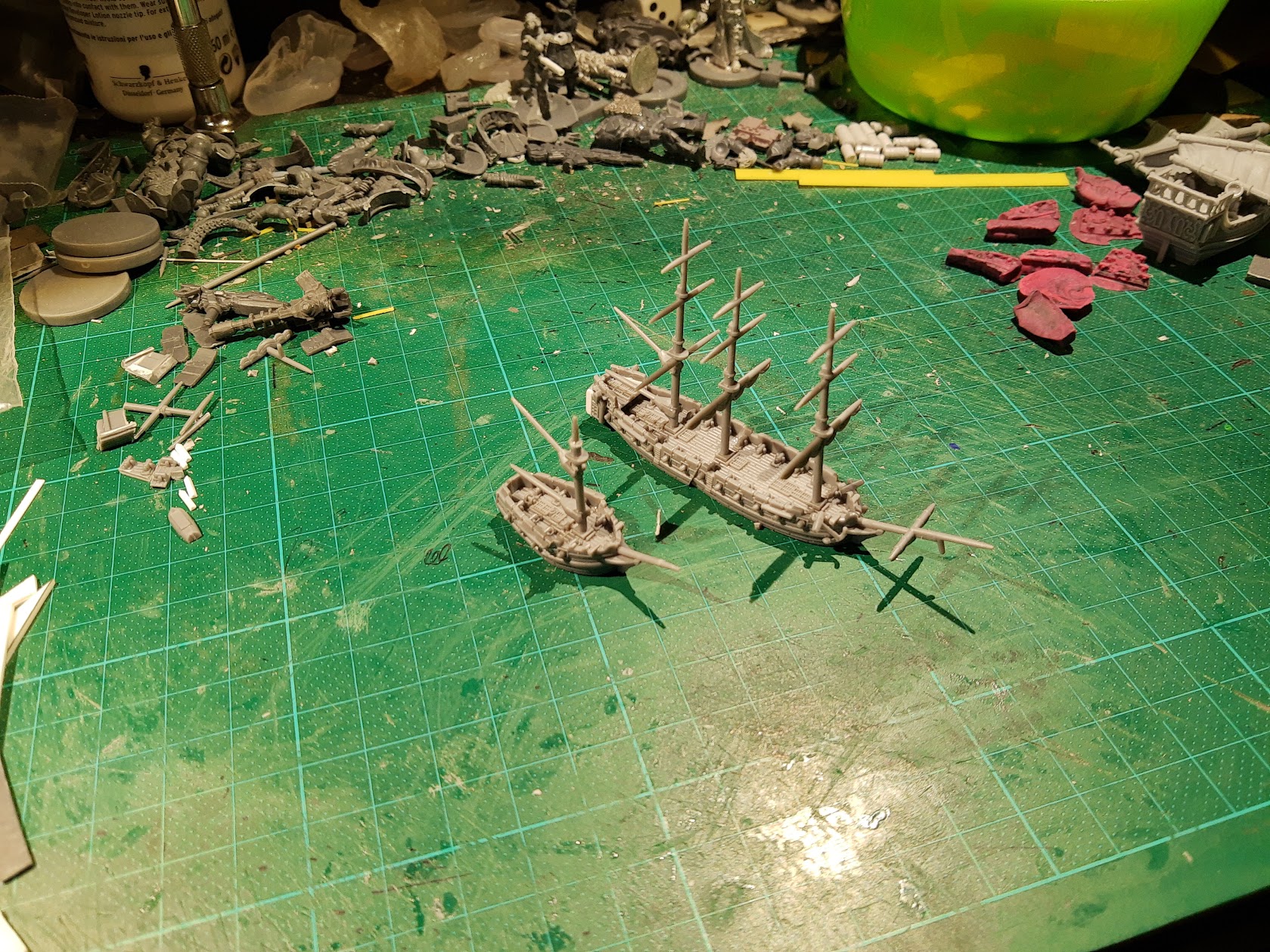 because there are 2 different Frigate sized ships in the list and I have more Brigs than I need I decided to cut off the front of one ship and the back of another to make a larger Brig and a smaller Brig that can be used as tiny ships (1 per Base)