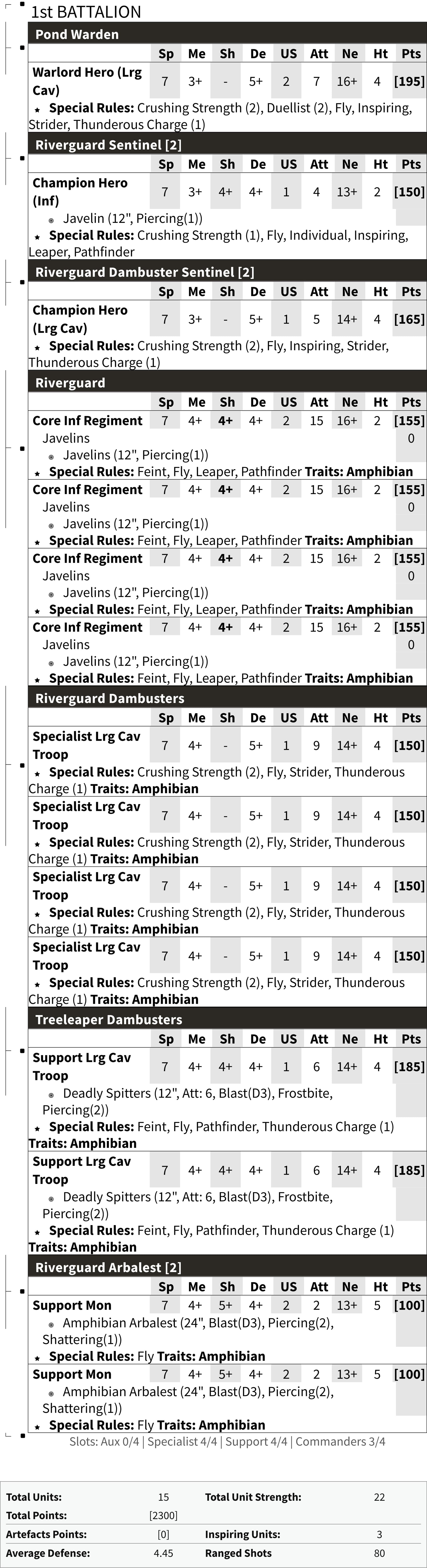 That said, it does look like a fun list to play! Pondwarden is a strong warlord, shooting is still meaningful and punchy even without skewing into it, Riverbusters are scary enough as hammers. And being global Sp 7 fly is a neat thing, with strider where it matters. So color me tempted again ![]()