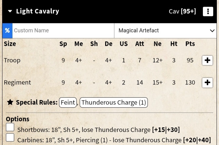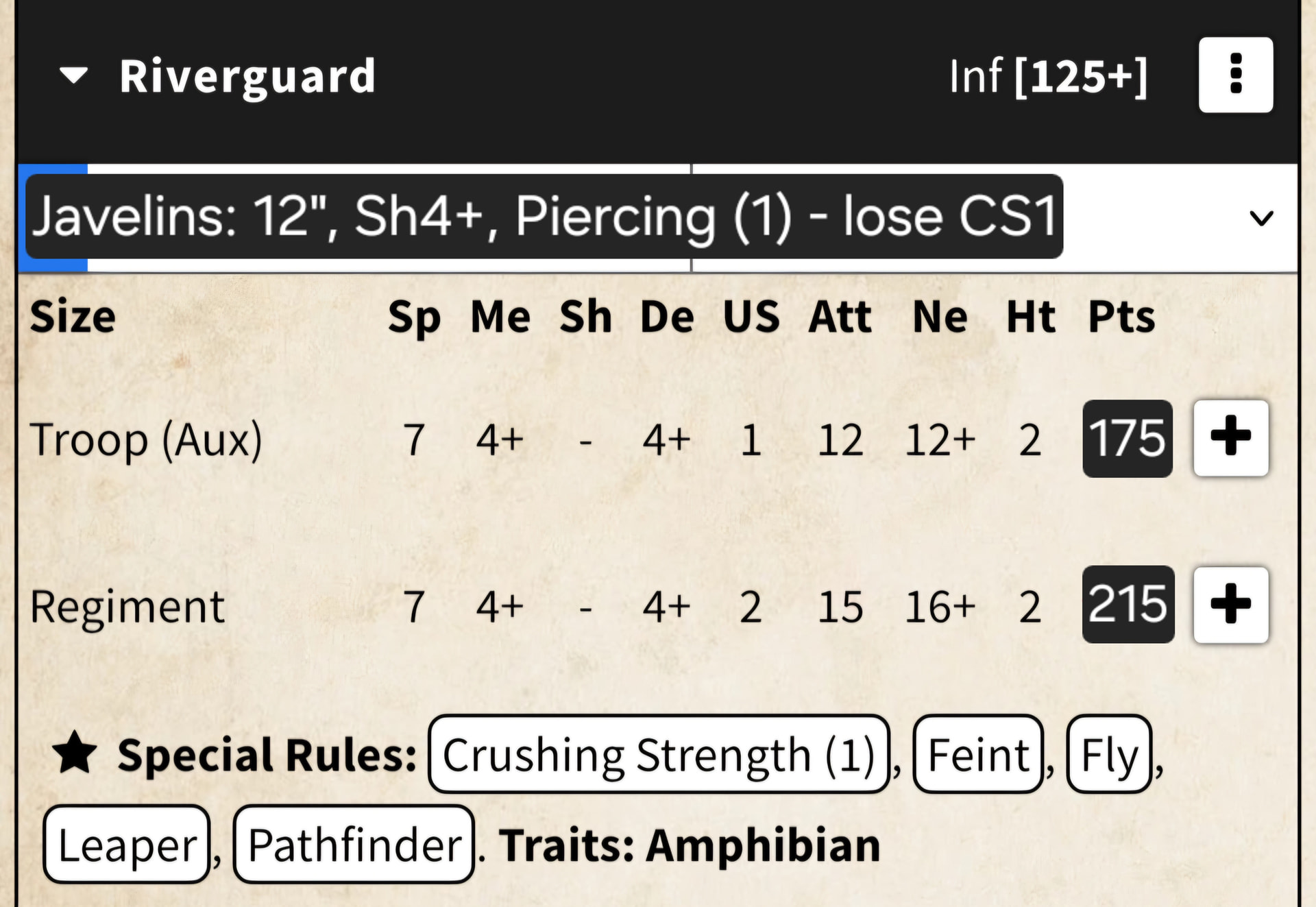I was wondering about the -CS1 thing myself. If CS1 is valued at 10-15 pts for a 15 attack m4 unit with fly (the magic formula values things like CS higher or lower based on a unit’s ability to utilize it such as more attacks, me3, high speed etc.) then the increased cost to the unit to give them a 12” shooting attack is more like 70-75 pts which feels mental. Without looking through the other armies the only other unit that comes close to that penalty are the Lionsnarl cav that lose TC2 to gain shooting attacks.
