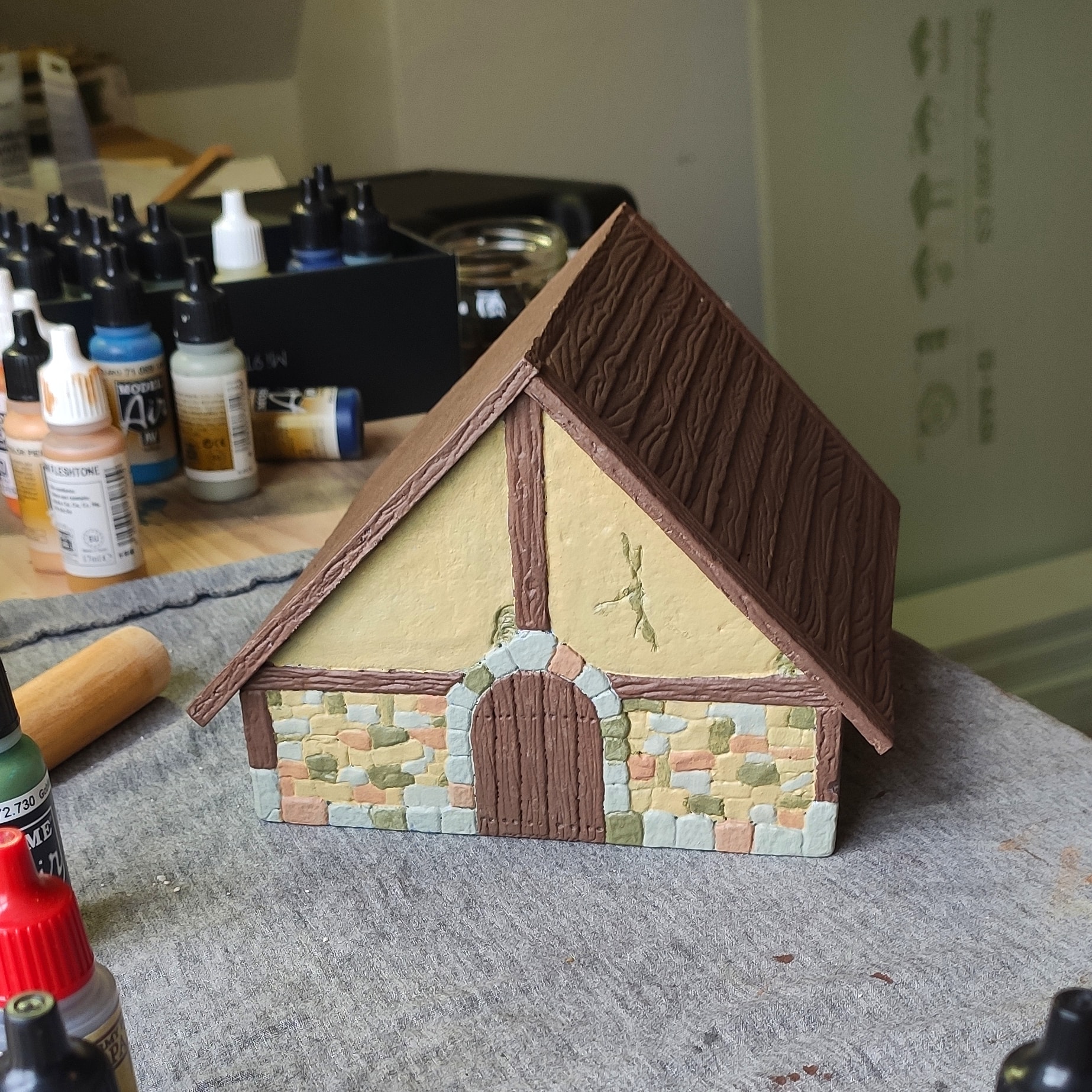 You are absolutely right, i still need to give it. A wash. Usually i give it a primer than i give it a fist coat of paint (like in the photos) , next i do the stone work and paint it with a heavy dry brush layer / or light paint job with a grey to make it blend together. Than i do the wood with some lighter browns an some moss looking greens. Than i do a wash. And than comes the real dry brush and finer details. (I’m not great at explaining things in English).